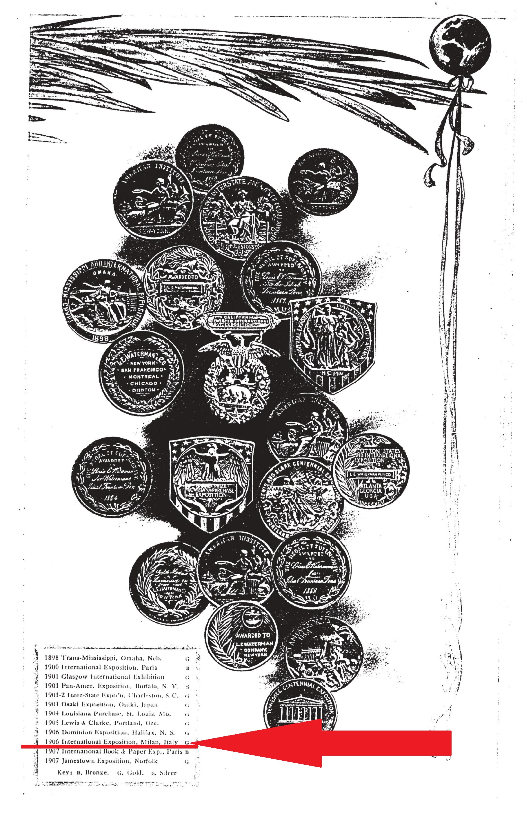 Come risulta dal Catalogo Waterman del 1908, all’Expo milanese del 1906 il Produttore vinse la “medaglia d’oro” per la qualità dei suoi prodotti.