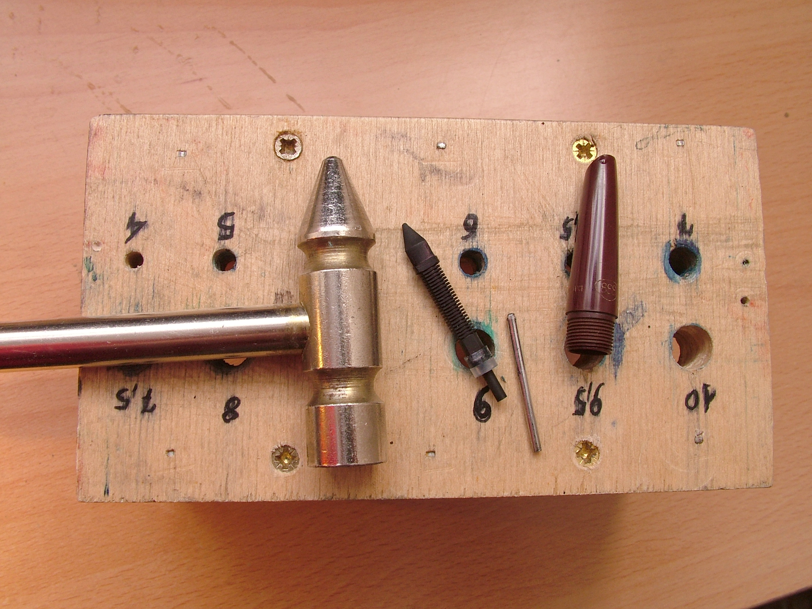 La sezione in un foro deve arrivare a circa metà, poi con un ferro un po più piccolo del foro ( va bene quello delle grucce in metallo per le camicie) si batte su con un martelletto al centro del foro dove si infila la cartuccia.