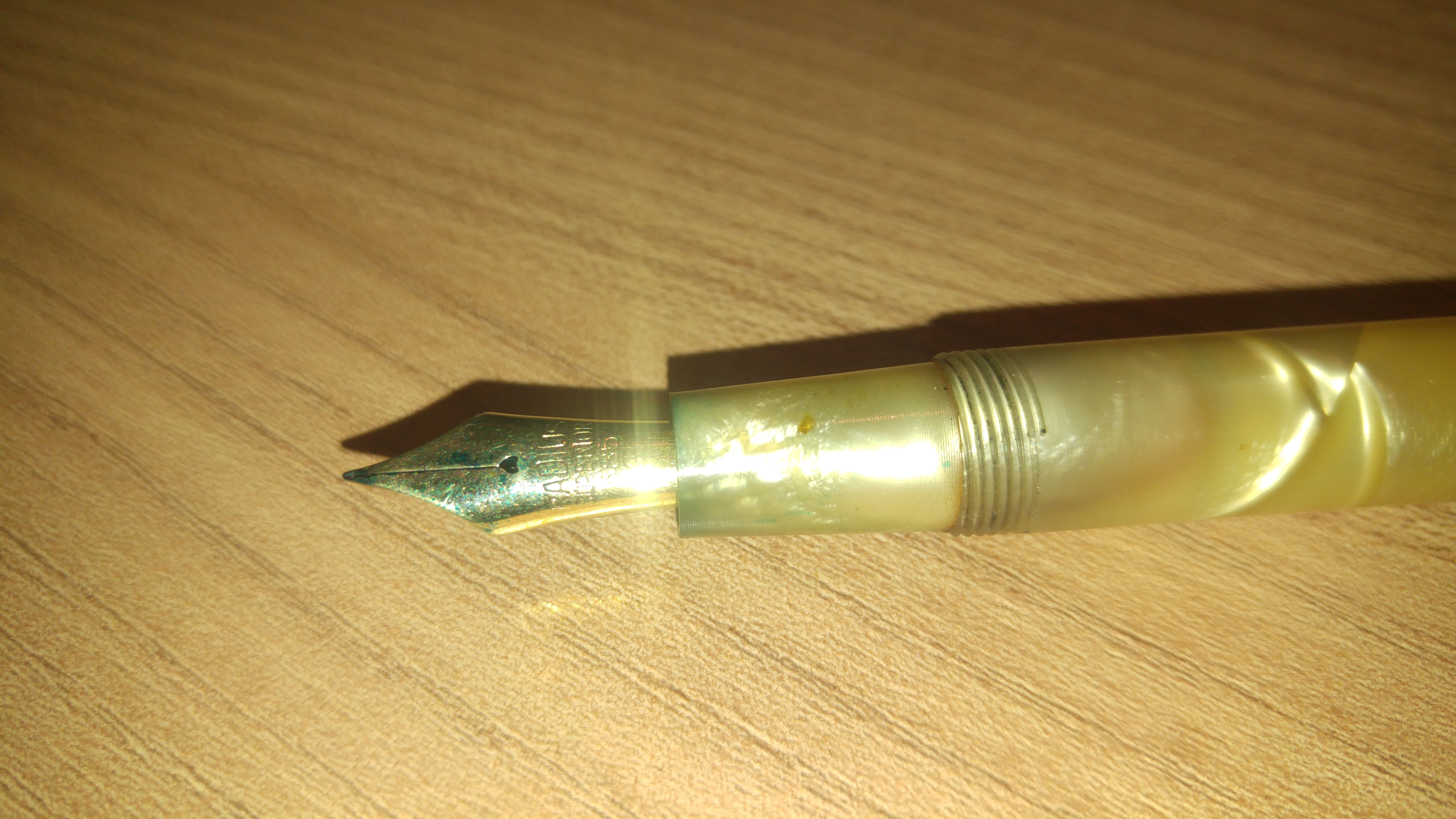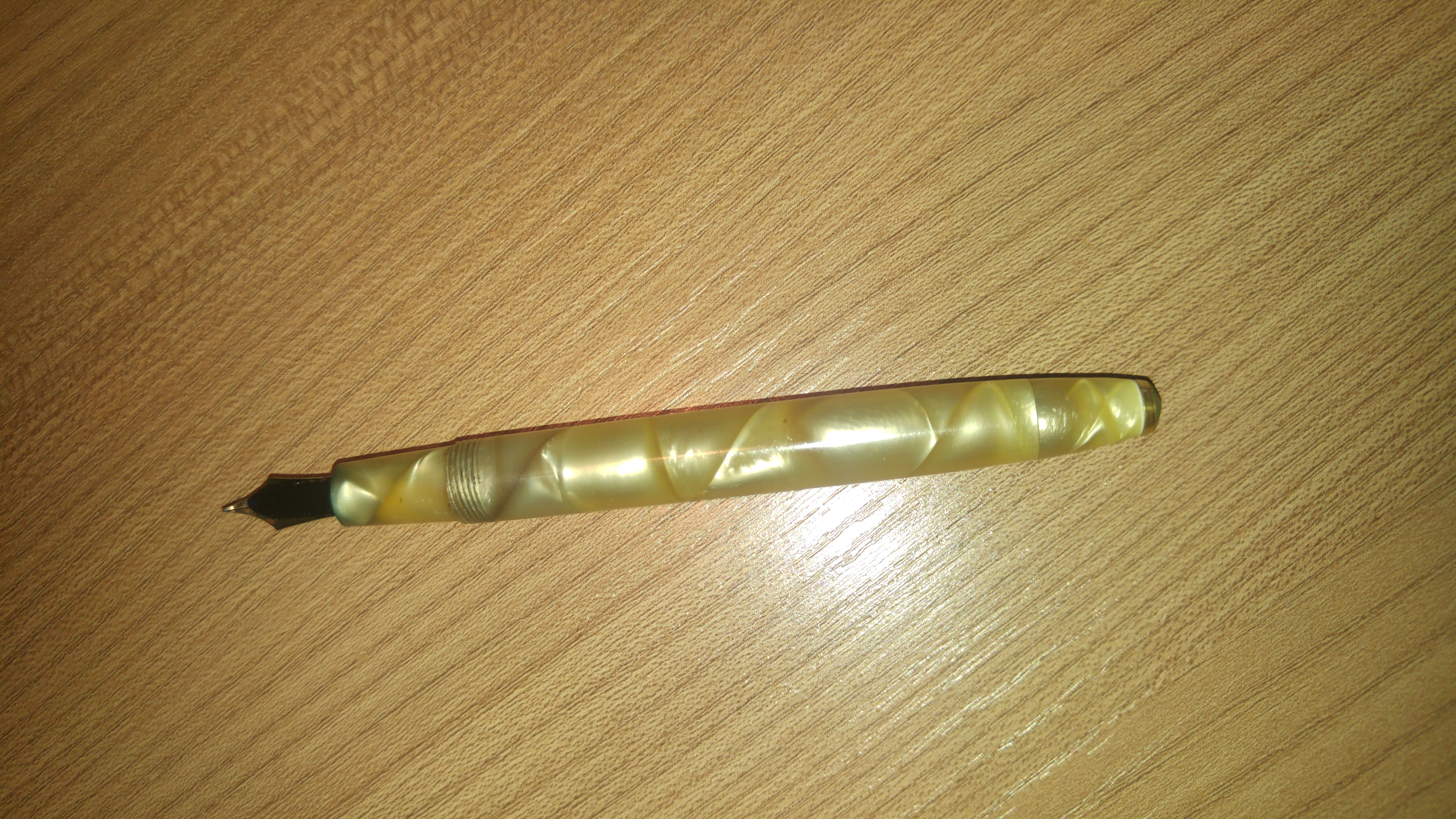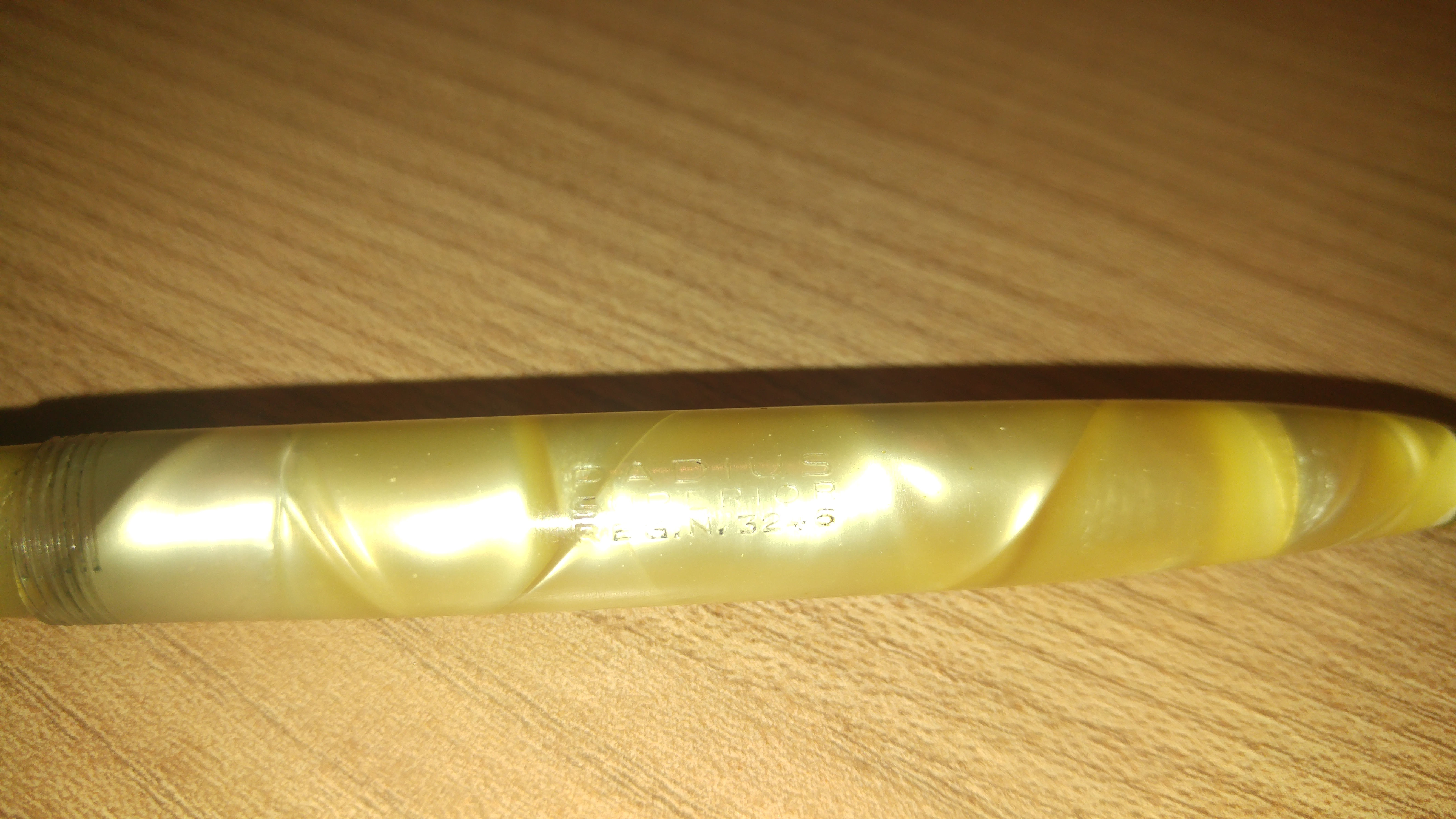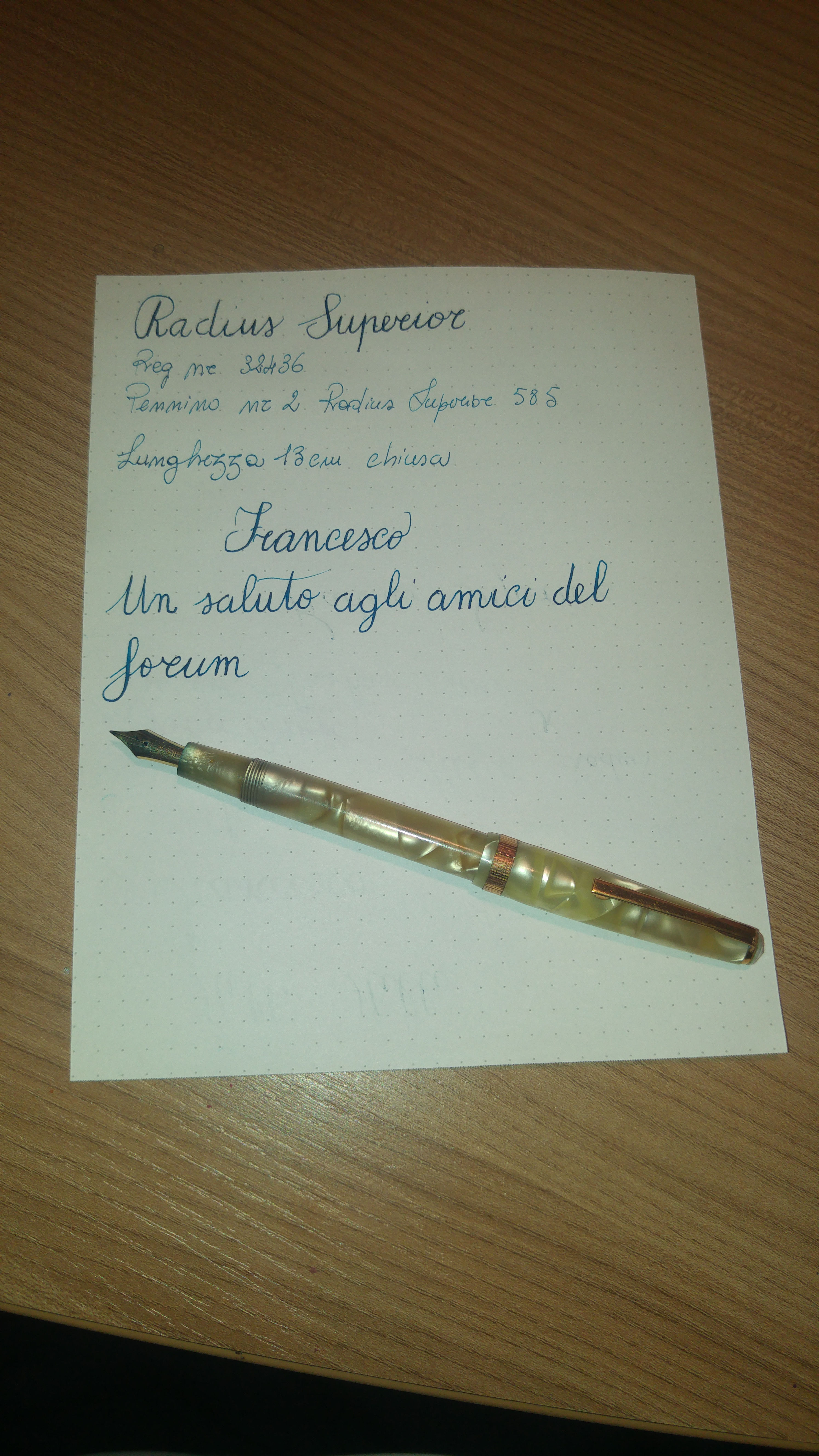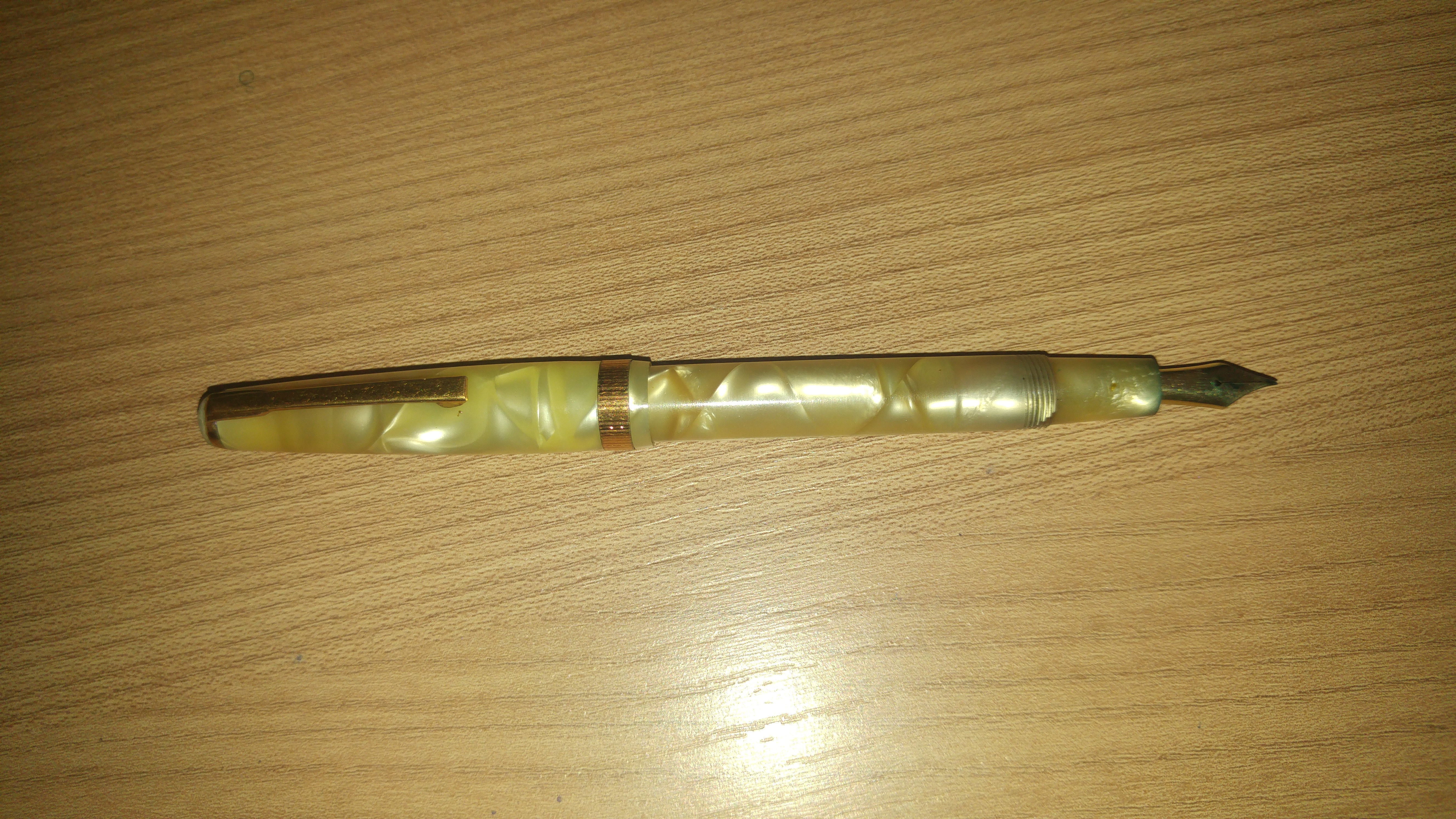 Ho trovato questo splendore con pennino rotto, che ho prontamente sostituito con uno NOS, preso on-line, marcato Radius Superior 585 nr. 2. Purtroppo ho l'impressione che non sia tanto flex, forse perché è nuovo e necessita di un po' di rodaggio.