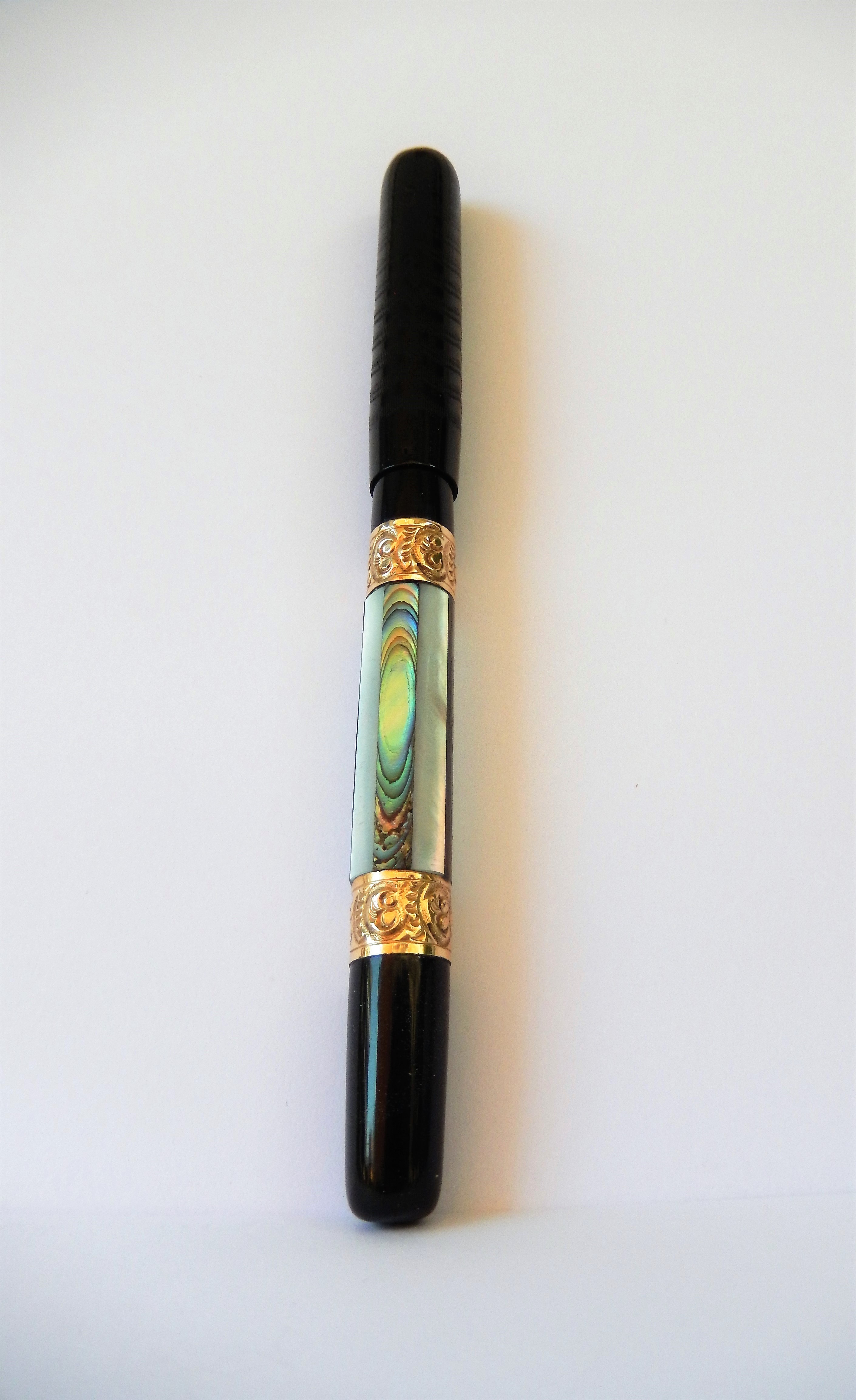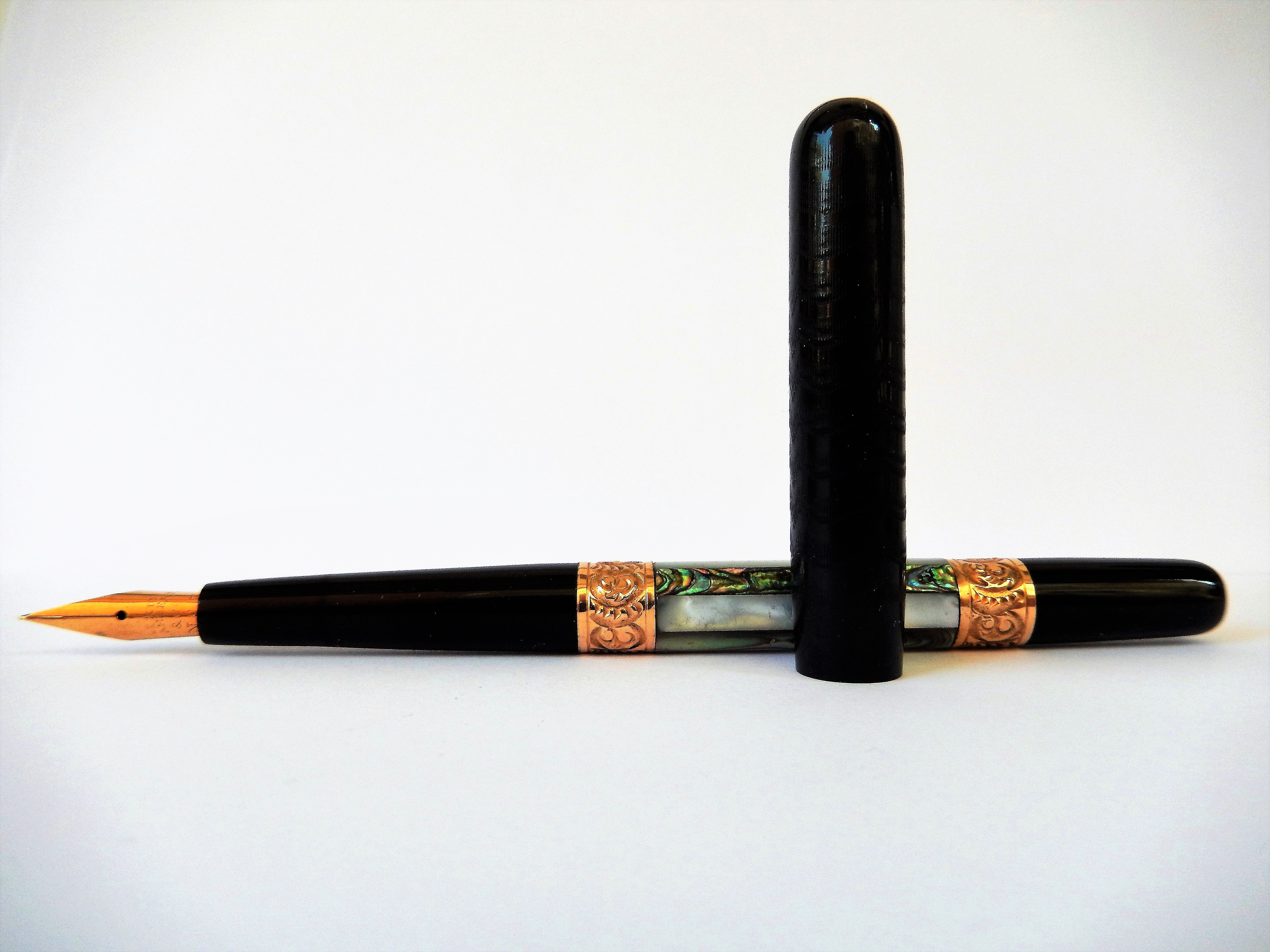 La penna in presentazione, in ebanite nera,oro e madreperla, è lunga chiusa 15,2 cm e 17,3 con il cappuccio calzato. Malgrado le dimensioni importanti e le decorazioni ornamentali è, con i suoi 13,8 gr., estremamente leggera e maneggevole. Caricata con l'ausilio di una siringa si è " bevuta" circa 4 ml di inchiostro.