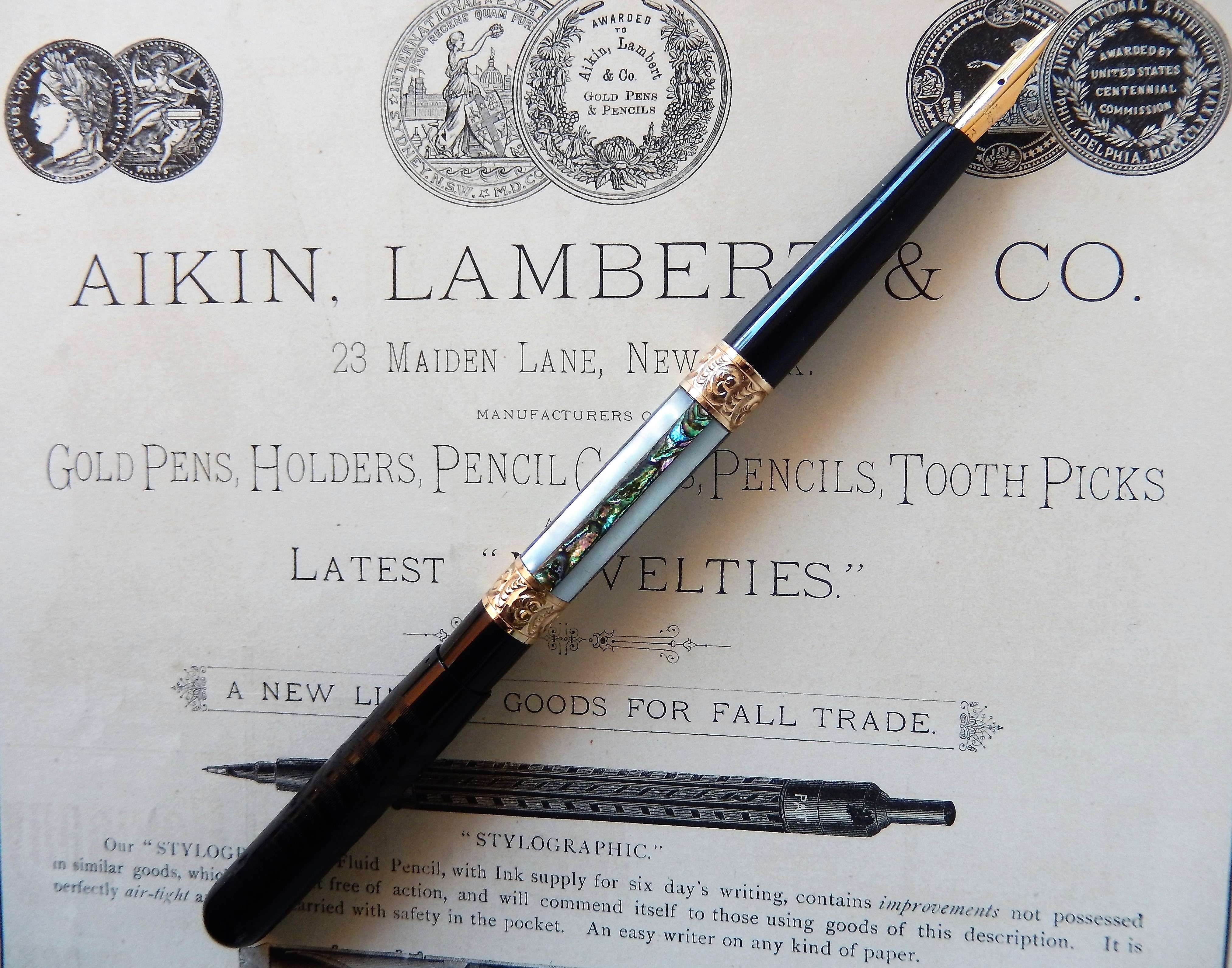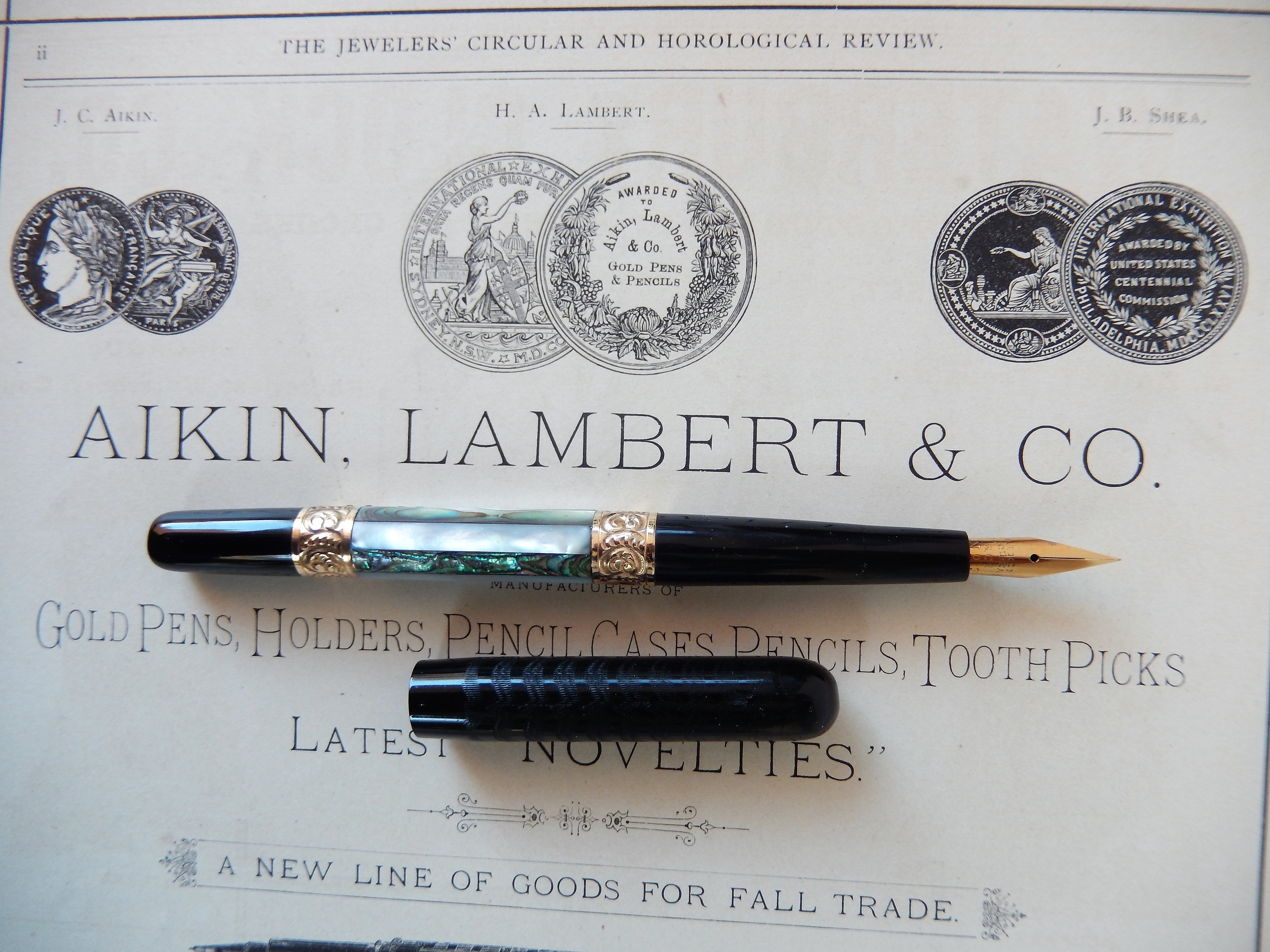 All'inizio del 1900 molte stilografiche, specie se ricoperte, non esibivano altri marchi se non quello sul pennino e dunque l'attribuzione a questa o quella casa rimane spesso alquanto aleatoria. In questa penna il pennino dice " Aikin, Lambert & Co" e anche alimentatore e sezione sembrano compatibili con la produzione della storica casa americana, ma la prudenza è d'obbligo e comunque, al di là di ogni tentativo di possibile identificazione o discussa attribuzione, io questa penna la volli per il suo fantastico pennino, questo indiscutibilmente Aikin Lambert, e per le incredibili iridescenze della madreperla, degne veramente dei colori di una antica cattedrale gotica.