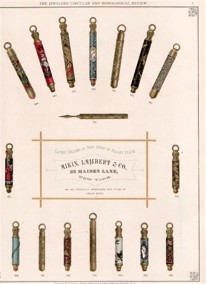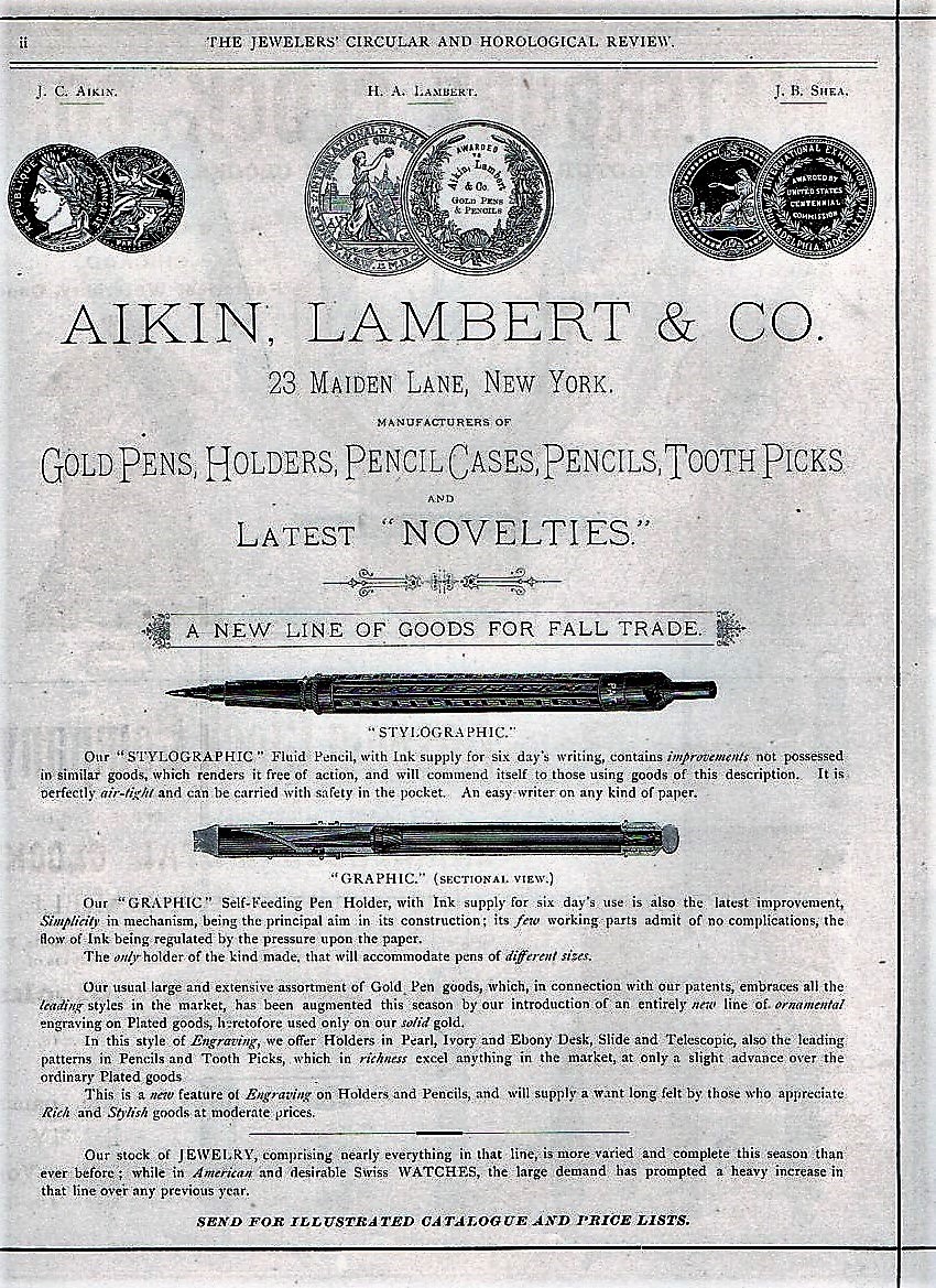 La nuova società si distinse ben presto per l'elevato livello dei suoi prodotti, che la collocarono nella fascia più alta del mercato e le immagini tratte dal " TheJewelers Circular and Horological Review " del 1881, di mia proprietà e dunque se utili a disposizione del wiki, mostrano alcuni gioielli di gran qualità, ispirati ancora ad una eleganza classicheggiante. Da notare che l'indirizzo è indicato in Maiden Lane 23 ( prima del 1880 era al n. 12, dall'altra parte della strada, mentre dal 1890 circa l'indirizzo viene indicato in Maiden Lane 19). Da notare anche le medaglie attestanti la partecipazione ed i premi ricevuti alla Esposizione di Philadelphia del 1876, a quella di Parigi del 1878 ed alla Sydney International Expò del 1879,la prima fiera mondiale svoltasi nell'emisfero australe. Sopra le medaglie, a fianco dei nomi di J.C. Aikin e di H.A. Lambert appare quello di J.B.Shea, che fu vicepresidente della società. Erano gli anni d'oro della " Aikin, Lambert & Co " e circa a quel periodo è riferibile questa mia cannuccia a scorrimento per la regolazione del pennino, marcata anche sul fusto. Nei primi del novecento la società distribuiva anche prodotti Wirt e sopratutto già da alcuni anni forniva pennini e matite meccaniche alla Waterman, che intorno al 1906 cominciò una progressiva acquisizione dell' Aikin Lambert. Inizialmente la Waterman lasciò James Cornelius Aikin come presidente, per poi nel 1911, secondo le ricerche di David Nishimura, acquisirne la proprietà totale e mettere nei posti di comando uomini di propria fiducia, cosicché la Aikin Lambert divenne una società controllata pur continuando a produrre con marchio autonomo ottime penne ( penso ad esempio alle Mercantile) fino al 1930, per poi degradare e sparire. Pare lecito pensare che l'acquisizione del controllo Waterman nel 1911 sia stata accelerata dalla morte di J.C.Aikin, scomparso a New York il 10 Marzo di quell'anno.