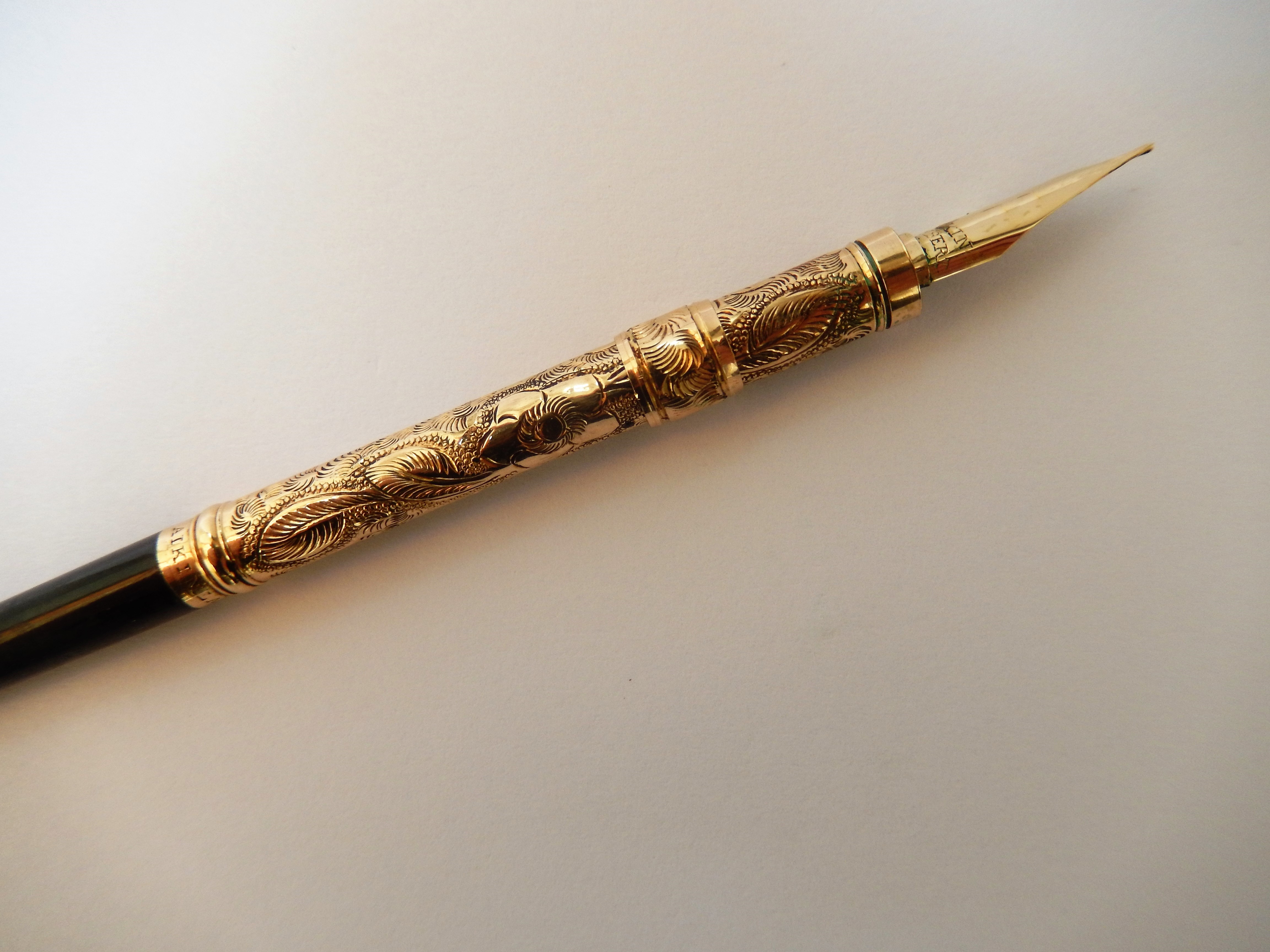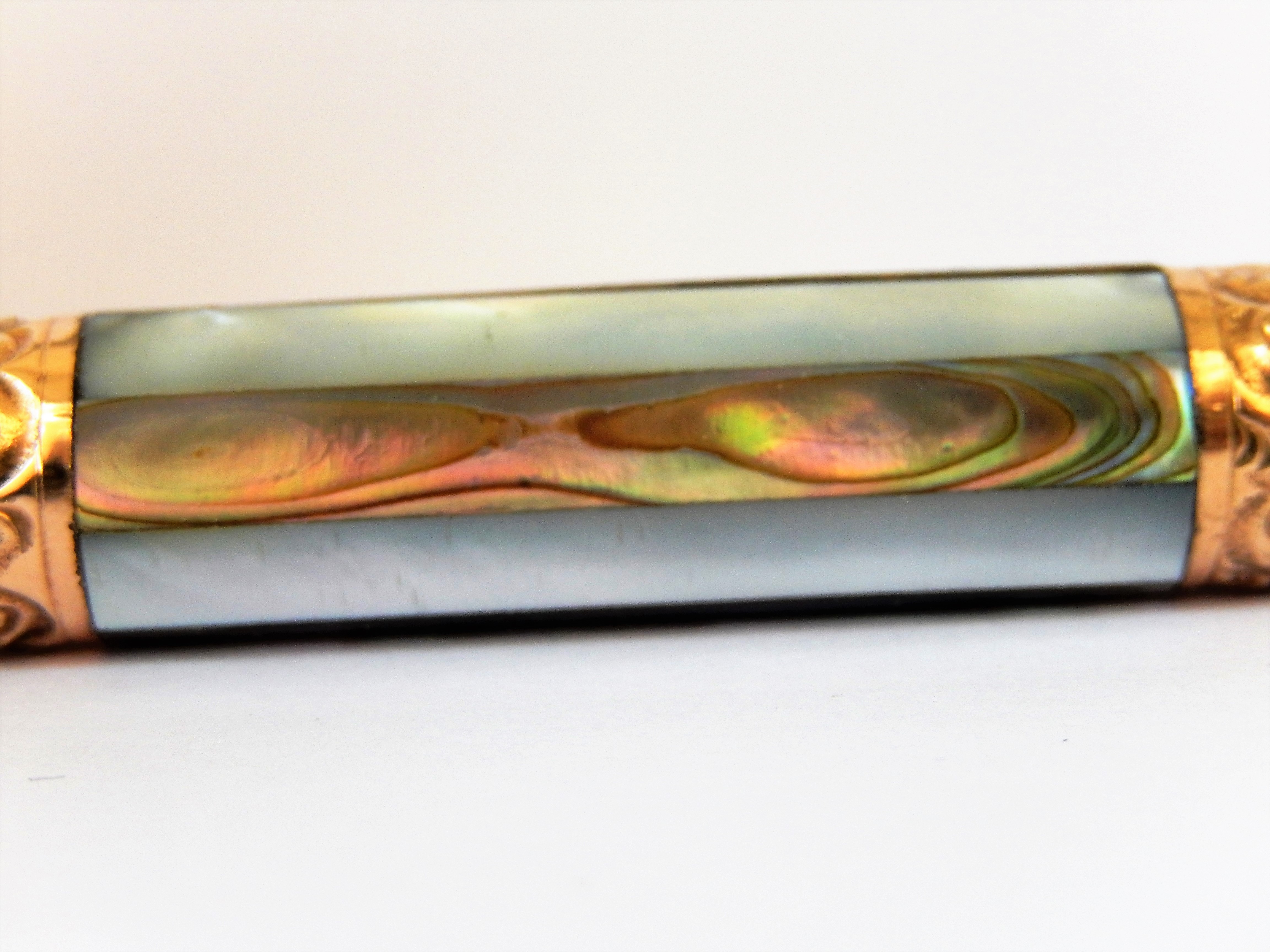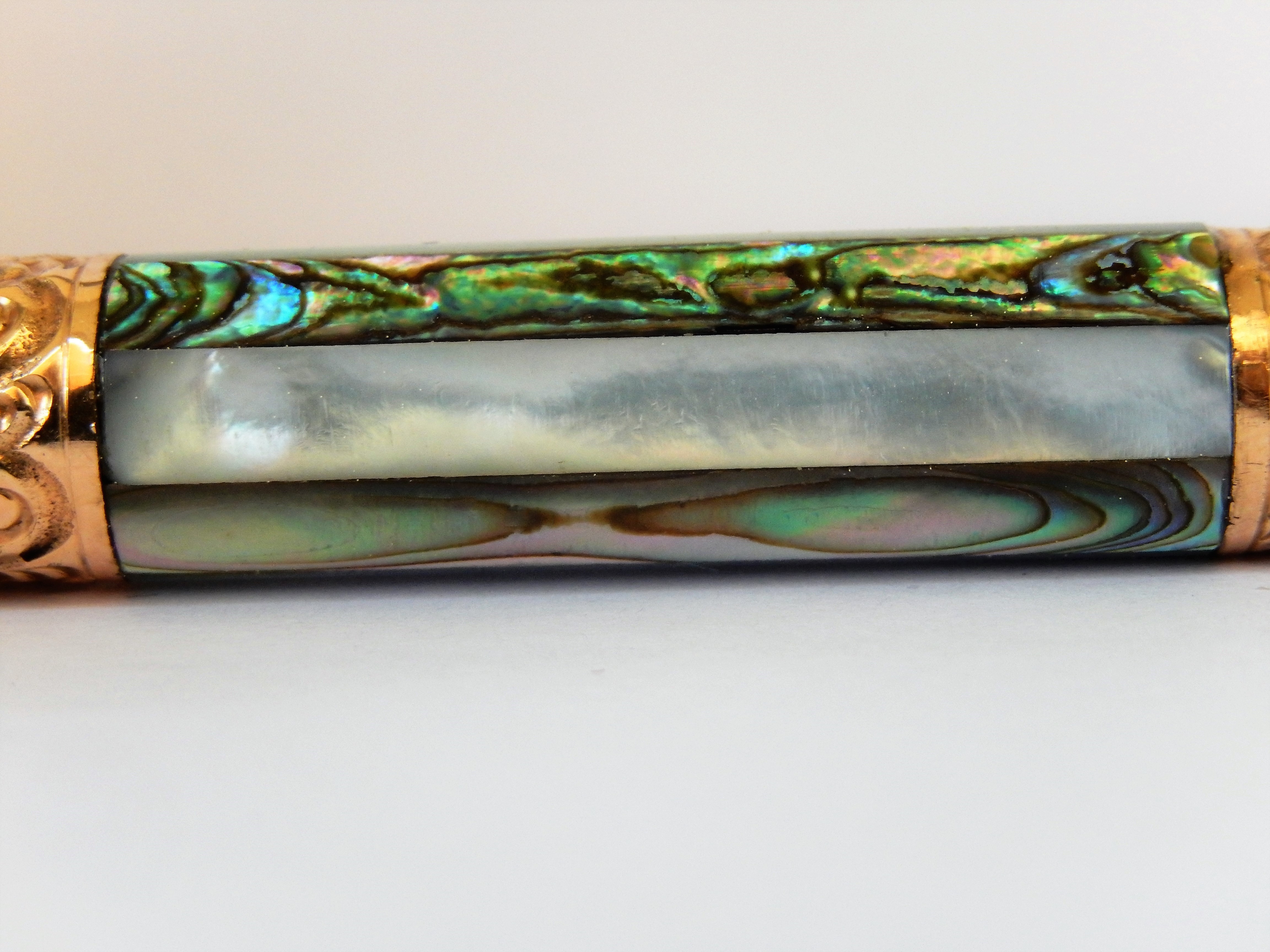 Il fusto è invece lungo 12,6 cm , decorato da otto fascette di madreperla da 3,7 cm, alternate quattro iridescenti con magnifiche colorazioni e quattro color perla, poste fra due bande d'oro da un cm, lavorate a mano nella decorazione tipo " sea snails ". Il pennino è veramente quanto di meglio si possa desiderare. Ancora in ottime condizioni e con adeguata presenza di iridio, scivola morbido e flessibile sulla carta. Vi troviamo inciso su quattro livelli " Aikin/ Lambert/ & Co/ No 3" e presenta un foro tondo collegato alla fessura, ma furono