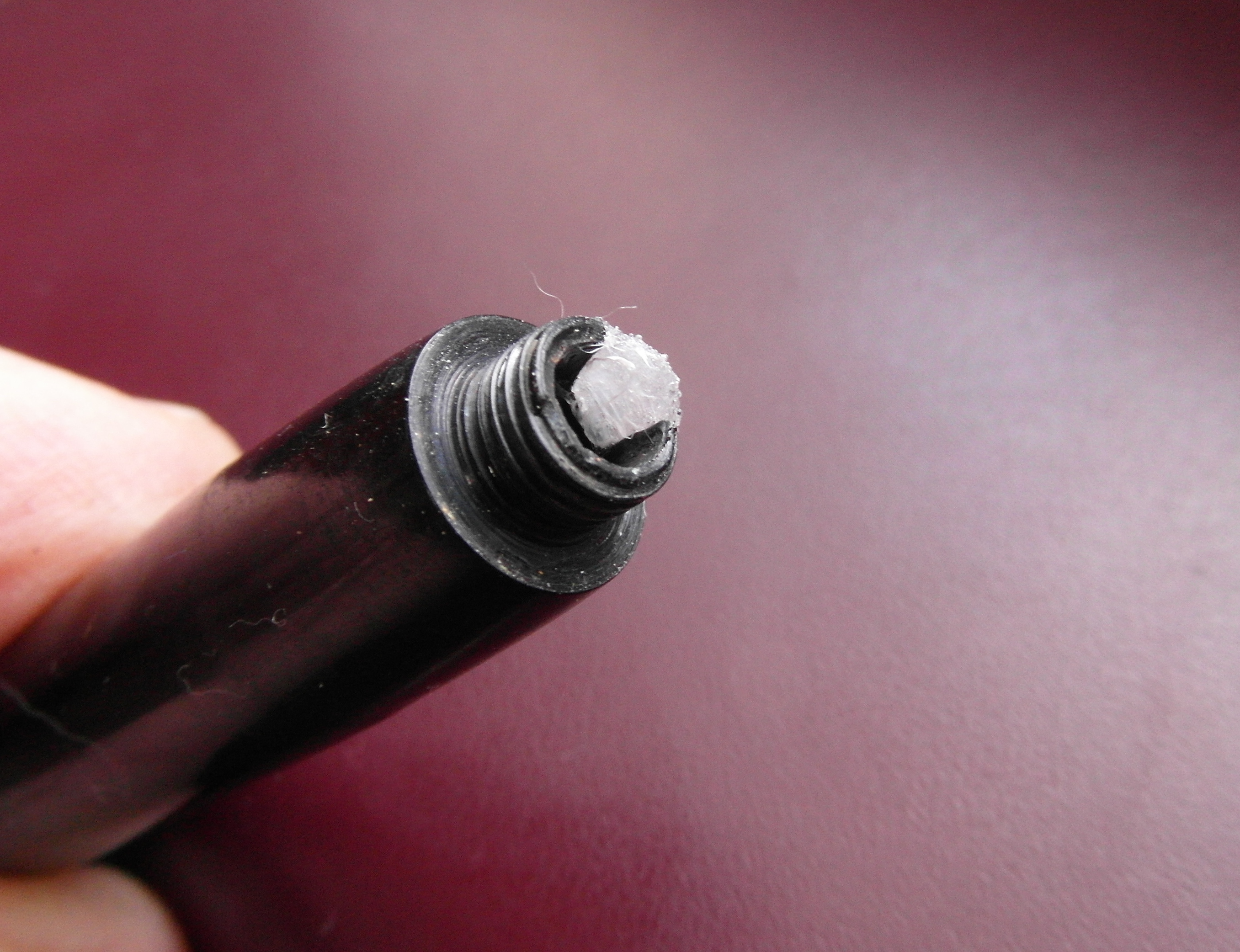 Per conservare il più possibile intatto il foro inserisco un cilindretto avvolto nel nastro di teflon sino a raggiungere il diametro corretto. Applicato il prodotto facendo molta attenzione a non andare fuori dalla zona del danno ne regolarizzo la forma con la lima e passo quindi alla fase più difficoltosa, ovvero quella di raccordare la filettatura sulla parte applicata. C'è da perderci gli occhi, ma poco alla volta riesco a ricreare i solchi mancanti con una lima di forma adeguata. Dopo qualche ritocco il fondello si avvita correttamente e non resta che applicare un pò di vernice per l'ebanite per rendere pressoché invisibile la riparazione.
