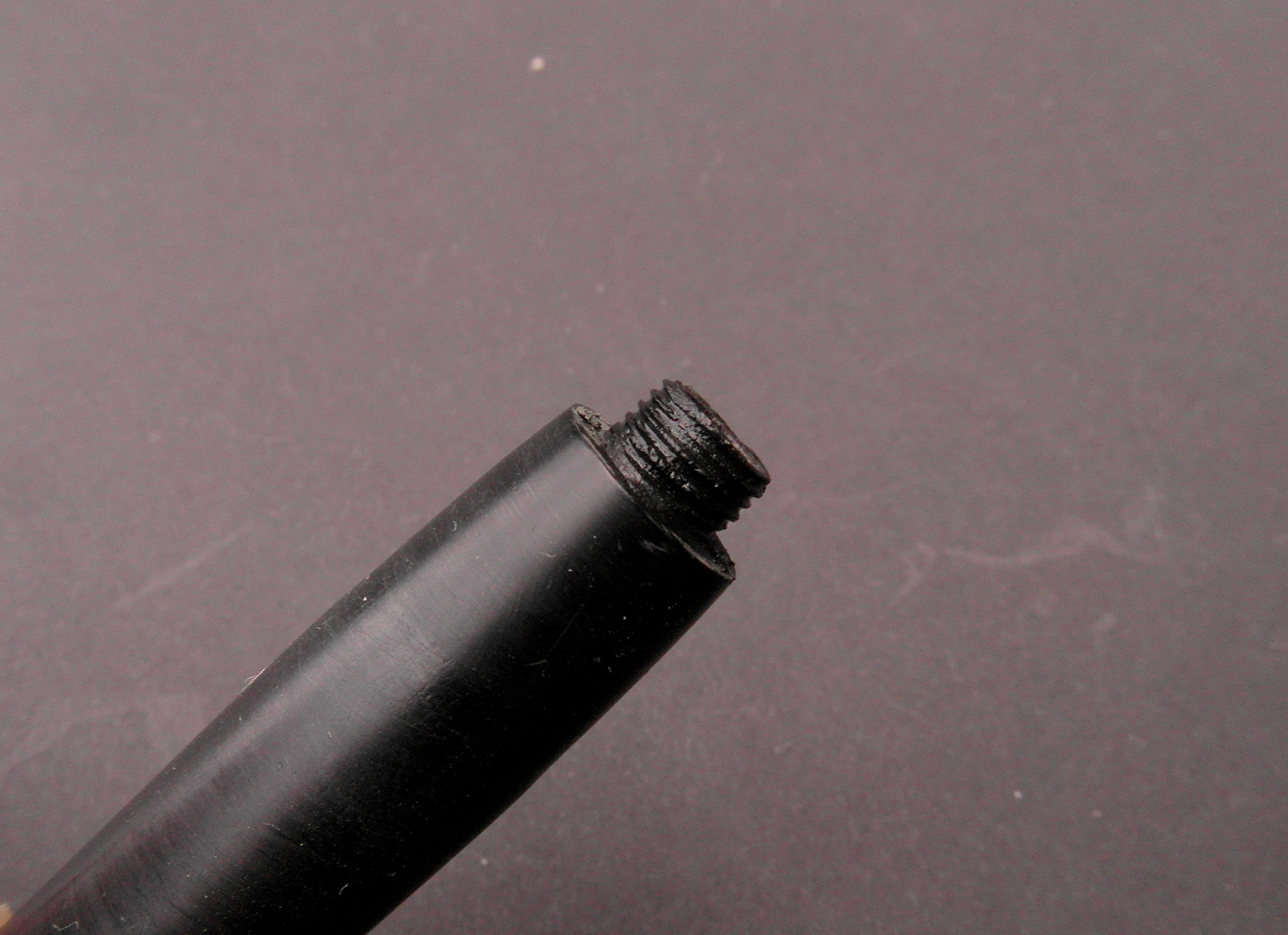 Oggi ero sufficientemente ispirato per cercare di risolvere l'ultimo problema di una vecchia Montblanc "Fabbricata in Italia": una rottura nella parte filettata che ospita il pulsante di fondo e sulla quale si avvita il fondello. Questa parte, come spesso accade non è ricavata insieme al corpo della penna, ma inserita nel suo fondo, spesso realizzata in un materiale diverso: in questo caso è in ebanite mentre il corpo è di celluloide.