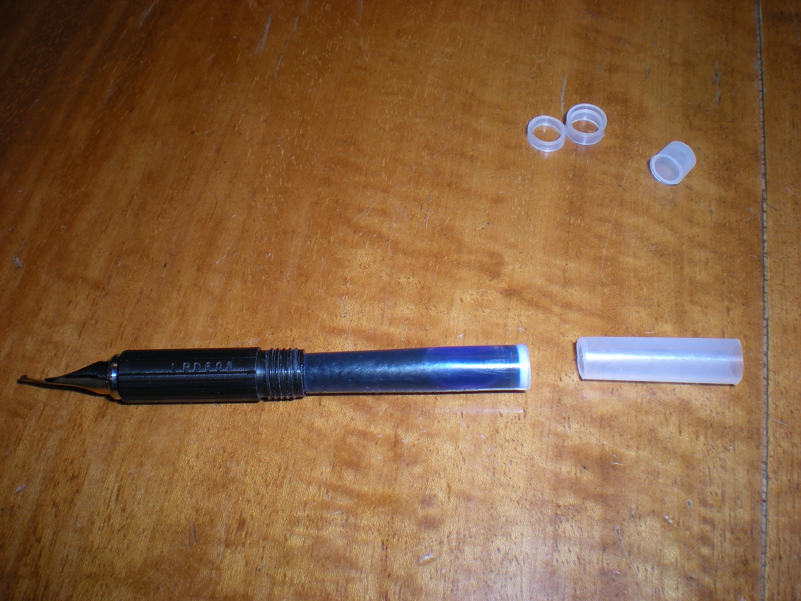 Per quanto riguarda la cartuccia tagliata è di quelle che inseriscono all'interno delle penne per impedire che quella carica si sfili a causa di urti vari.Sono delle pseudo cartucce in quanto sono aperte alle due estremità. Siccome nella Hastil "difettosa" la cartuccia Pelikan non è perfetta ho pensato di tenerla bloccata con lo stesso sistema.