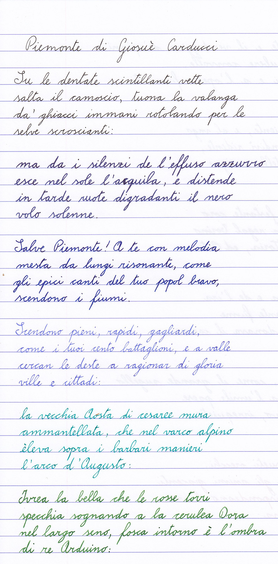 Ieri l'altro mia madre mi ha chiesto di stamparle la poesia "Piemonte" di Carducci. Ma in questi giorni ho molta voglia di scrivere quindi l'ho copiata a mano.