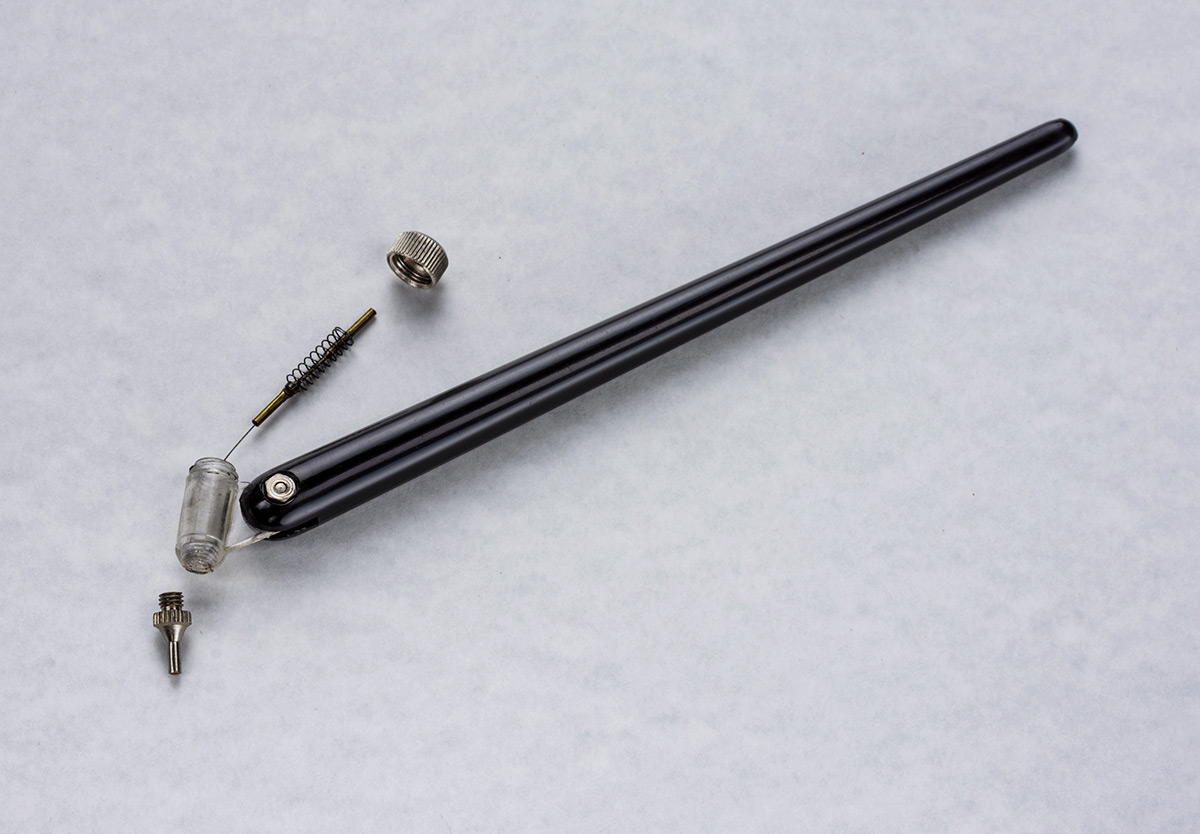 La difficoltà di tenere puliti i pennini, ma soprattutto la scarsa quantità di inchiostro che può contenere il pennino, fa maturare la nascita del rapidografo, qui il suo predecessore proposto dalla ditta Vittorio Martini, set completo di pennini e "Cannuccia dedicata"