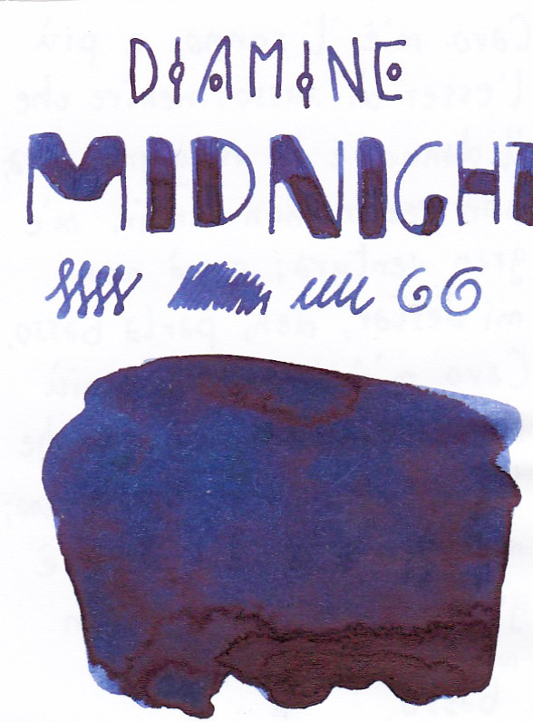 Diamine Midnight è già stato citato e mostrato ma mi permetto di aggiungere anche la mia scheda di questo colore perché è favoloso e mi piace fargli pubblicità. Non avete idea della scorrevolezza di questo blue notte (hehe.. : )). Seriamente, dal giorno in cui è arrivato non ho mai una penna senza Midnight.