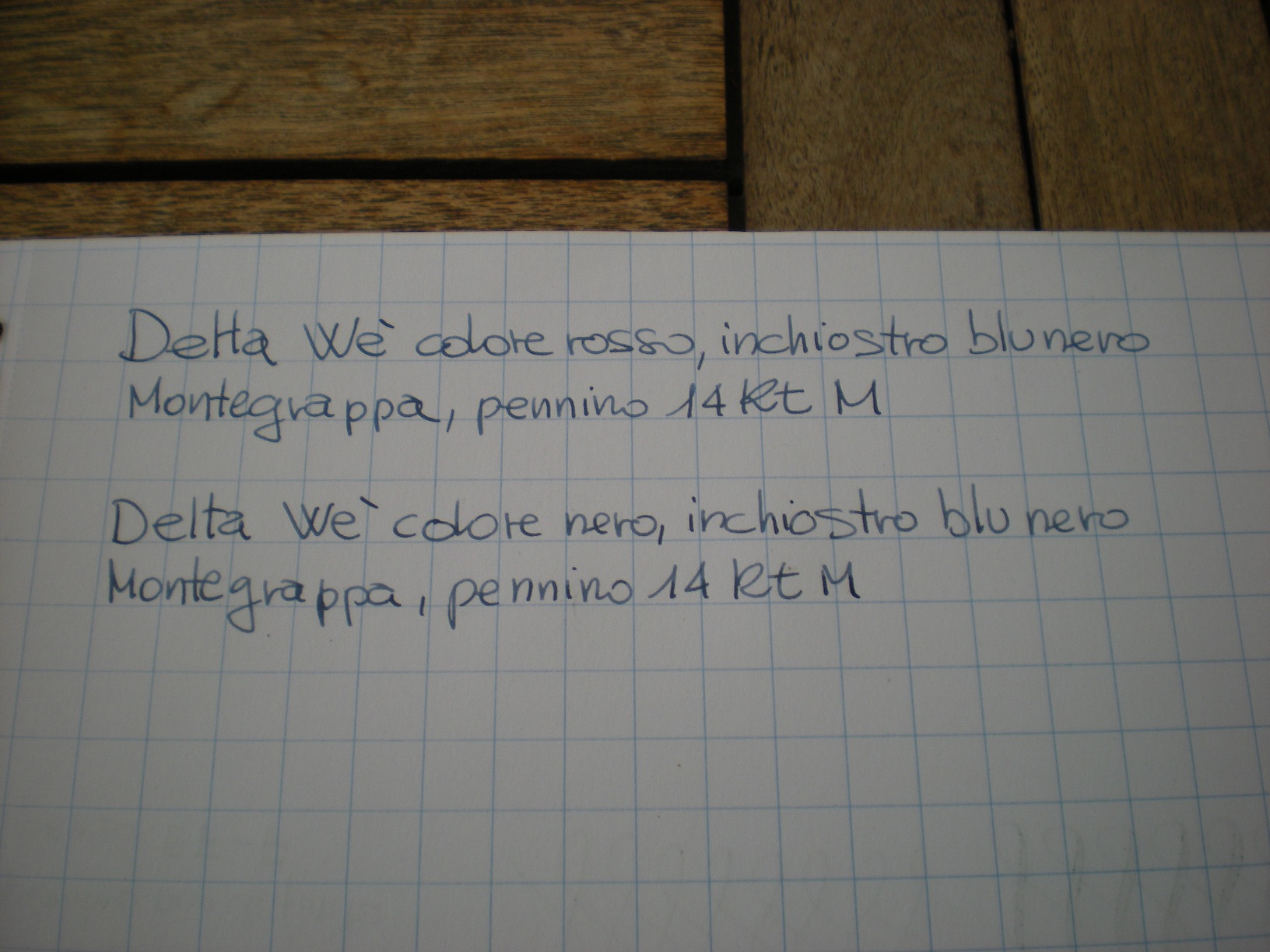 Caricando la penna e provando a scrivere,si apprezza il flusso abbondante che,insieme alla morbidezza del pennino in oro 14 K,rende la scrittura particolarmente piacevole.Come già detto altre volte,il tratto M di Delta è più sottile di quello di Pelikan e Montblanc.Voto di scrittura: 10.