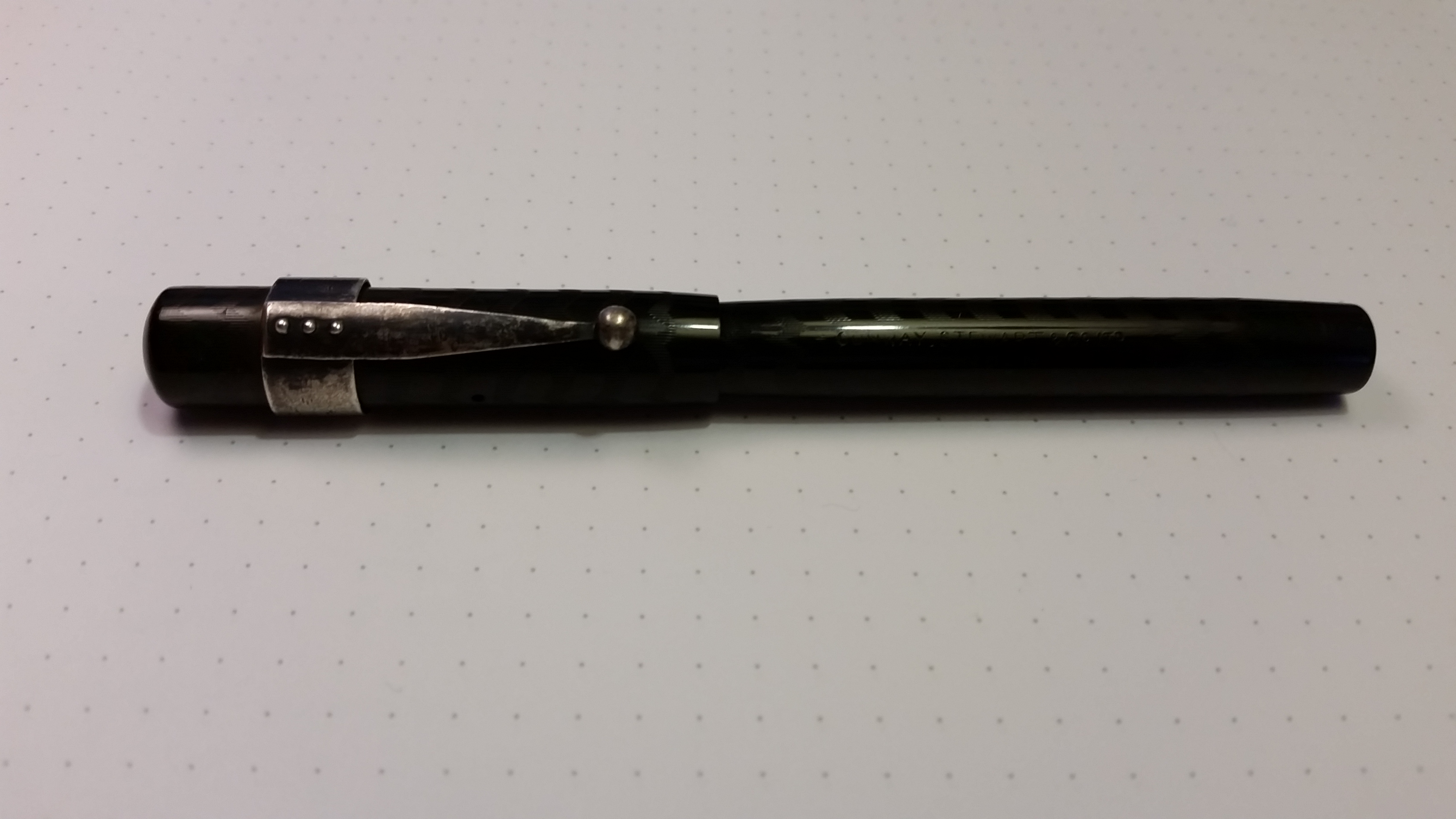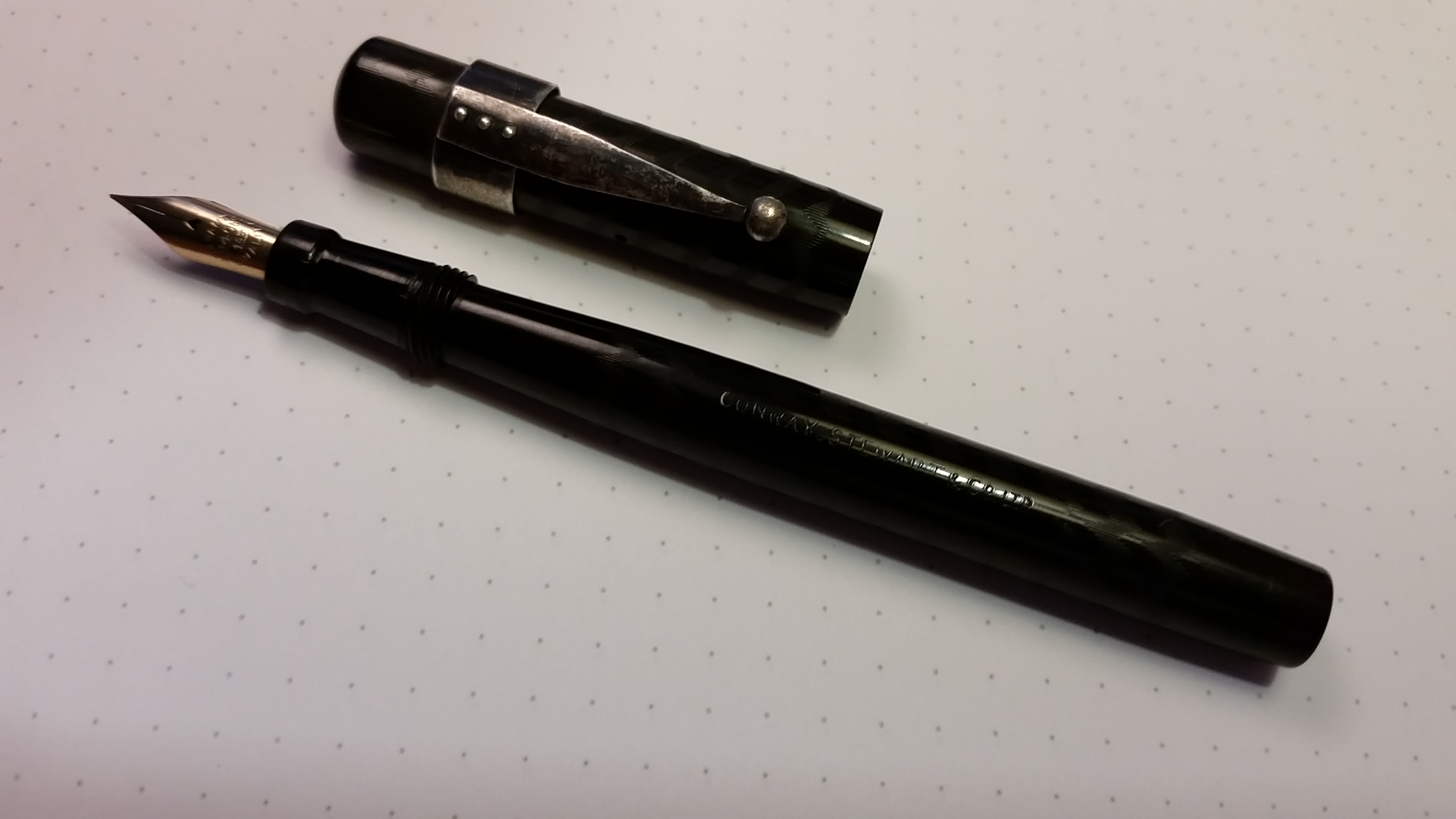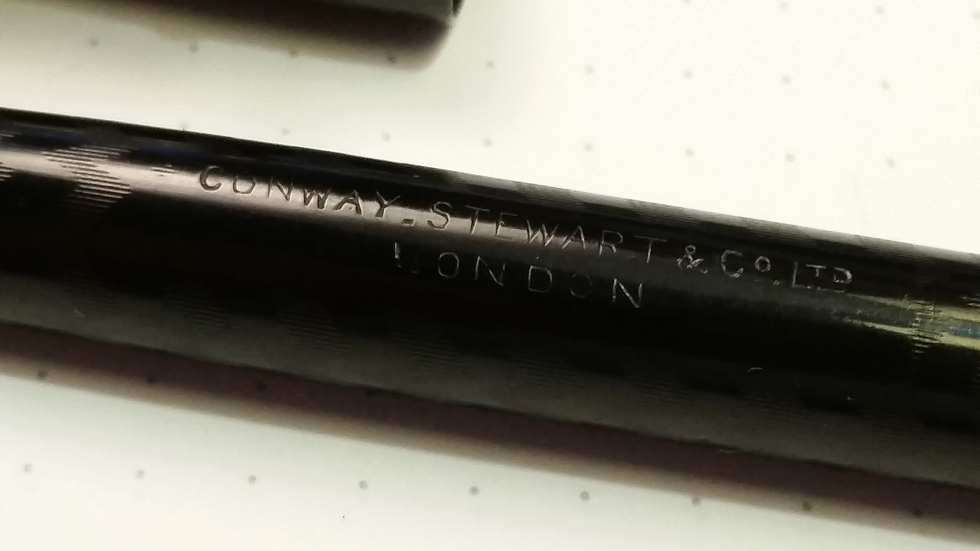 Vi vorrei mostrare una penna di cui so molto poco e di cui mi piacerebbe sapere di più. La penna l'ho presa questa mattina in un mercatino del hinterland milanese per nulla, senza pennino e molto molto (molto) sporca. Dato che sono stato a Londra quest'estate e di Conway Stewart ne ho viste tante (senza mai aver avuto l'occasione di prenderne una), ho deciso di riparare alla lacuna con questa, la mia prima CS. Mi ha insospettito in particolar modo la sezione (la quale non mi sembra originale, ma posso tranquillamente sbagliarmi) e la incisione sul corpo, molto minimale. La penna è in ebanite decorata con un motivo a onde ancora piuttosto visibile, e il caricamento risulta a contagocce. La clip è molto bella (non so se sia la sua) e l'alimentatore è un po' malridotto, ma ancora funzionante. Non volendo che rimanesse senza pennino, ci ho montato sopra un Warranted 14k che avevo tra i rottami (che tralatro scrive malissimo e ha bisogno di essere risitemato). Ho rovato a fare qualche ricerca su questa penna sul wiki e penso che si tratti della prima produzione Conway Stewart quando la società era ancora a responsabilità limitata, realizzata nello stabilimento in Upper Thames Street di Londra. La incisione sul corpo riporta "CONWAY.STEWART&Co.Ltd " e sotto "LONDON"; immagino che la data di produzione sia collocabile tra il 1909 e il 1920 (anno in cui venne registrato il marchio "The Conway Stewart"). Comunque mi sembra strana l'impugnatura, come se la sezione allungasse ancora di più la penna, anche se il tutto rientra perfettamente nel cappuccio. Presenta un particolare profumo simile alla liquirizia (tipico dell'ebanite), le misure sono: