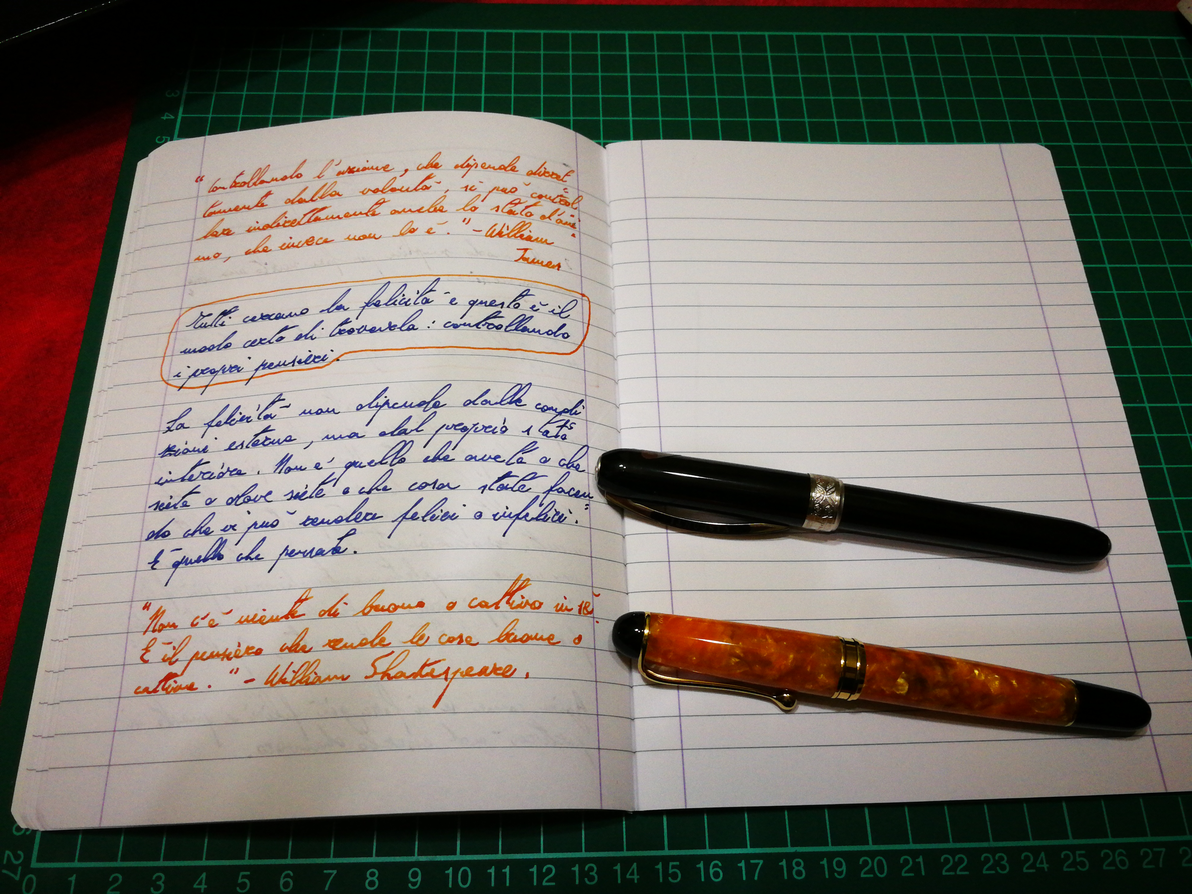 alla fine ho deciso di onorare l'ingresso della stagione con il Diamine Autumn Oak. MA ho anche deciso di applicare i vostri consigli sulla Visconti Rembrandt. Entrambe mi stanno regalando delle belle soddisfazioni. Allego foto dei miei appunti.
