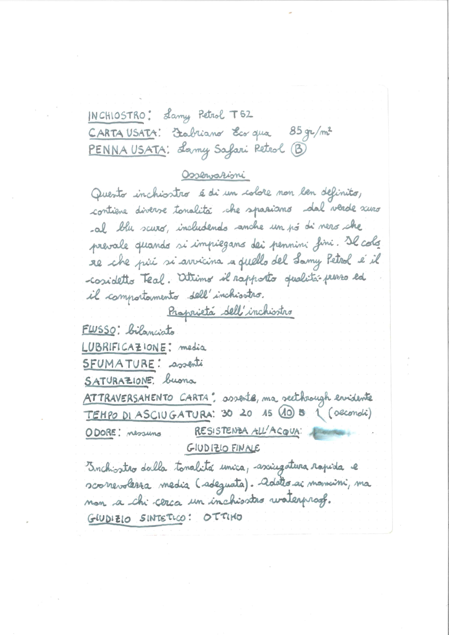 Ecco una mia umile recensione dell'inchiostro Lamy Petrol (edizione limitata 2017). Mi scuso per la bassa qualità dell'immagine, ma non avendo uno scanner proprio mi tocca fare affidamento sulla buona volontà degli addetti dei centri copie e tale fiducia è sempre mal riposta.