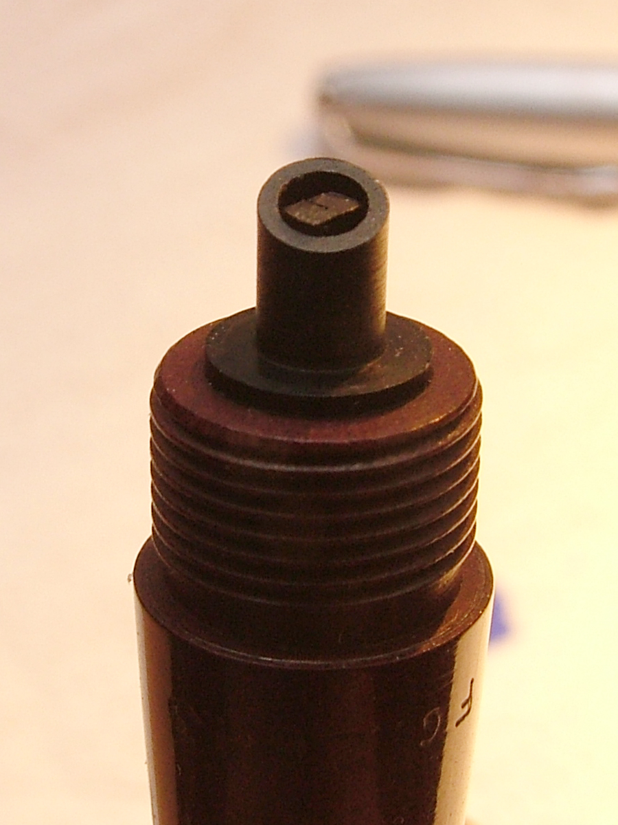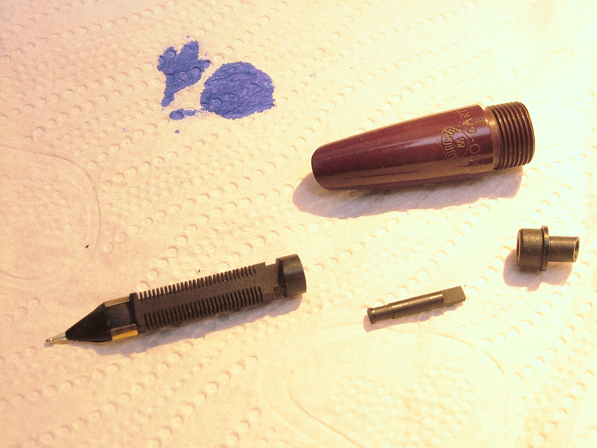 Oppure c'e' il famoso perno di regolazione del flusso d'inchiostro che e' montato a battente sull'alimentatore da regolare. E posso dire che per averci giocato (su altre penne della serie 88) varia molto il flusso d'inchiostro, da tanto secco da fare false partenze - Si, un'Aurora 88 succedeva chiudendolo- fino a rendere la stessa penna con un ingestibile flusso d'inchiostro, tanto da allagare regolarmente carta e cappuccio.