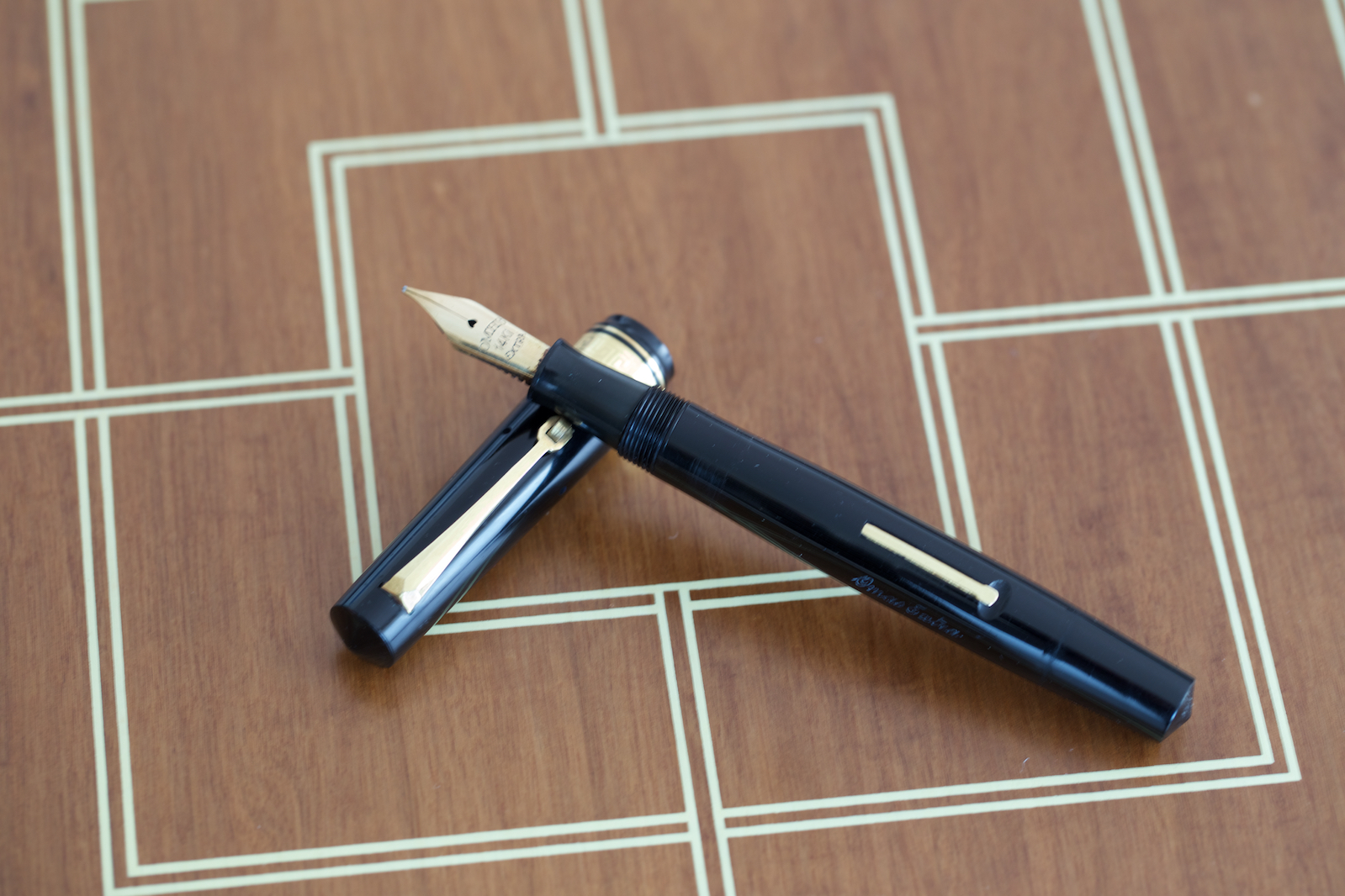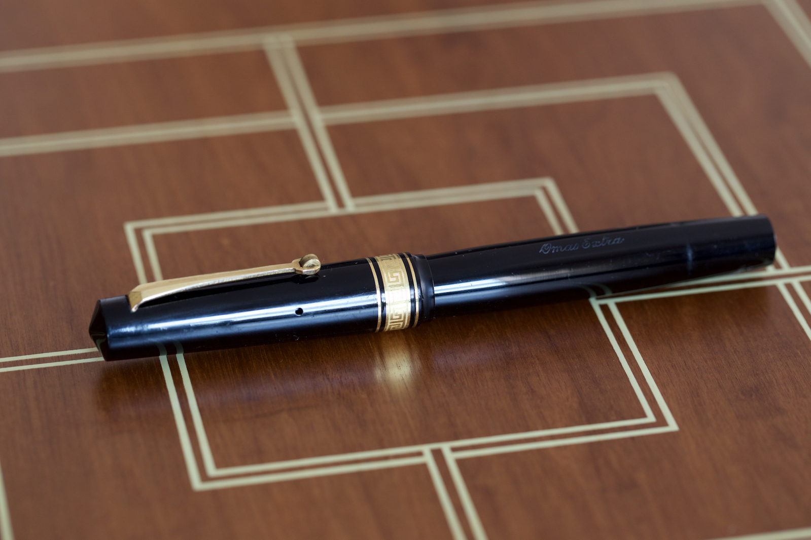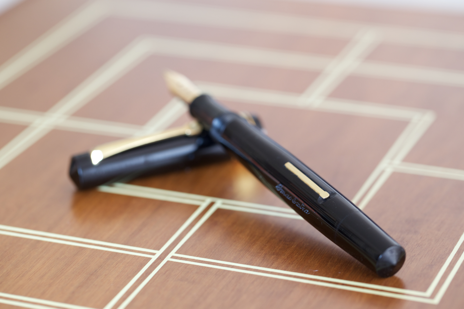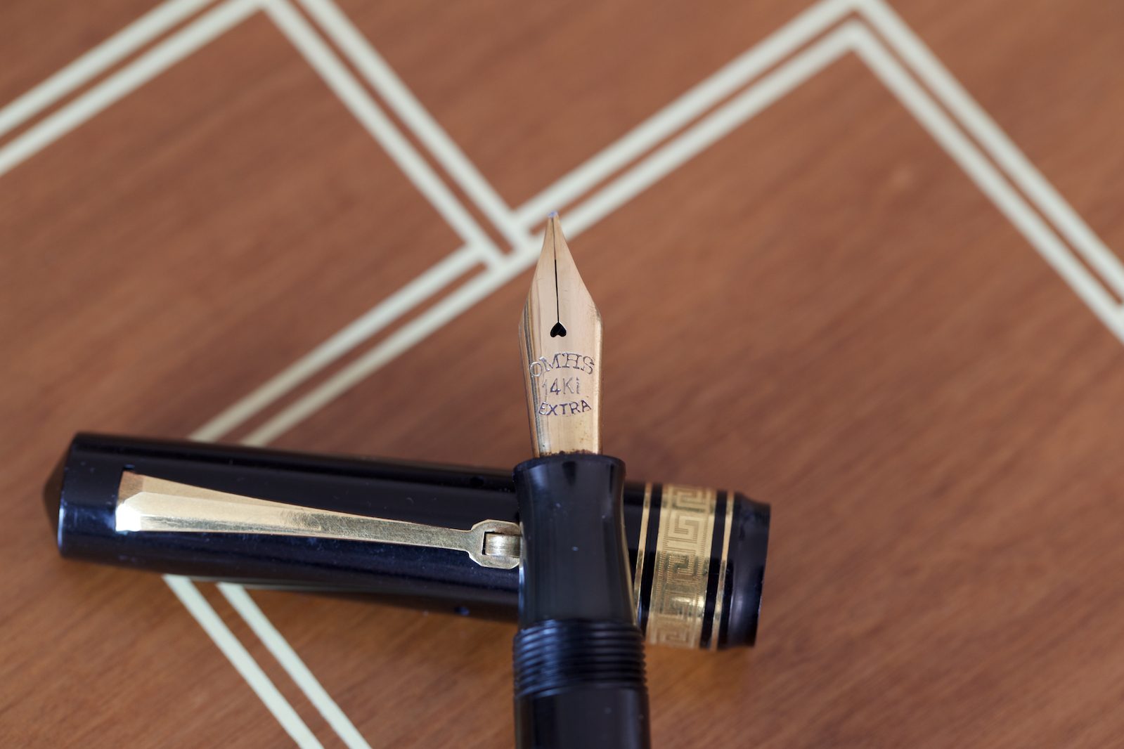 ultima aggiunta alla collezione Omas, una bella penna databile tra il 1932 e il 1936 in celluloide nera e carica a levetta. È la misura media, penso, misura da chiusa 134 mm e ha un bel pennino molto flessibile che è quasi un piccolo stub. Da notare la particolarità del pennino che riporta 14 Ki invece del canonico Kt.