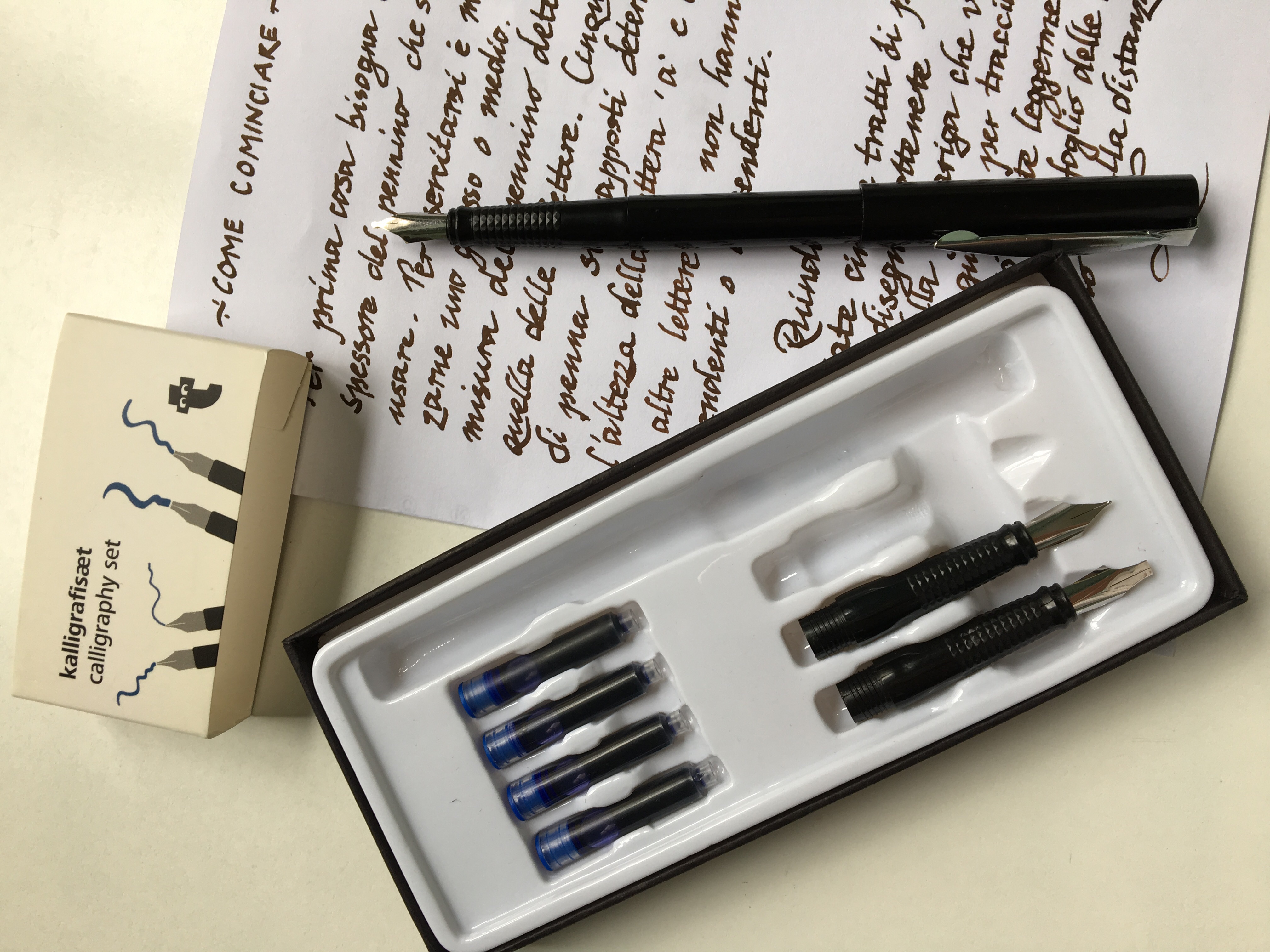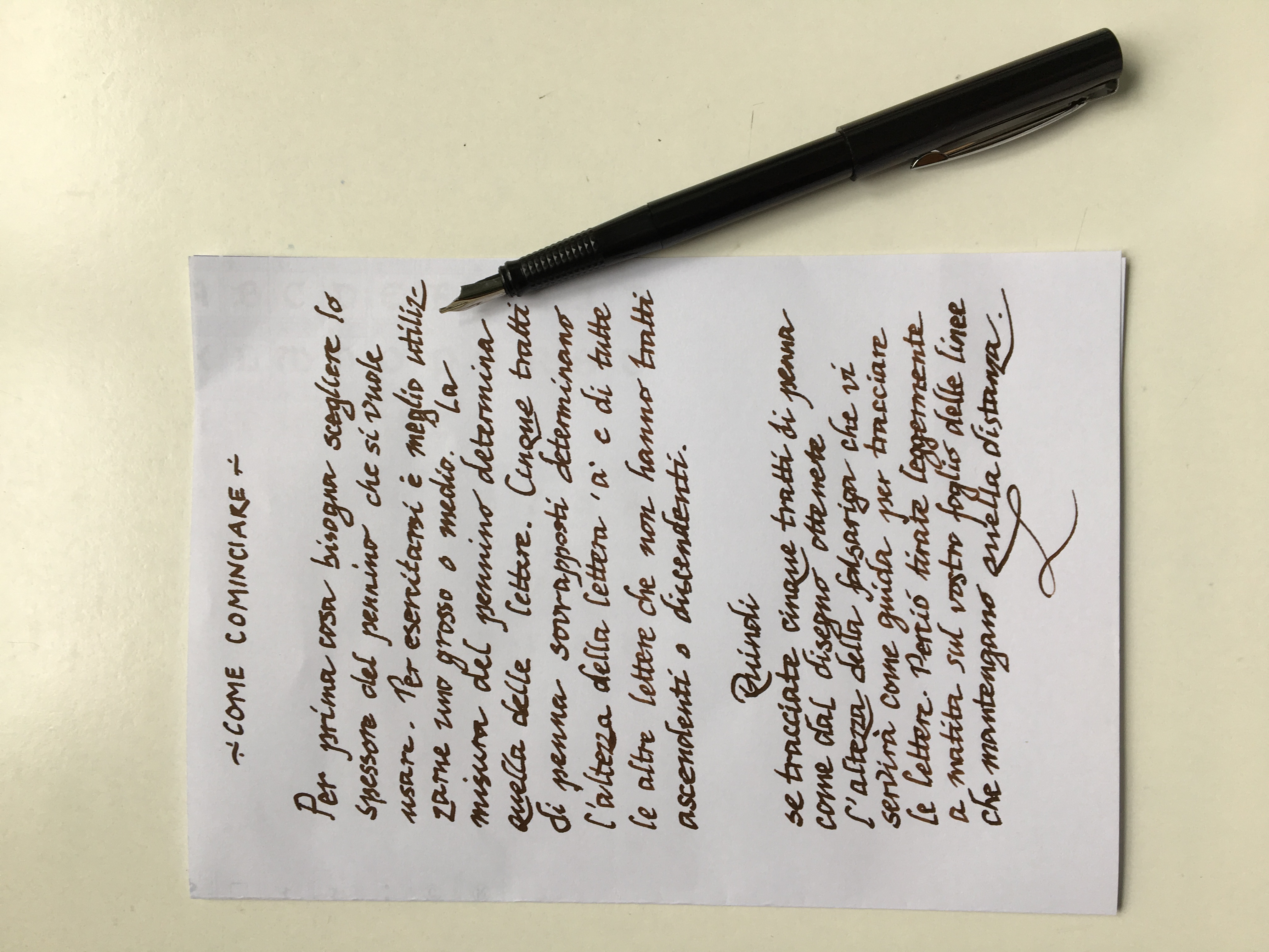 La carta è economicissima carta da fotocopie, l’inchiostro Kaweco Caramel Brown in cartuccia, la penna una anonima Made in China.