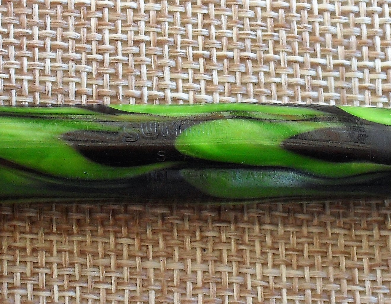 La finitura dell’esemplare che vedete, caratterizzata da una bella celluloide verde fiammata, piuttosto originale, suggerisce che il prodotto fosse pensato per un pubblico giovane, inserito nella tendenza di quegli anni che privilegiava non soltanto il colore ma anche tutto ciò che poteva risultare divertente o accattivante. Chissà se la “fiammatura” fu ispirata dal fenomeno dei dragsters americani, che proprio nel secondo dopoguerra consolidarono la loro popolarità.