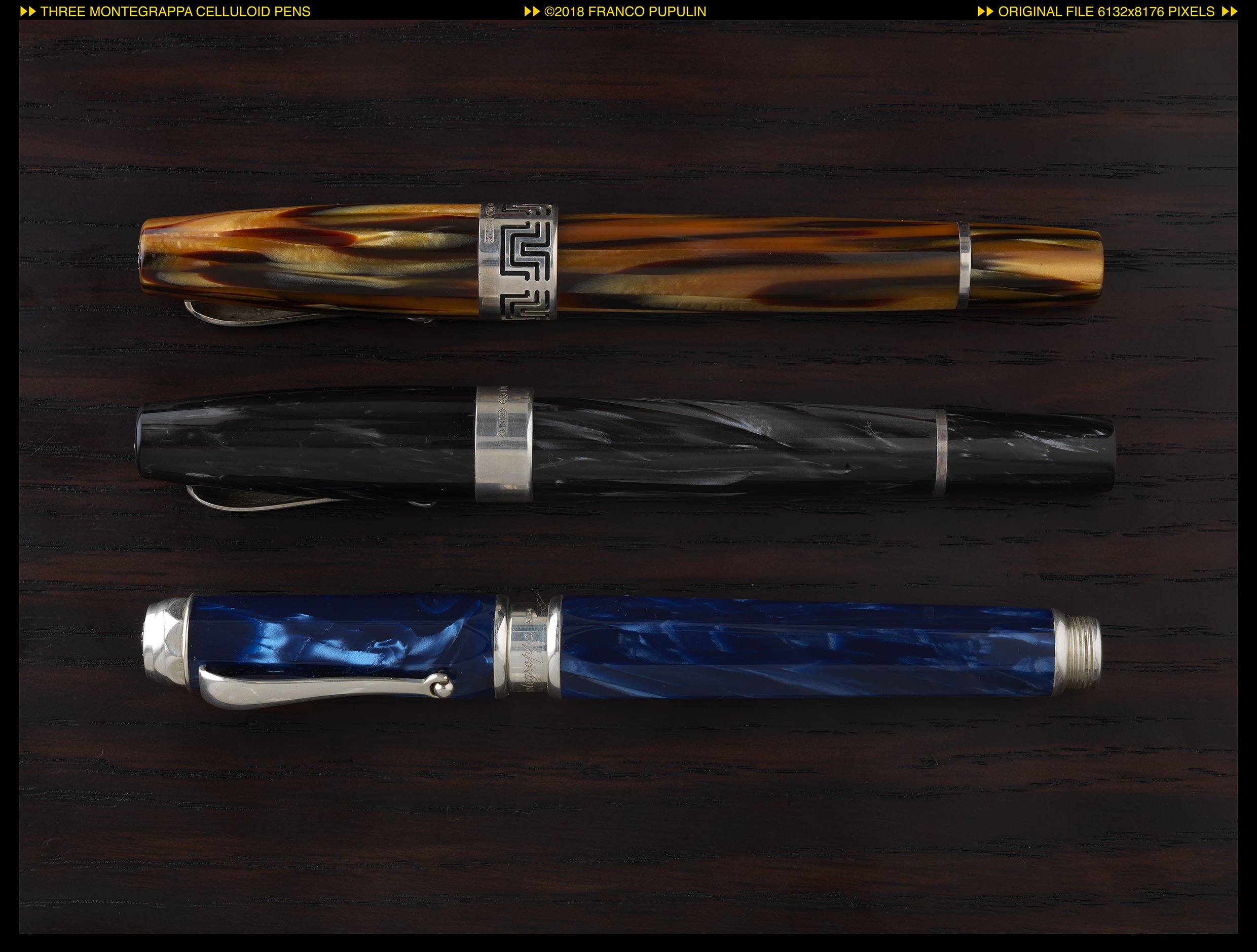 Classica fu prodotta in celluloide di tre colori: un classicissimo, sobrio nero perlato, un vibrante rosso cannella, che in qualche modo ricorda la ebanite (gomma indurita) delle penne degli anni ‘20e ’30 del secolo scorso, e un brillante colore turchese marino, profondo e pieno di trasparenze. Mentre le celluloidi rossa e turchese saranno utilizzate da Montegrappa, sole o in combinazione con altri materiali, per altre linee di penne (Symphony, Miya, Miya Argento, Miya Carbon, Emblema, Emozione, Extra APC, oltre a varie edizioni speciali), che io sappia il rosso cannella non é più stato impiegato, se non in Passione e forse nella recente Extra Colori del Mare in color corallo, la cui celluloide mi pare molto simile se non identica a quella della Classica originale.