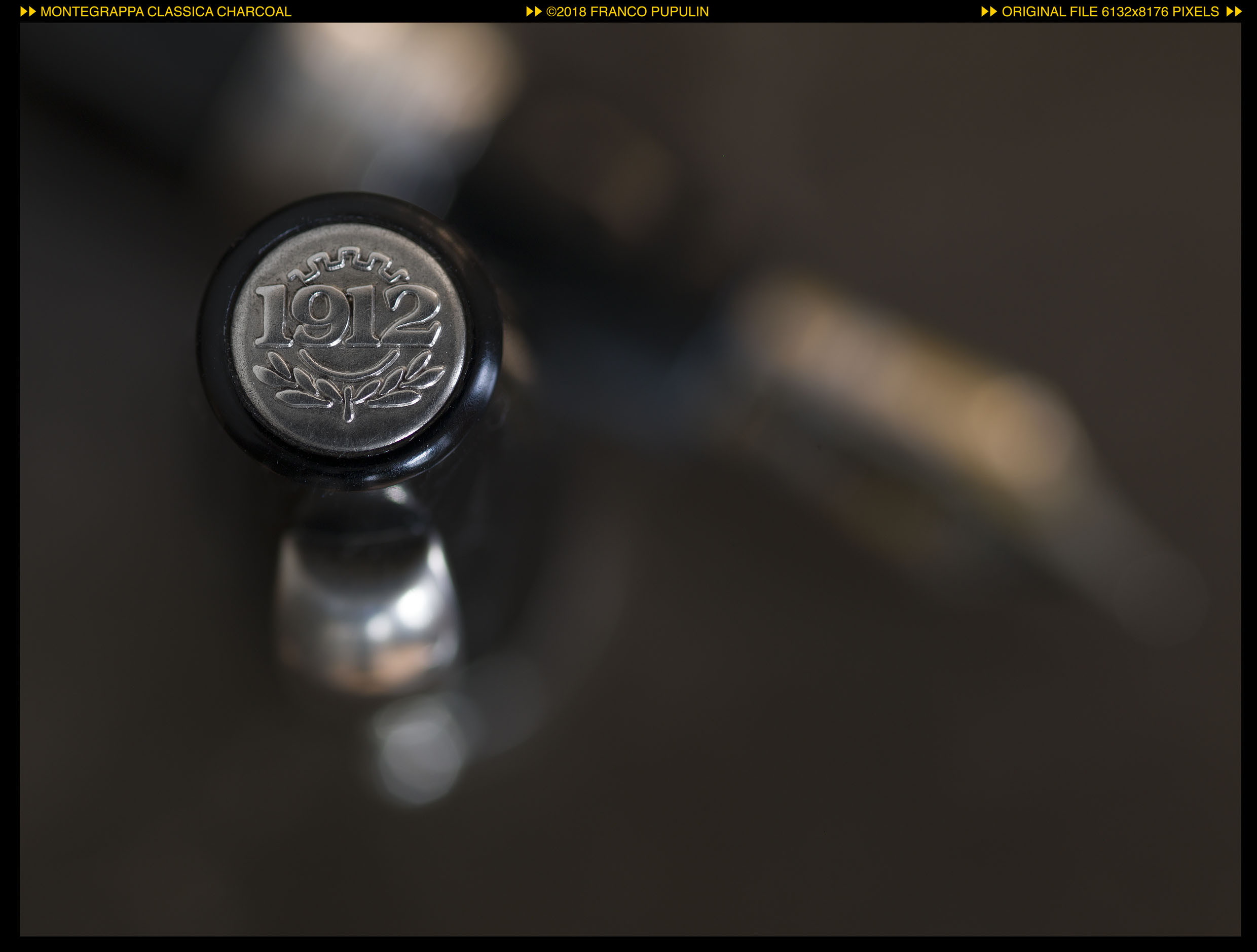 Il pennino, con il disegno a greca che la letteratura di Montegrappa definisce come “Palladio”, é una misura 5. Visivamente, lo trovo un po’ piccolo per le dimensioni della penna, ma ció non ha impedito a Montegrappa di mantenere queste proporzioni in varie delle proprie linee di penne di fascia alta, riservando il grande pennino numero 8 solamente a Extra, Extra 1930 ed Extra Otto per quanto riguarda le penne in celluloide, e alla sola Ducale Grande tra le penne in resina. Nella mia Classica, prodotta durante il periodo Richemont (il punzone dell’argento indica MI, Milano, invece della VI, Vicenza, della gestione Aquila pre-2000), il pennino é piacevolmente semi-flessibile. Perfetto sin dal primo momento, il pennino della mia Classica non é ovviamente un pennino da calligrafia, ma possiede una certa elasticità che gli conferisce doti calligrafiche e lo uso a volte per giochicchiare con la grafia stile Copperplate.