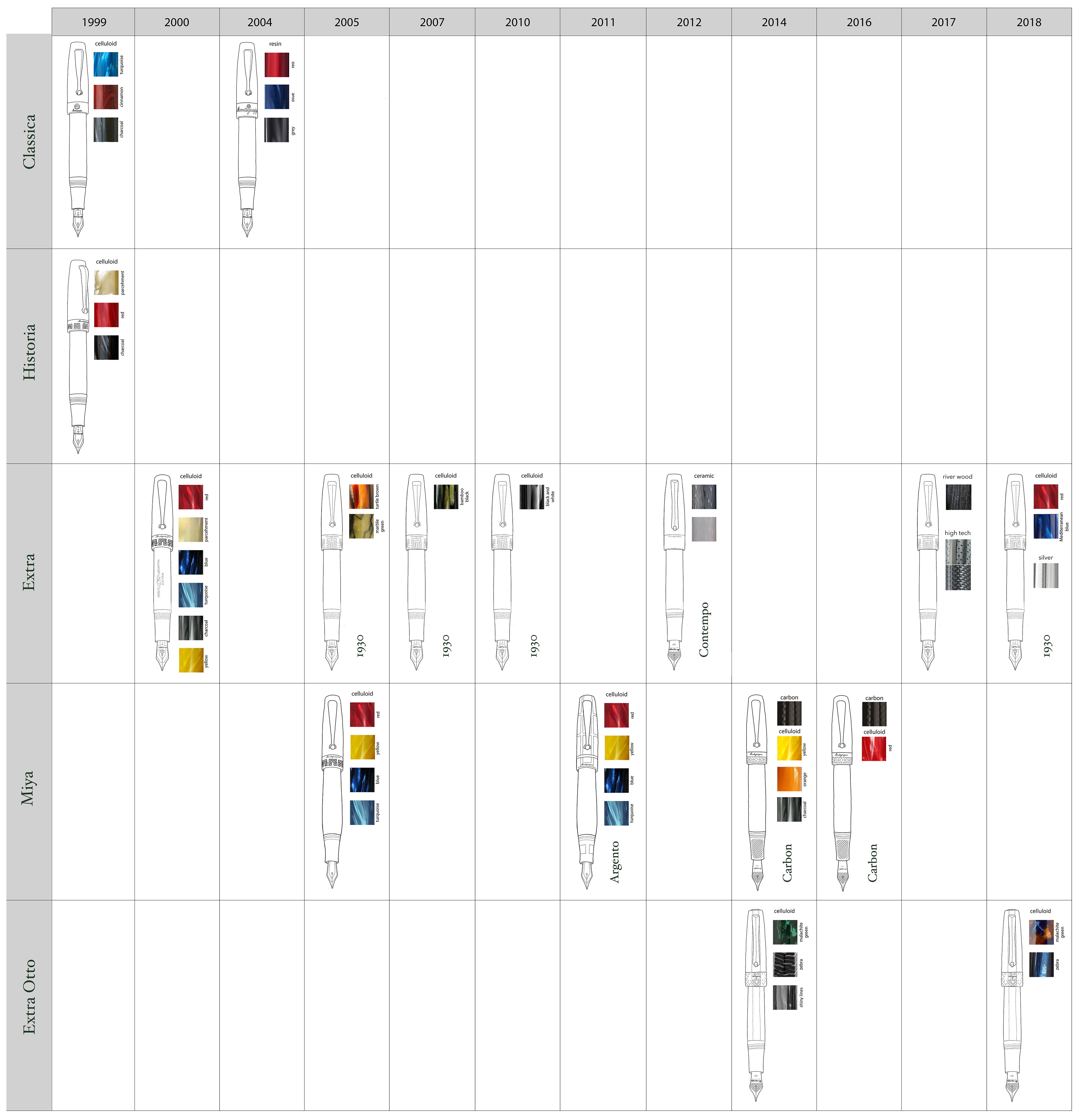 La seconda rappresenta una “cronologia” della dinastia inaugurata con Classica e ne ripercorre, datandole, le invenzioni, la creazione delle linee, la introduzione dei nuovi materiali. Da questa sinossi storica é evidente come l’ereditá di Classica, lungi dall’esaurirsi, abbia vissuto negli ultimi tre-quattro anni un vero revival creativo con nuovi modelli, nuovi materiali, nuovi stilemi nel solco della più classica tradizione di questa penna straordinaria. Non sono incluse qui le edizioni limitate che derivano direttamente da questa dinastia, numerose, spesso bellissime, con materiali rari e unici, per lo più ispirate direttamente a Extra 1930. Spero di coprire questo capitolo più avanti.