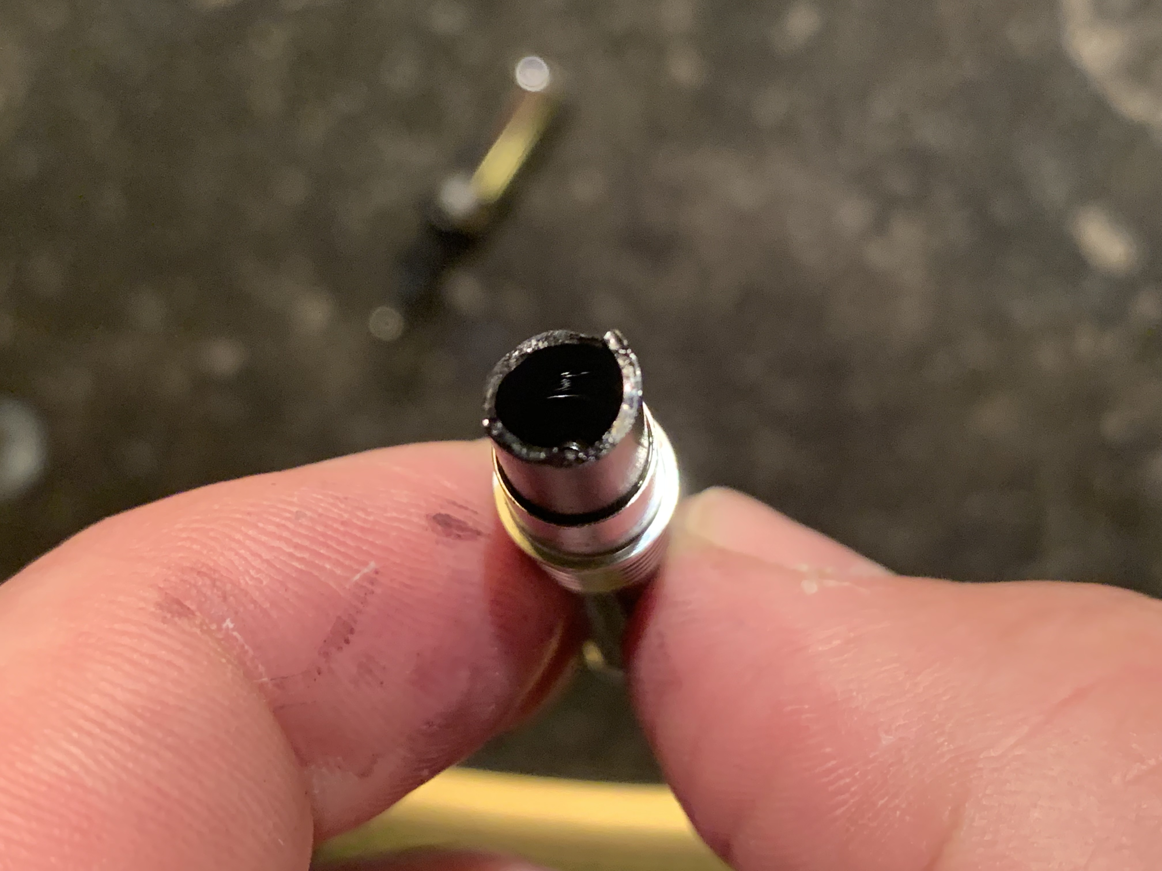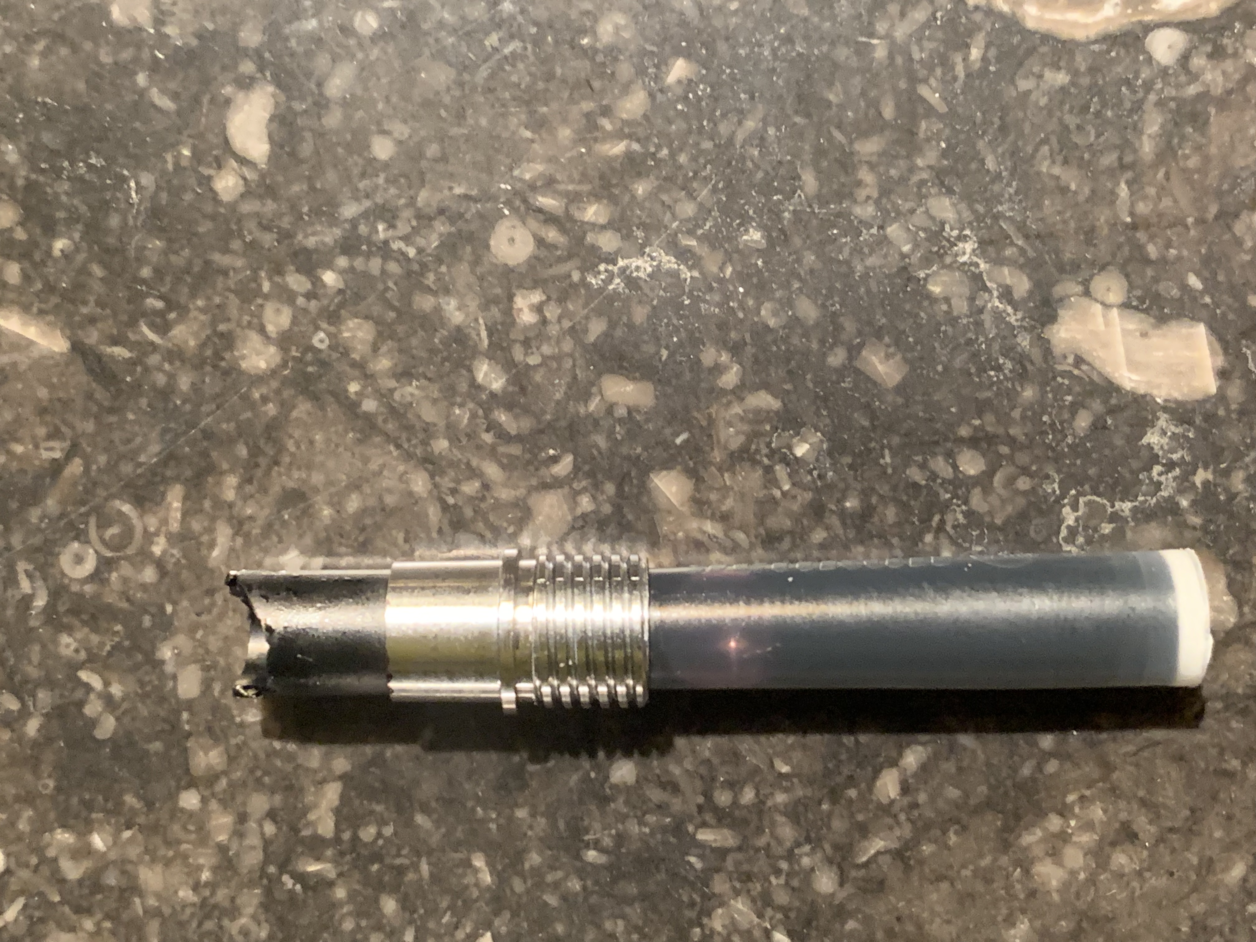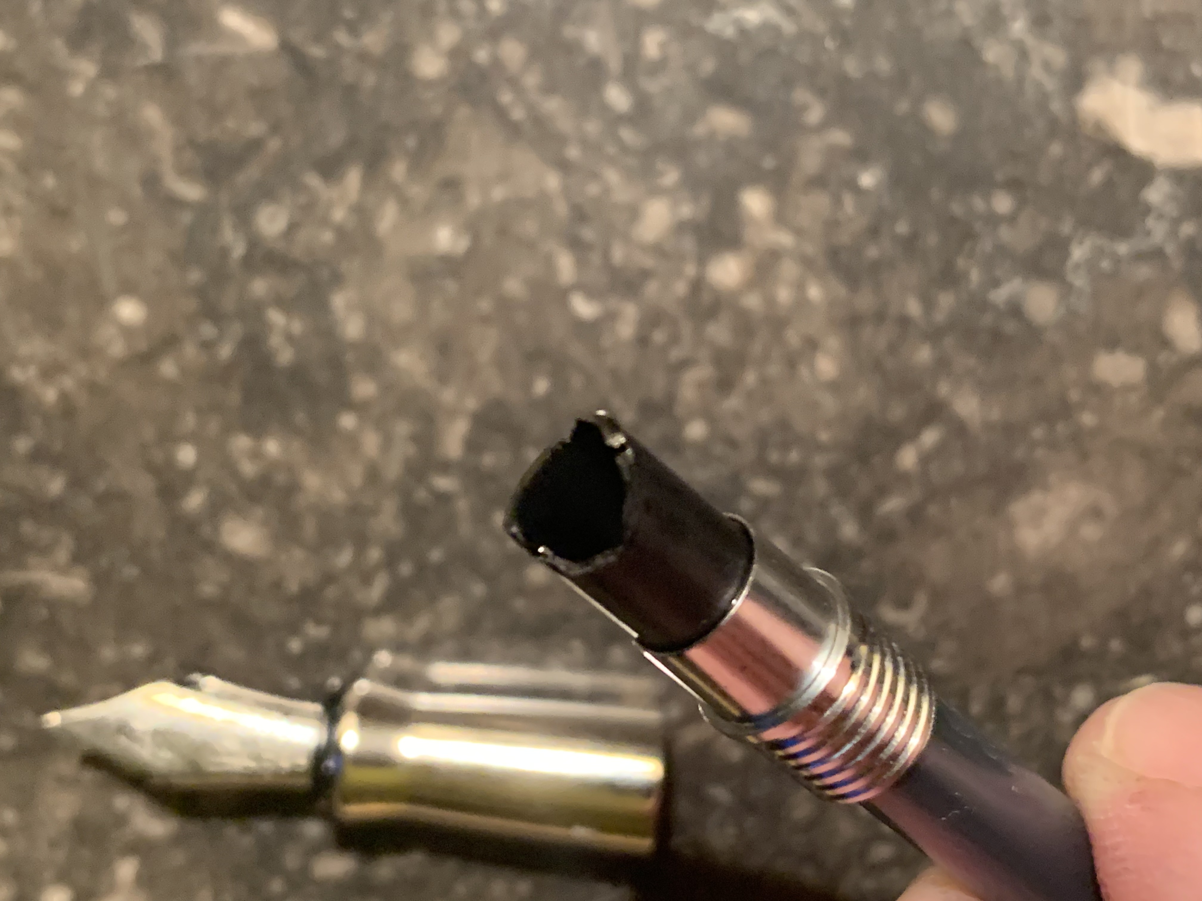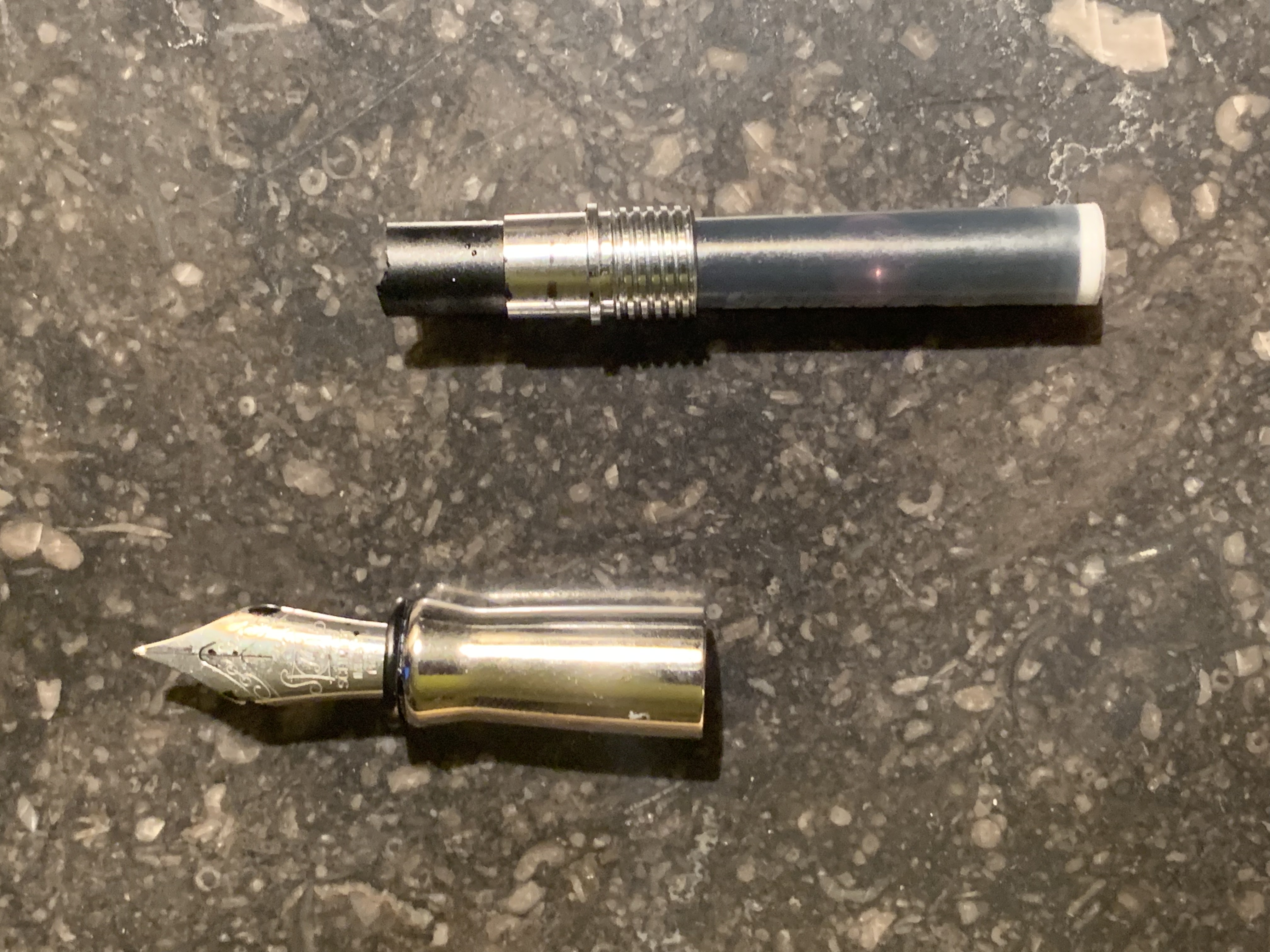 C’è un cilindretto in plastica che unisce le due parti che risulta sbeccato. Credo che all’interno ci fosse un tubi uno che collegava le due sezioni altrimenti non mi spiego come faccia a passare l’inchiostro dalla cartuccia al pennino.