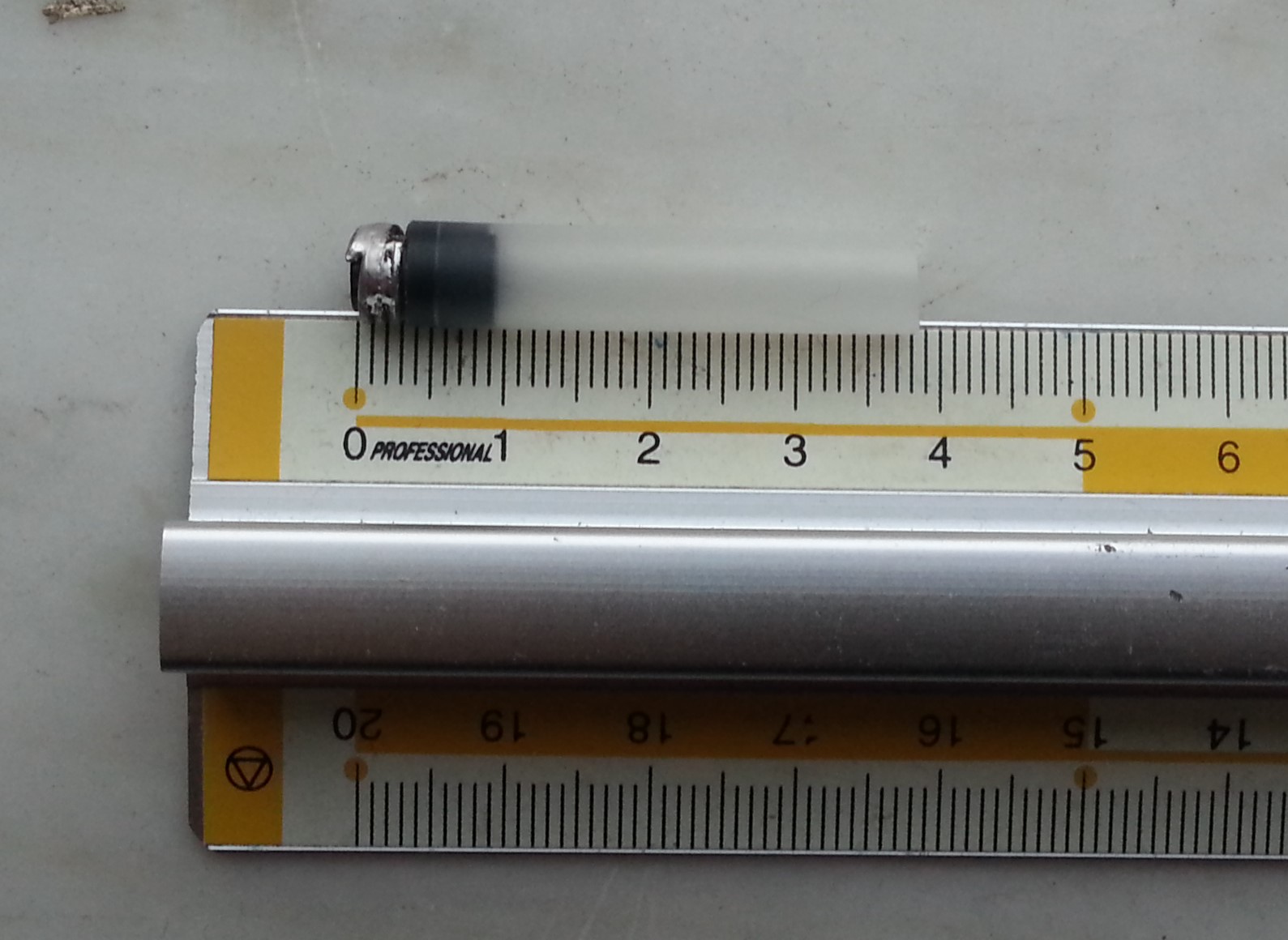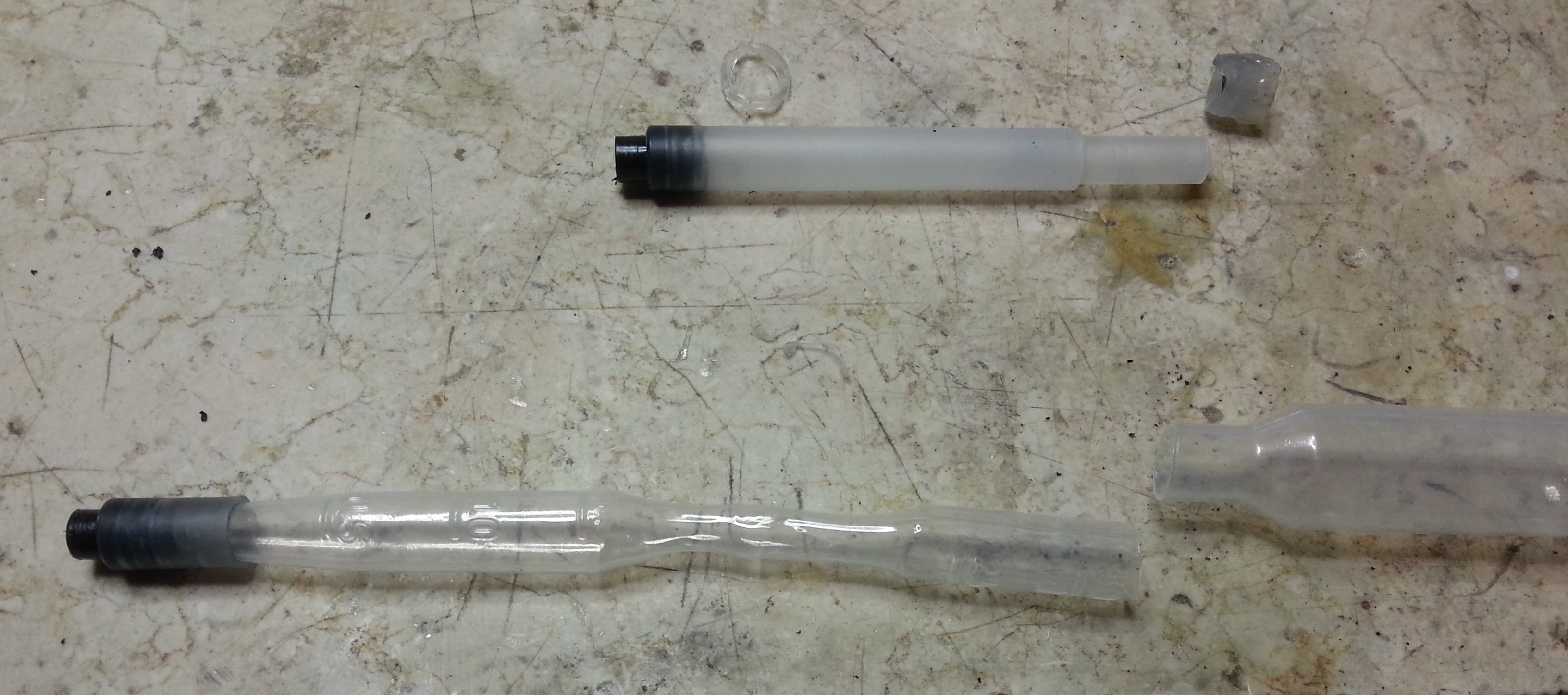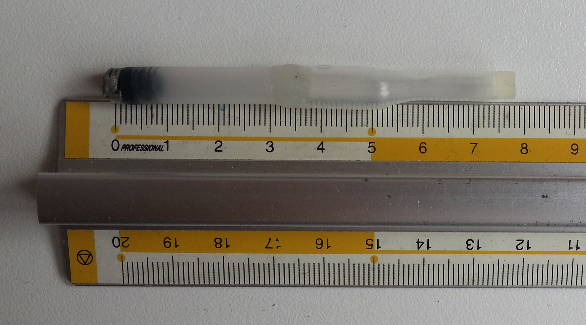 Il converter è costituito da due metà, e per realizzarlo sono partito da una cartuccia Lamy originale, che ho tagliato per una lunghezza di circa 3.8mm a partire dall'innesto, come visibile in questa foto: