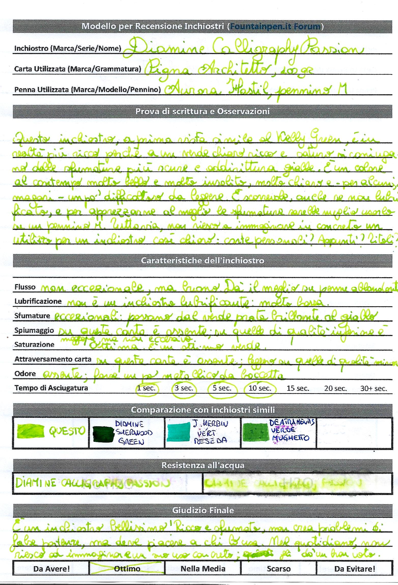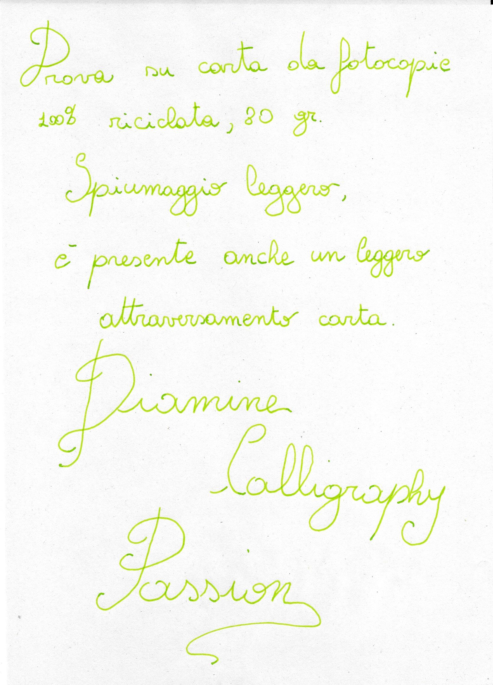 Per quanto mi riguarda, è davvero un ottimo inchiostro, superbo per colore e qualità e tiene il confronto con altre marche ben più blasonate e costose. L'unico neo è che non riesco davvero a immaginare per quale uso, nel quotidiano, potrebbe essere destinato. In alcuni punti affatica un po' la vista, perché le sfumature gialloverdi lo rendono un po' difficile da leggere, ed è meglio non usarlo se si deve scrivere in piccolo.
