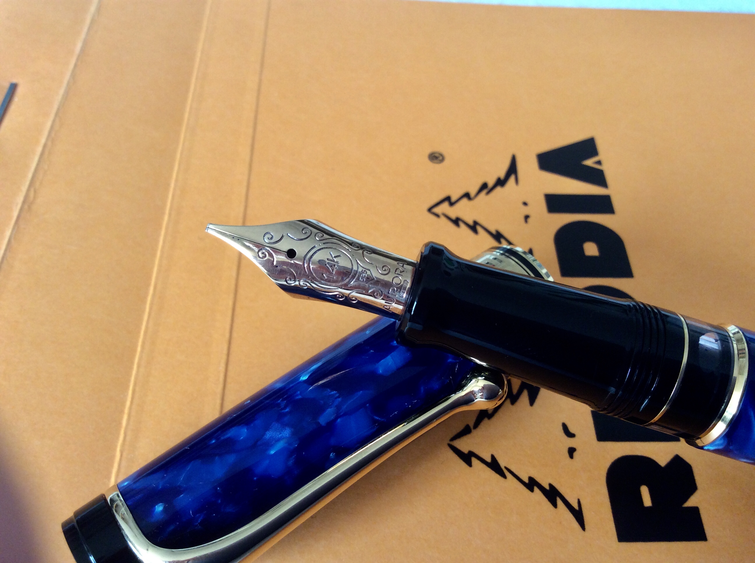 Io sono tornato a casa questa volta senza una “vecchietta”. Avevo una mira precisa ma non ho trovato ciò che cercavo, l’ unica papabile non scriveva bene... Ho trovato questa Aurora Optima in auroloide blu nuova, mai inchiostrata con un pennino italico che trovo fantastico, per di più a un prezzo onesto. Grazie agli organizzatori per l’ evento ma questa sala è veramente troppo angusta!