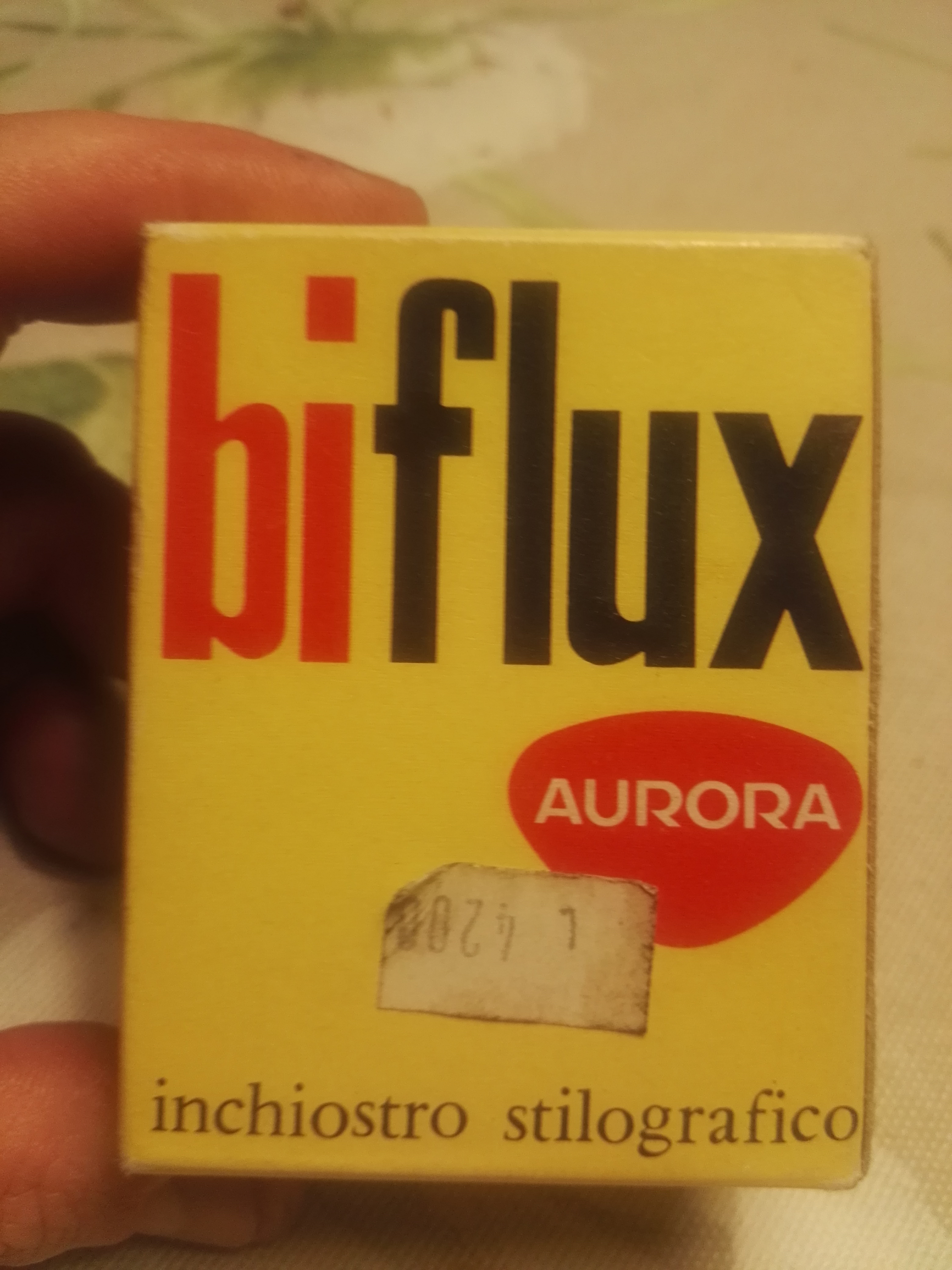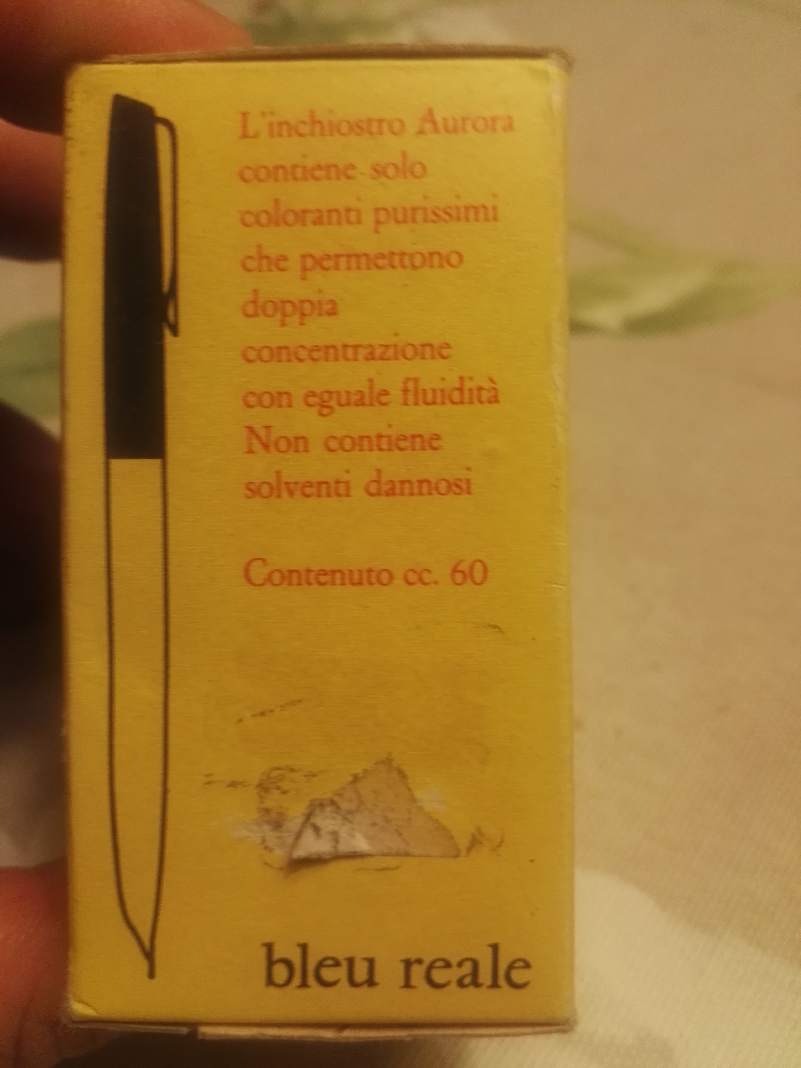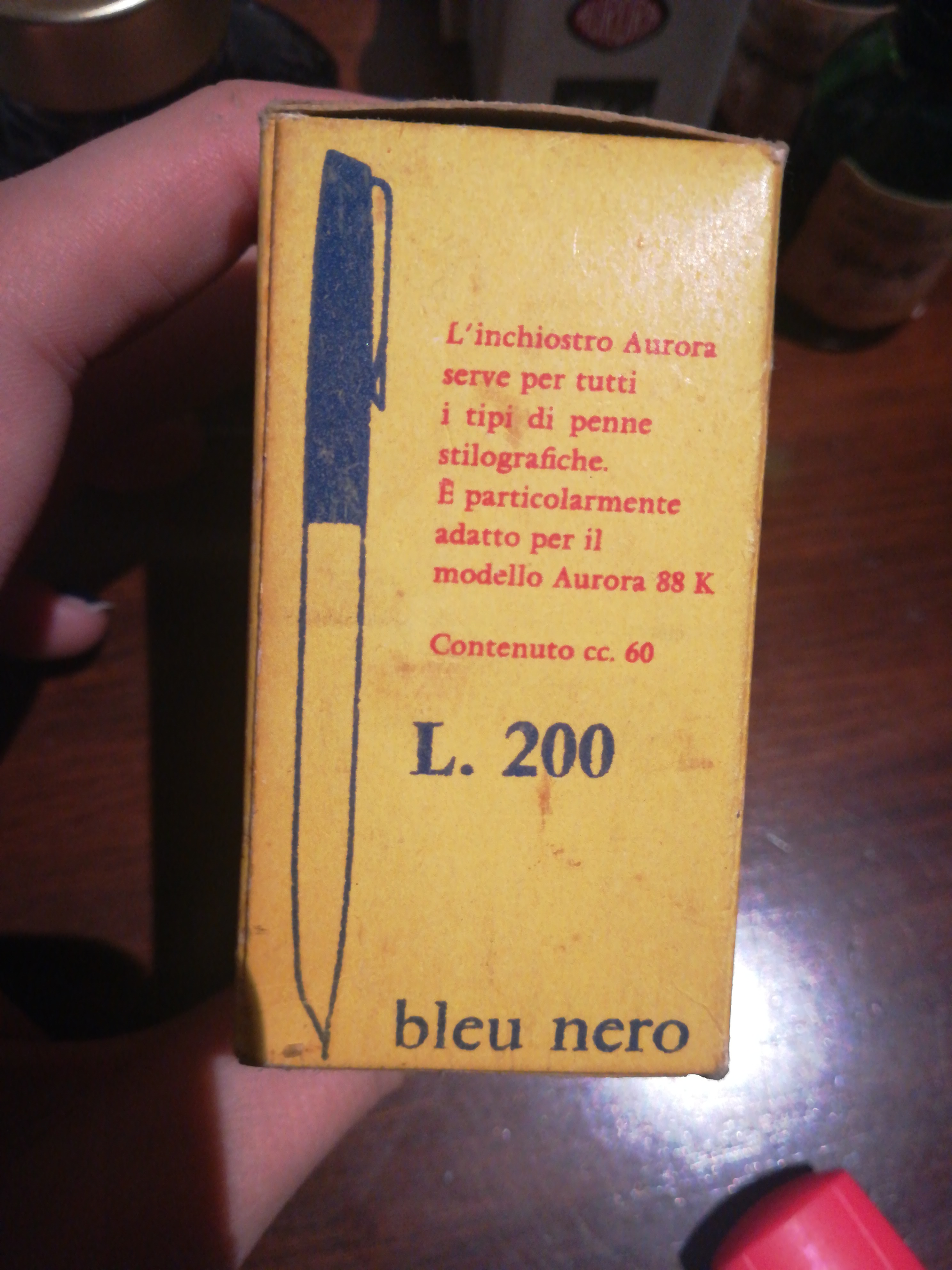 La mia invece riporta sull'altro fianco della confezione in cartone la dicitura che l'inchiostro è particolarmente consigliato per la Aurora 88 K. Ora, se la K è stata introdotta nel 1951 ed è rimasta in produzione per un decennio, prima di essere sostituita dalla P, deve essere più o meno una mia coscritta...
