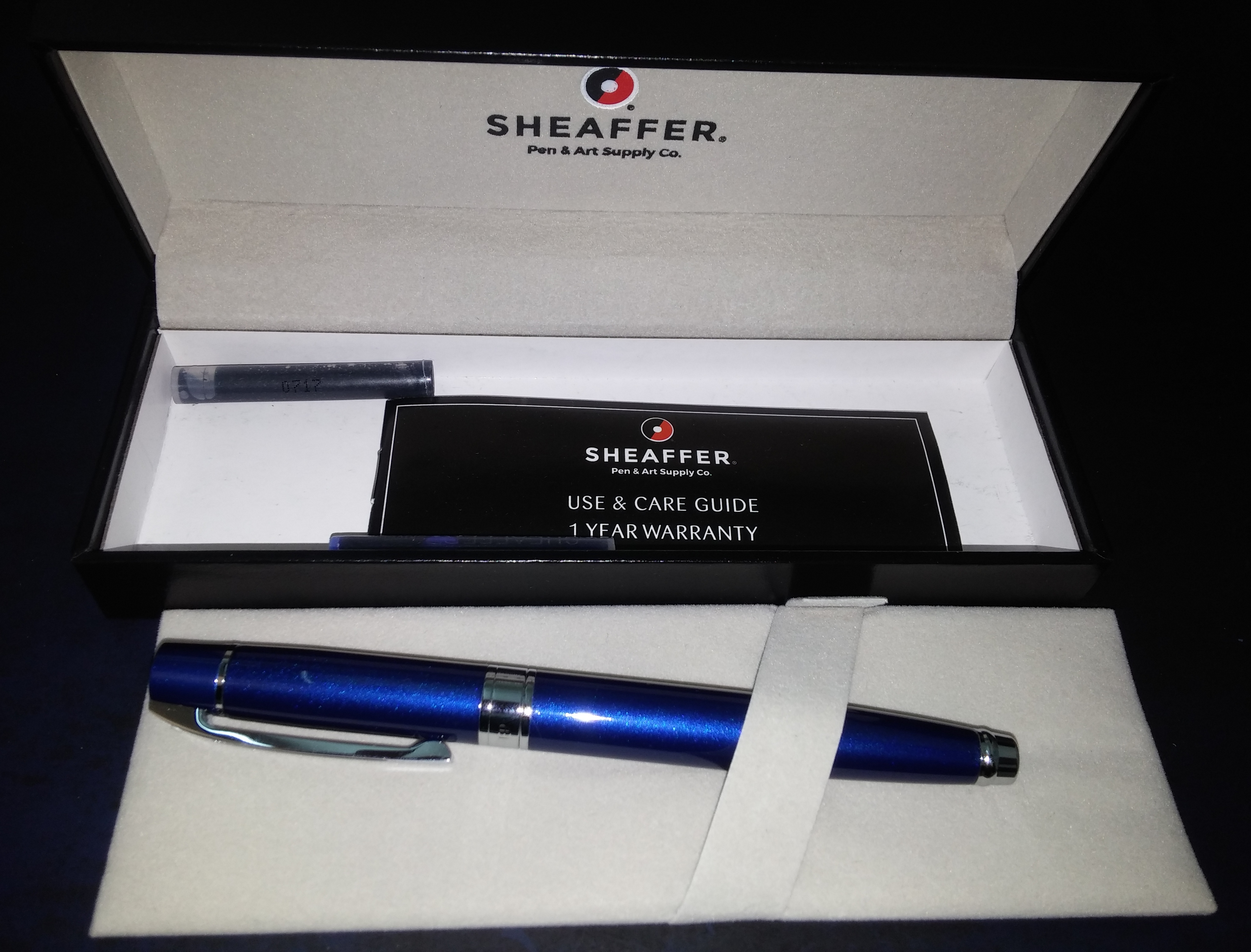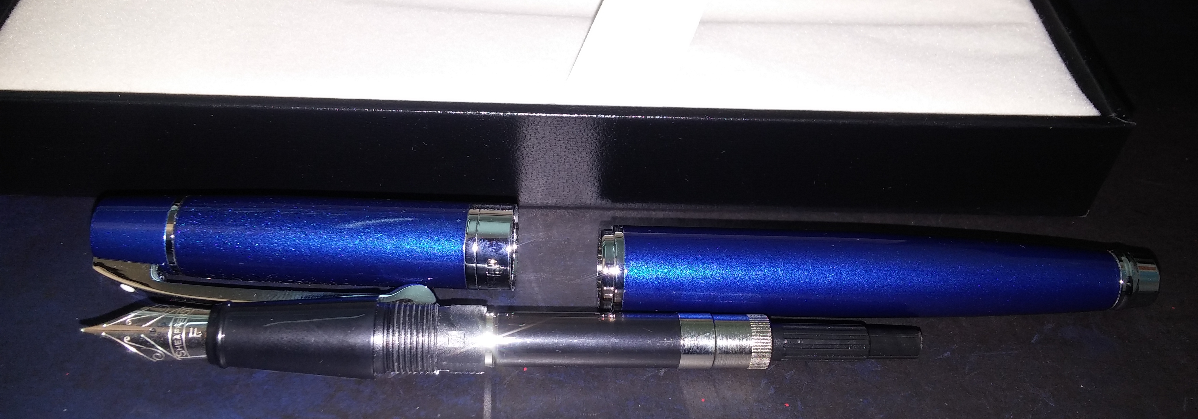 Arrivata, bella, solida e non ha neppure il problema segnalato da alcuni video cioè il flusso scarso. Come prima impressione positiva (hanno messo dentro pure due cartucce è un converter a vite). Certo, la Sheaffer di un tempo erano altra cosa ma...