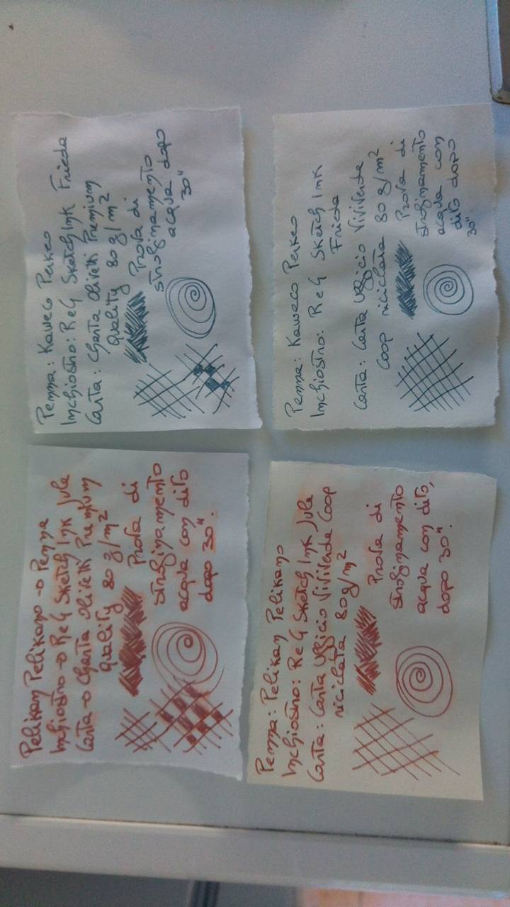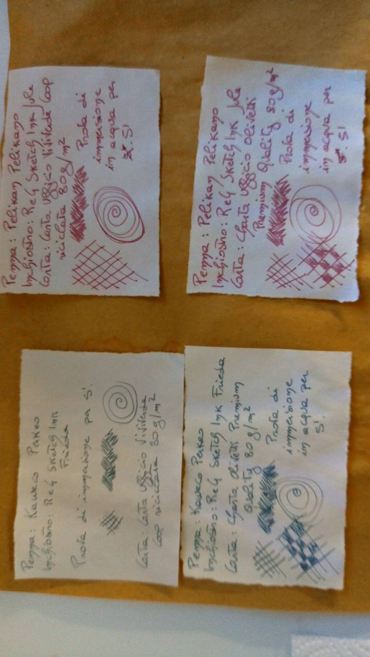 Non entro in merito alla colorazione o al comportamento vero e prorpio su carta: li ho da troppo poco tempo e non ho ancora le idee chiare, soprattutto perchè ho solo il termine d paragone con il Pelikan 4001 Royal Blue... Insomma non sarei affidabile. A me, al momento, interessano soprattutto la resistenza (poi se c'è anche un bel colore meglio), la poca pretesa nella sccelta delle penne stilografiche, la poca manutenzione di pennini e facilità e comodità d'uso. Guardando tra i negozi on-line, mi avevano colpiti questi due anche per il prezzo popolare. La prima cosa che ho potuto fare appena li ho avuti è stata quella di fare dei piccoli esperimenti di tenuta sulla carta.