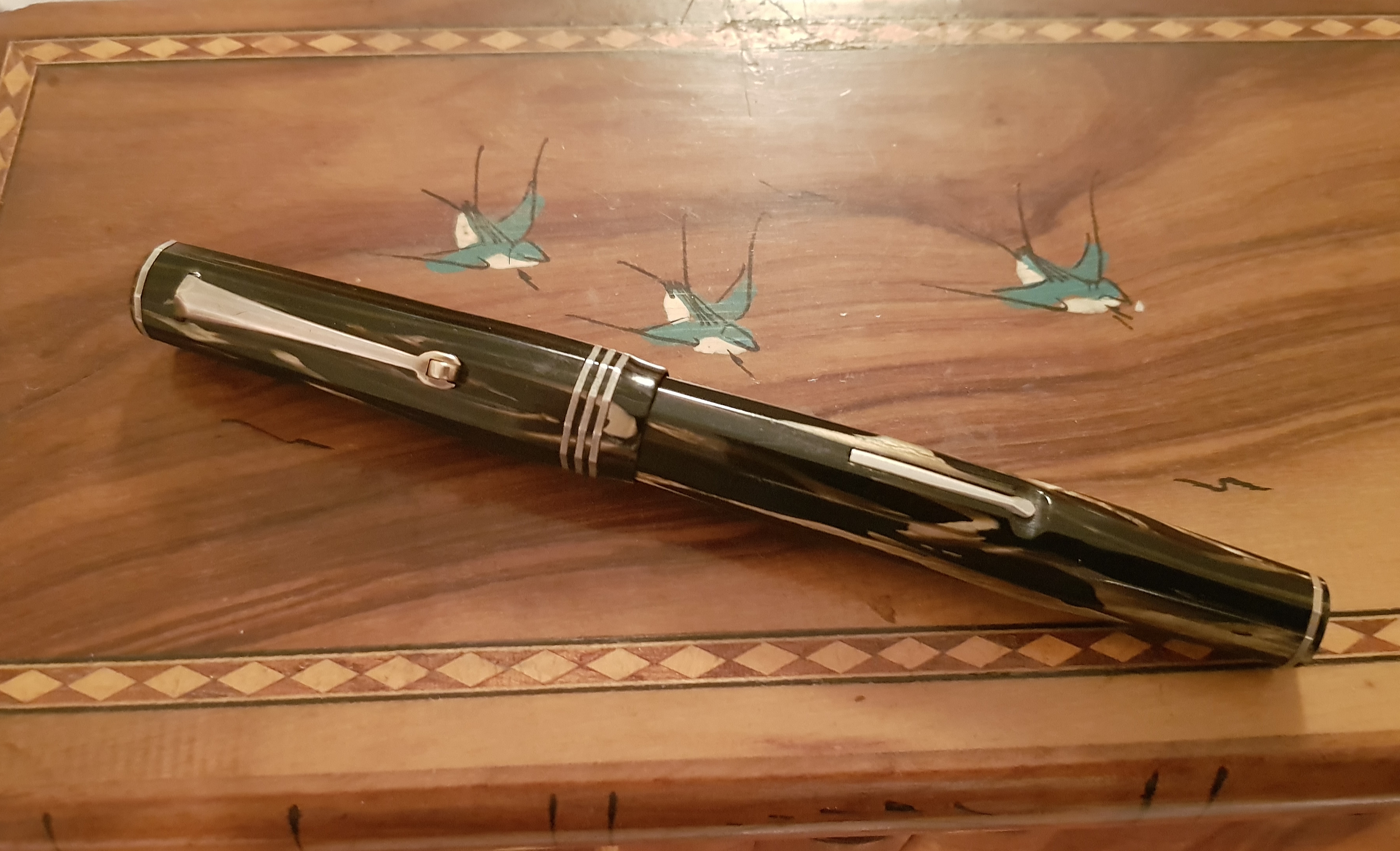 Questa serie era veramente di qualità sia costruttiva che estetica....cosa purtroppo a mio modesto avviso non riscontrabile nei modelli successivi. Per esempio.mi è capitata una bella Montegrappa misura grande anellata trasparente ma con meccanismo di carica twist e quindi con sacchetto interno...mi sono sempre chiesto che senso ha lasciare una trasparenza quando poi c'è il sacchetto. Mentre qui potremmo parlare solo di una scelta scellerata nel sistema di carica da abbinare al fusto in altri casi ho trovato i meccanismi poco affidabili....per non parlare di alcuni modelli fine anni 40 e inizio 50 veramente ingurdabili. Dispiace che un marchio italiano partito così bene sia poi andato a finire così miseramente!!