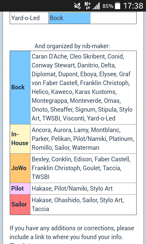Se può interessare, ho qui uno screenshot di una discussione (che non riesco più a trovare) su "the fountain pen network". È una tabella che mostra i principali produttori di pennini e le varie marche di stilo che li montano.