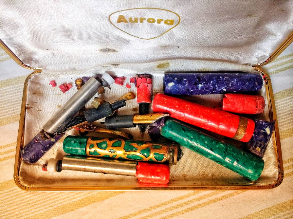 E prima o poi pubblicherò le foto di una Omas Celluloide faccettata (557F), blu (o forse verde) marmorizzata, che è stata sempre e solo nel cofanetto portapenne (OMAS, per giunta....), insieme ad altre sue sorelle, eppure tutte le altre sono tutte in buona salute mente "lei".... sigh sigh