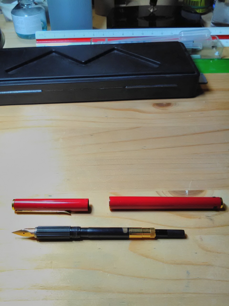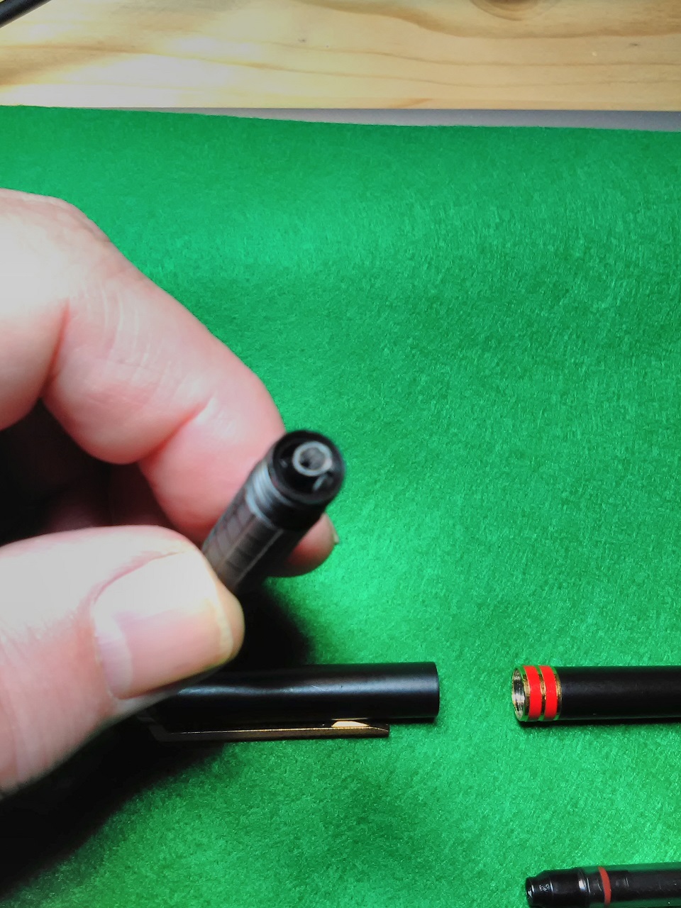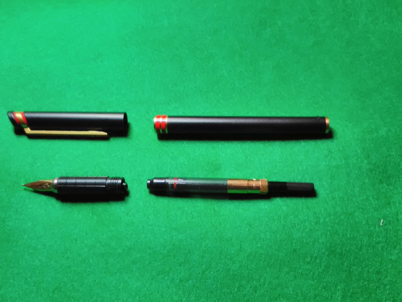 Non riesco a chiuderla perchè all'interno del fusto è stata inserita una cartuccia capovolta che,avendo lo stesso diametro del filetto,spontaneamente non esce.Probabilmente il precedente proprietario l'aveva inserita per premere su quella che era collegata al gruppo pennino e evitare così il distacco accidentale.Prima o dopo troverò il tempo e il sistema per estrarla.