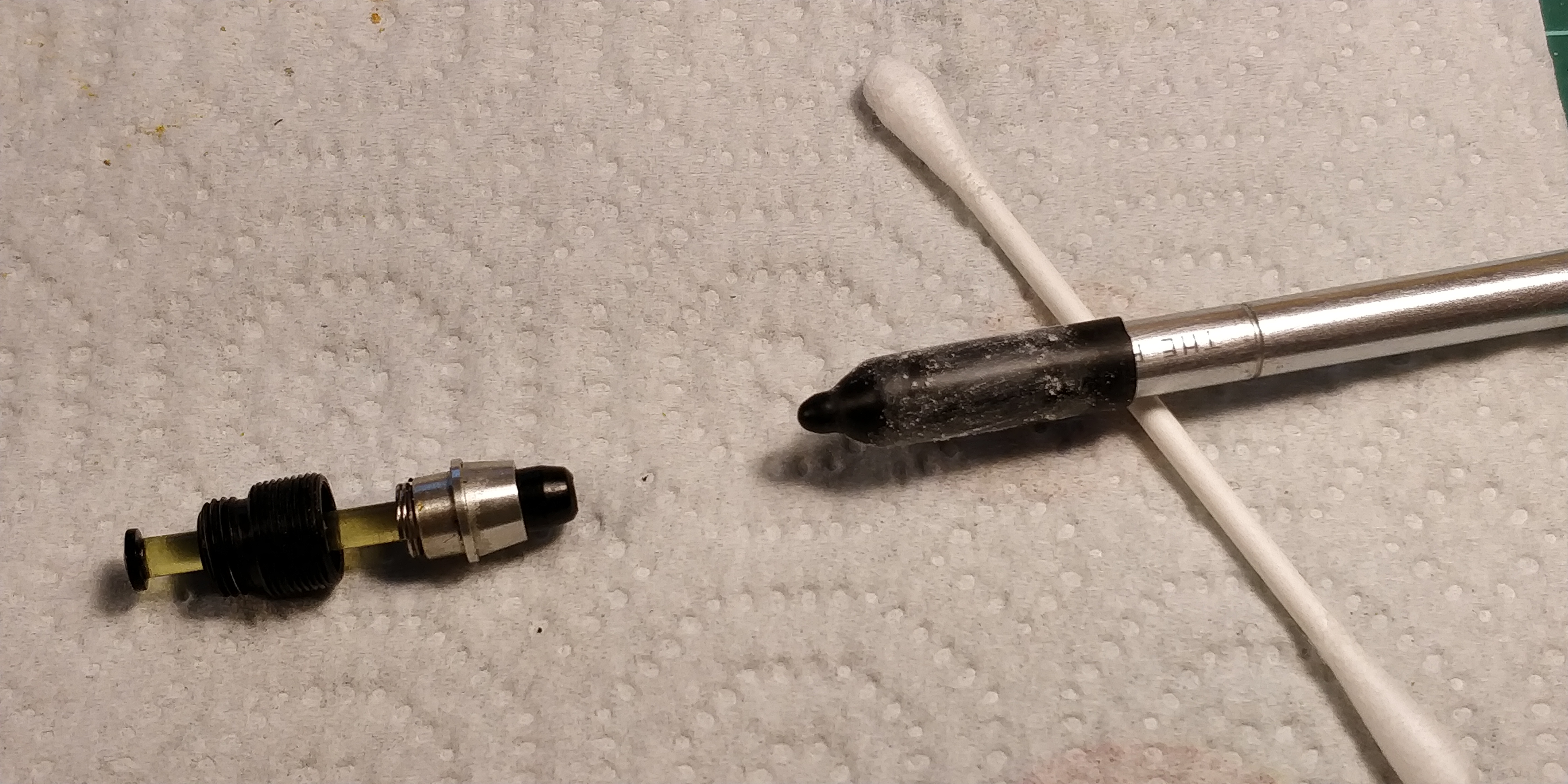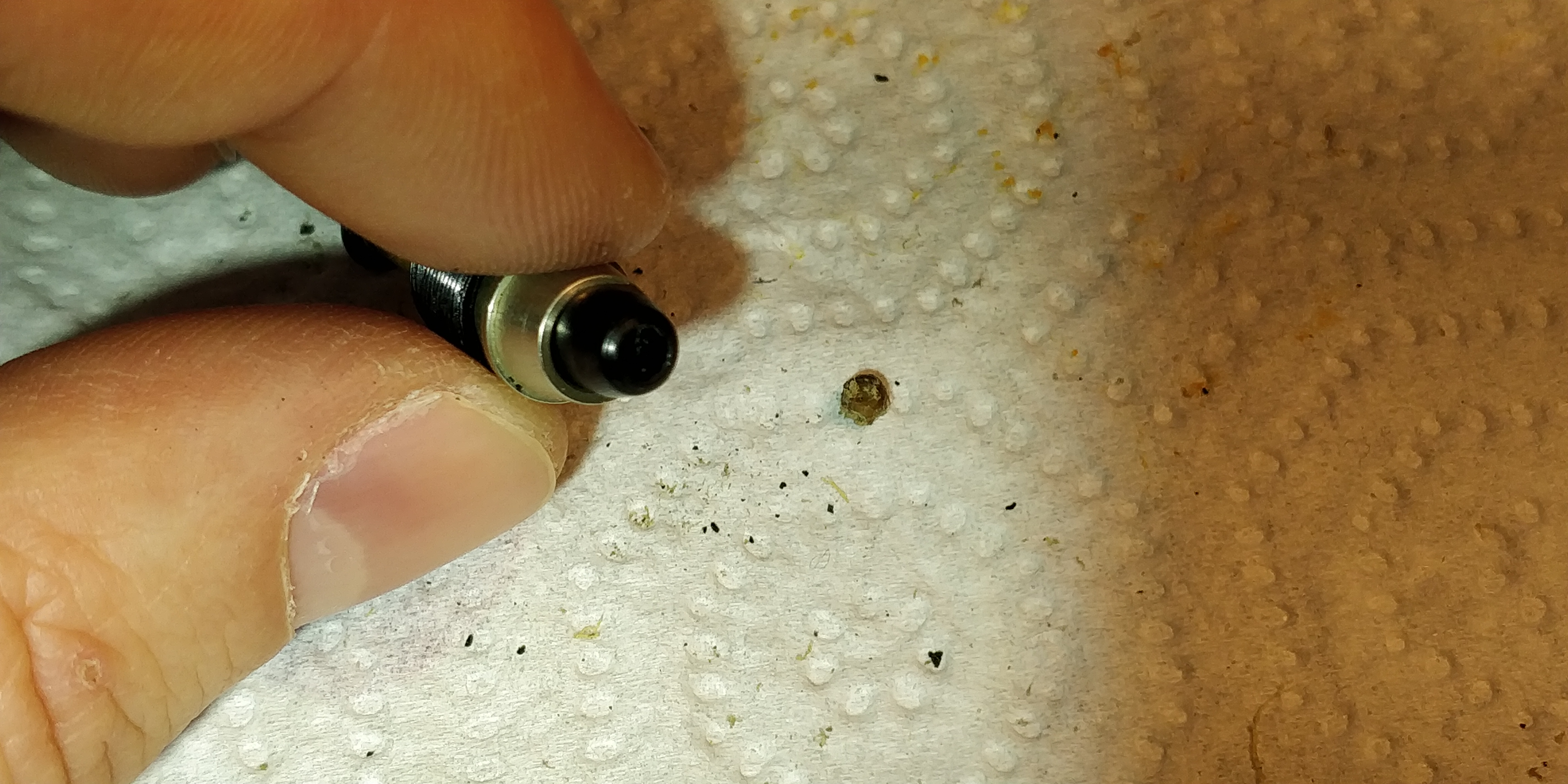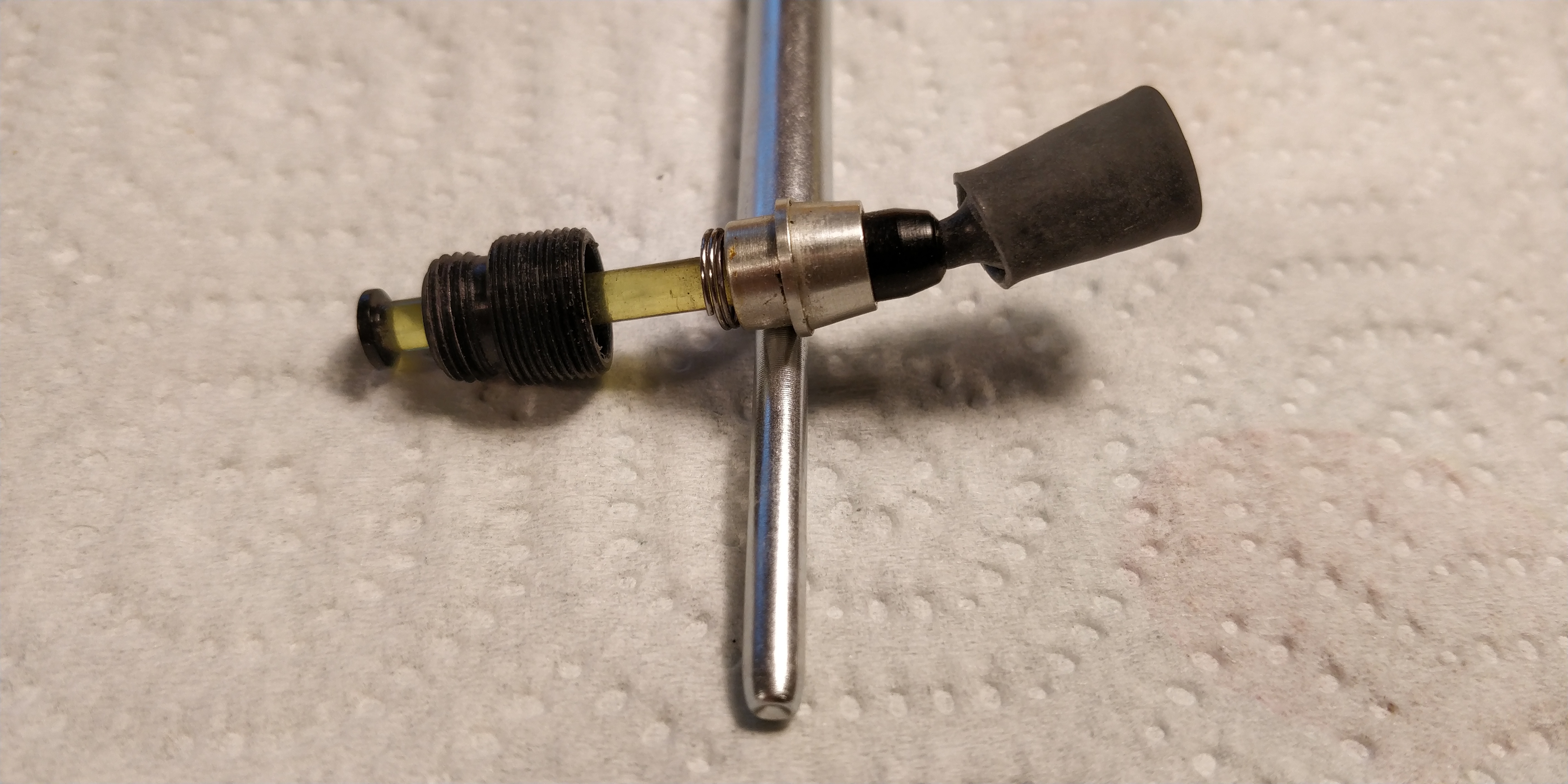 Con l'apposito estrattore ho poi rimosso la pompetta, aiutandomi con il "pellet pusher" per spingerlo fuori ed un paio di pinzette per togliere la gomma rimasta incastrata nel fusto