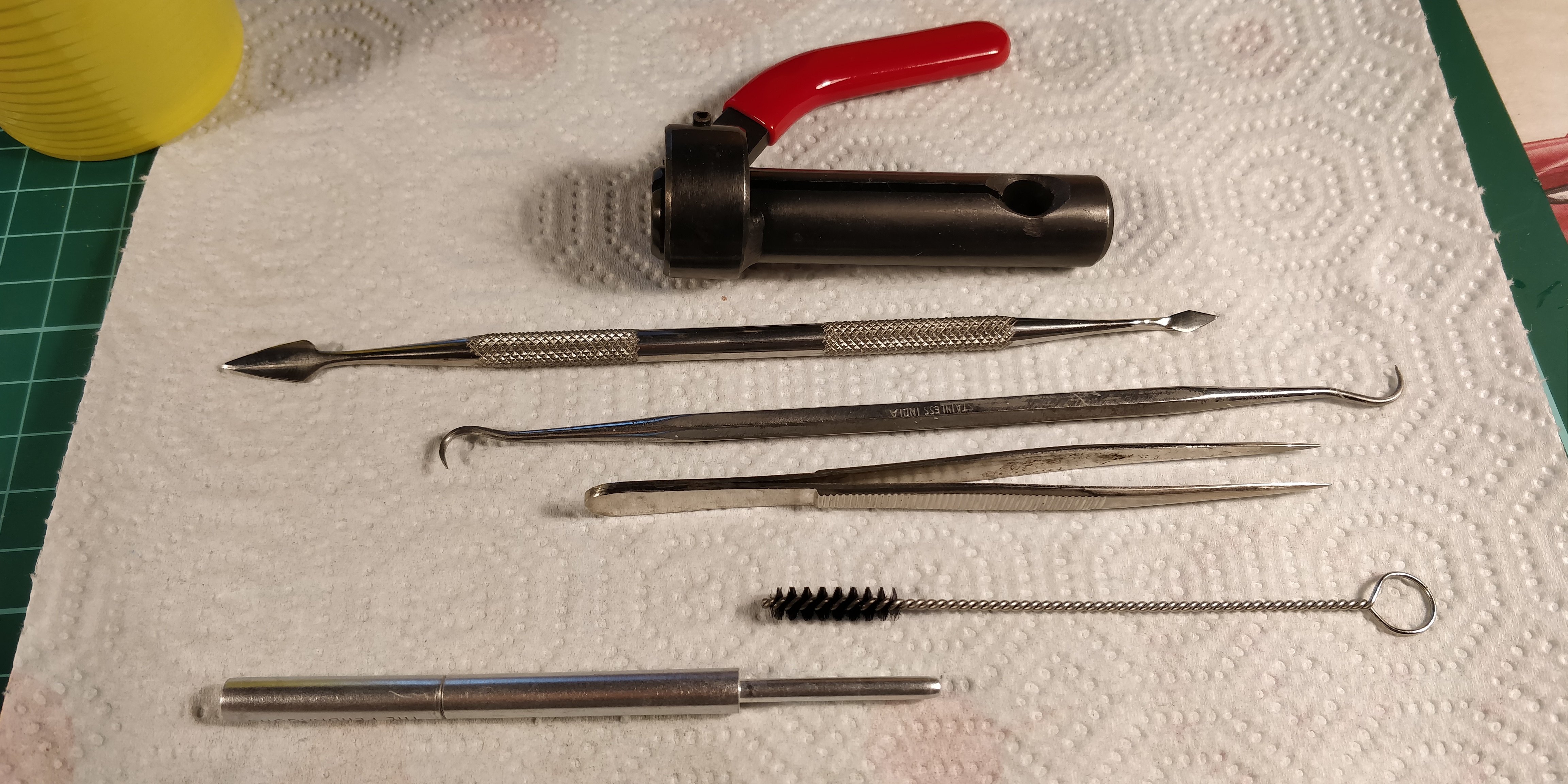 Una panoramica di tutti gli attrezzini usati per il lavoro, escluso il minitrapano ed i consumabili (talco e grasso siliconico)