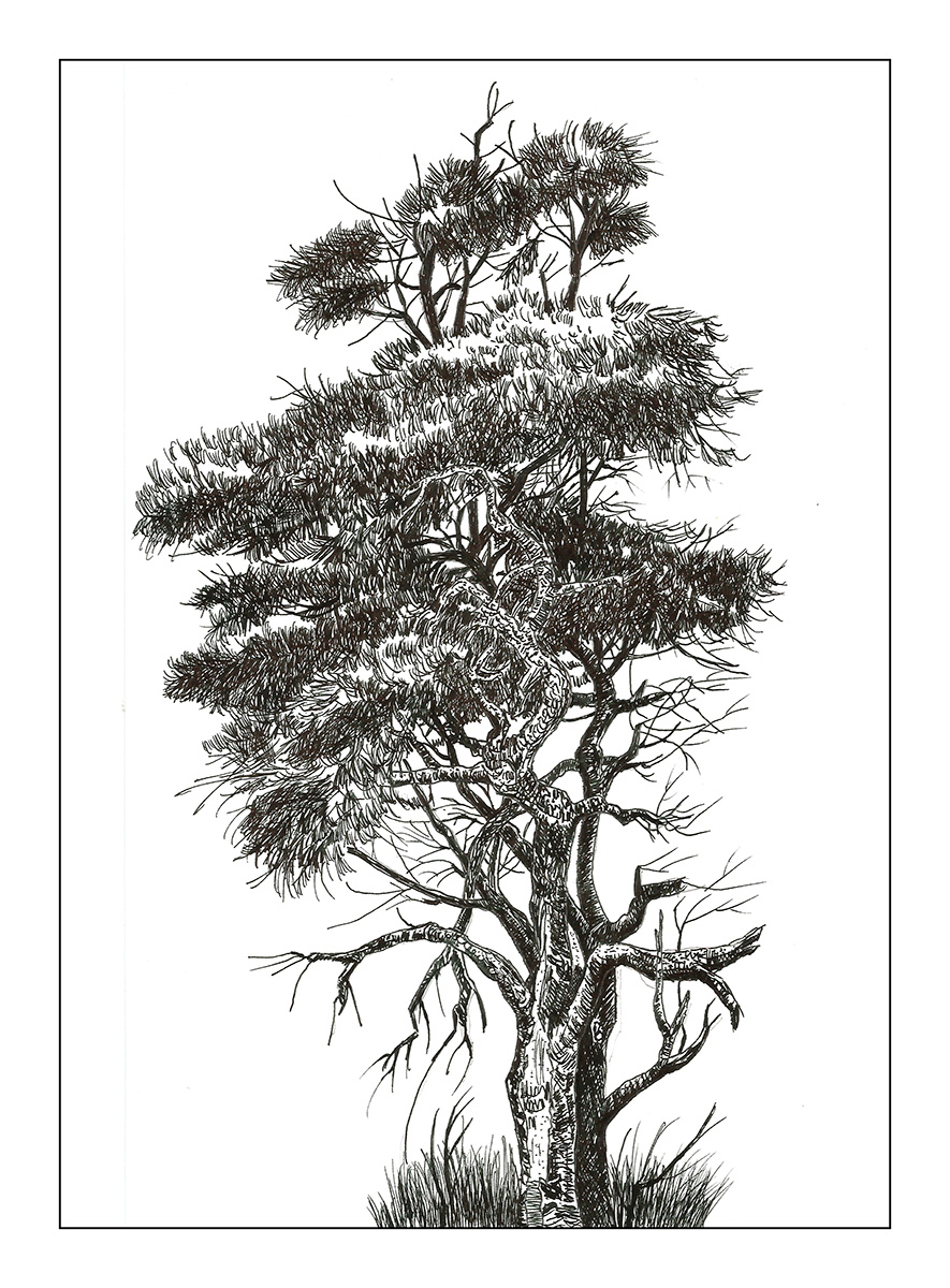 Per la prova della penna ho scelto il disegno di una conifera, la presenza di foglie aghiformi e quella di alcuni rami periferici completamente spogli, mi ha permesso di provare il pennino sia in posizione soft (per la maggior parte del disegno) sia in posizione hard (alcuni particolari).