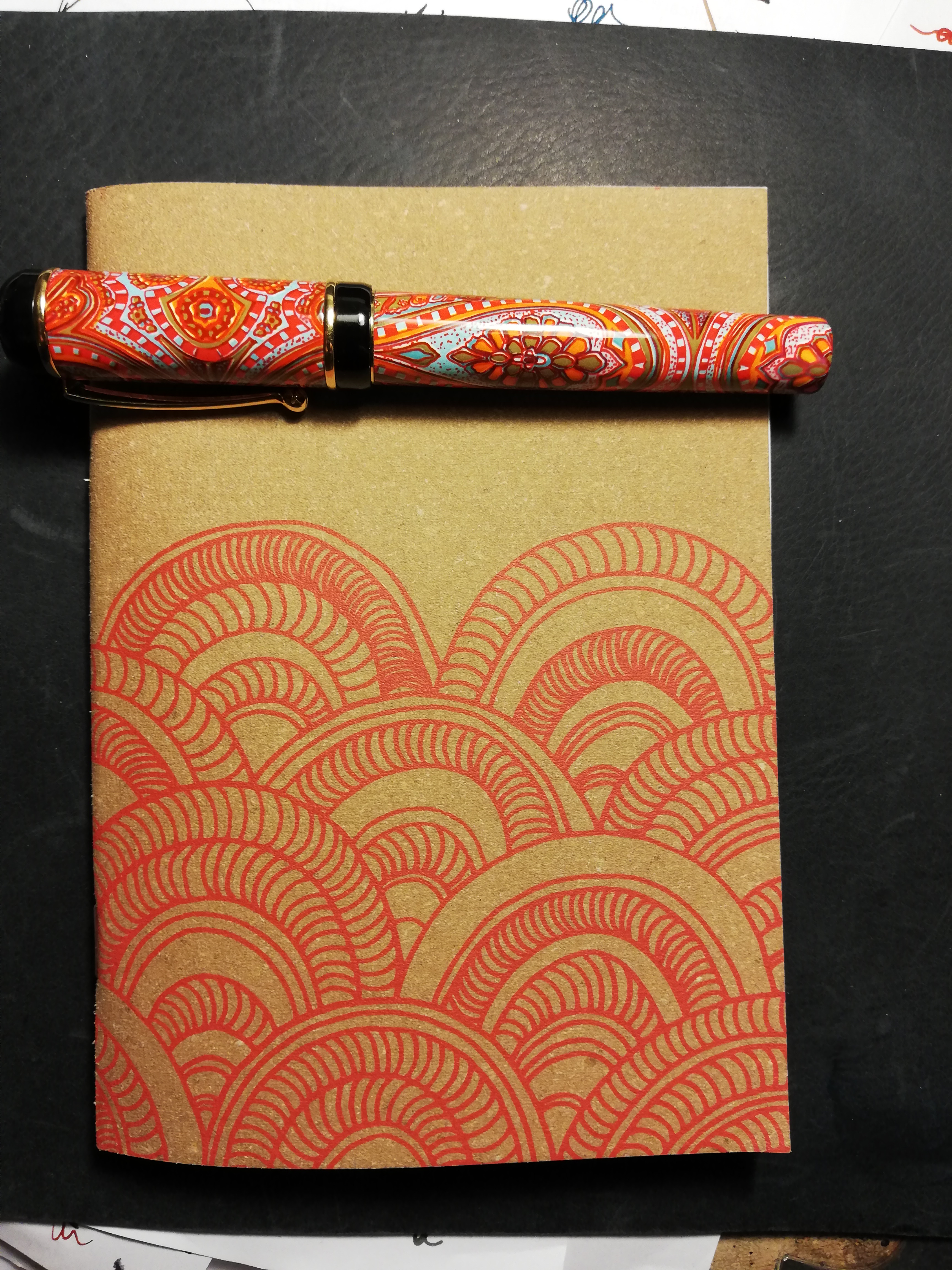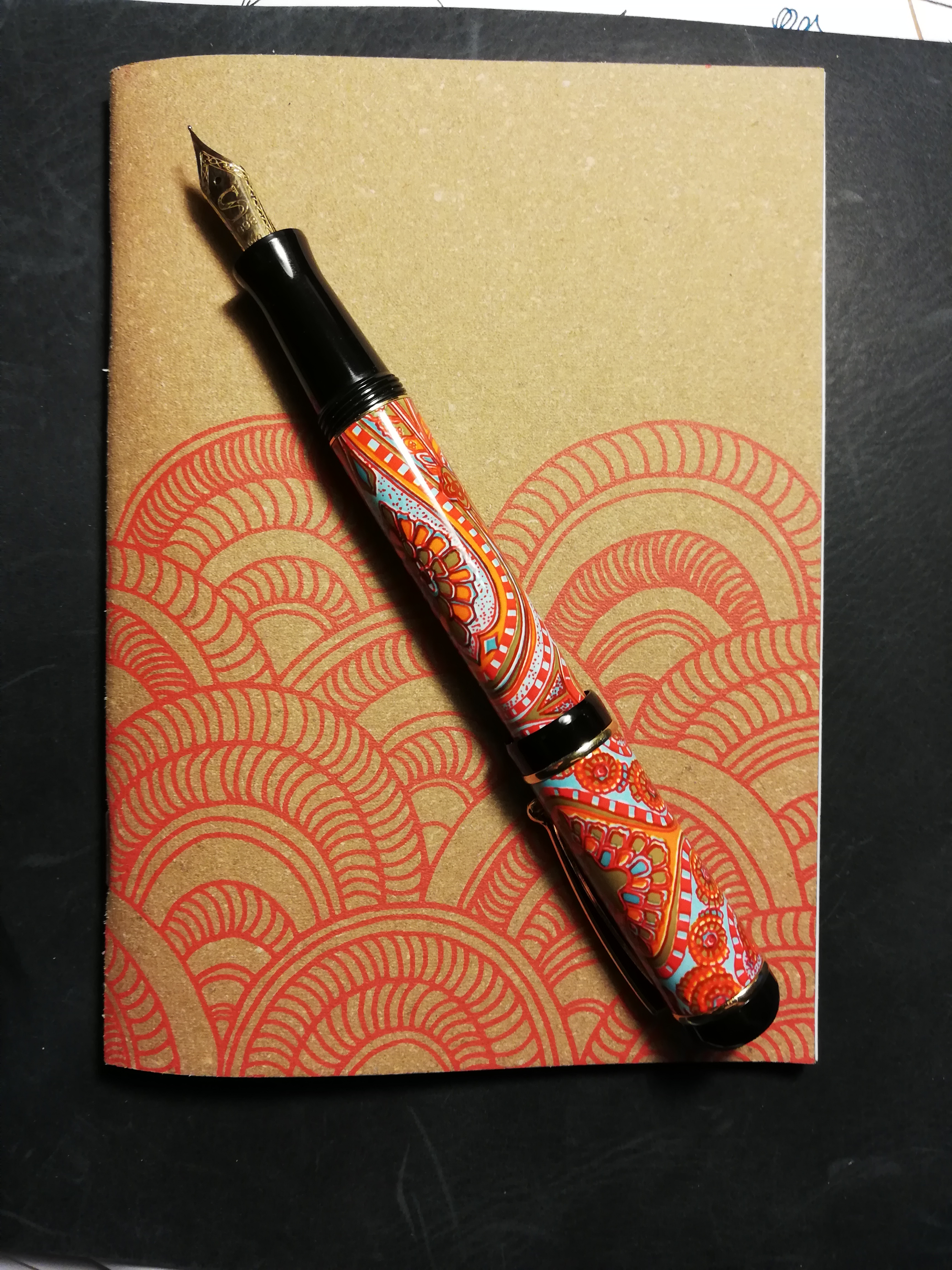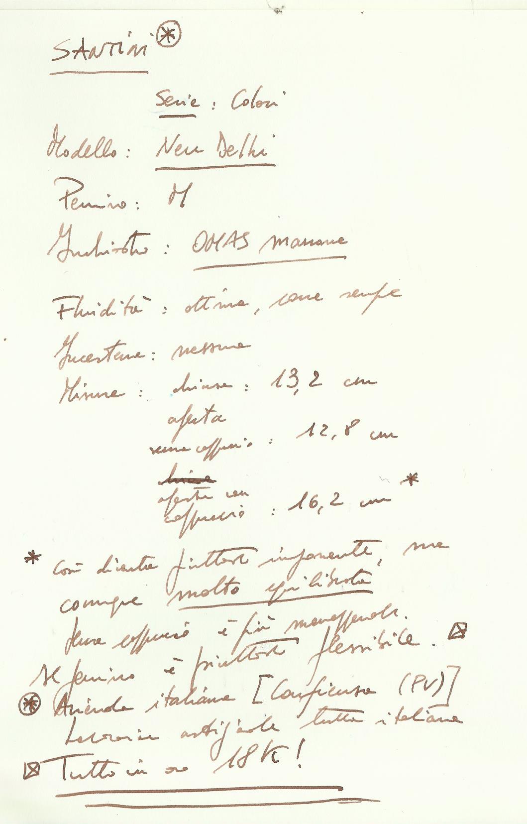 E' il terzo Natale consecutivo che Babbo Natale arriva con una penna marca Santini, la ditta tutta italiana di penne della provincia pavese. Le due precedenti sono già qui recensite. QUesta appartiene sempre alla serie COLORI ed il modello si chiama NEW DELHI. La forma è classica, con le estremità piatte e il fermaglio a goccia. La penna è massiccia. Il fusto ed il cappuccio sono in metallo. Il portapennino è in plastica con converter in dotazione. La chiusura a vite è rinforzata da una guarnizione. Il punto di forza della penna è il pennino di produzione propria a 18 k. Questo è un medio con il tratto non troppo marcato e piuttosto flessibile. I due pennini delle altre penne, sempre di tratto M, hanno un flusso lievemente più copioso. La scrittura è piacevolissima e morbida, senza incertezze. Le misure sono descritte nell'immagine allegata. Per lunghe sessioni di scrittura utilizzo la penna senza cappuccio, ma anche se indossato la penna è molto equilibrata.