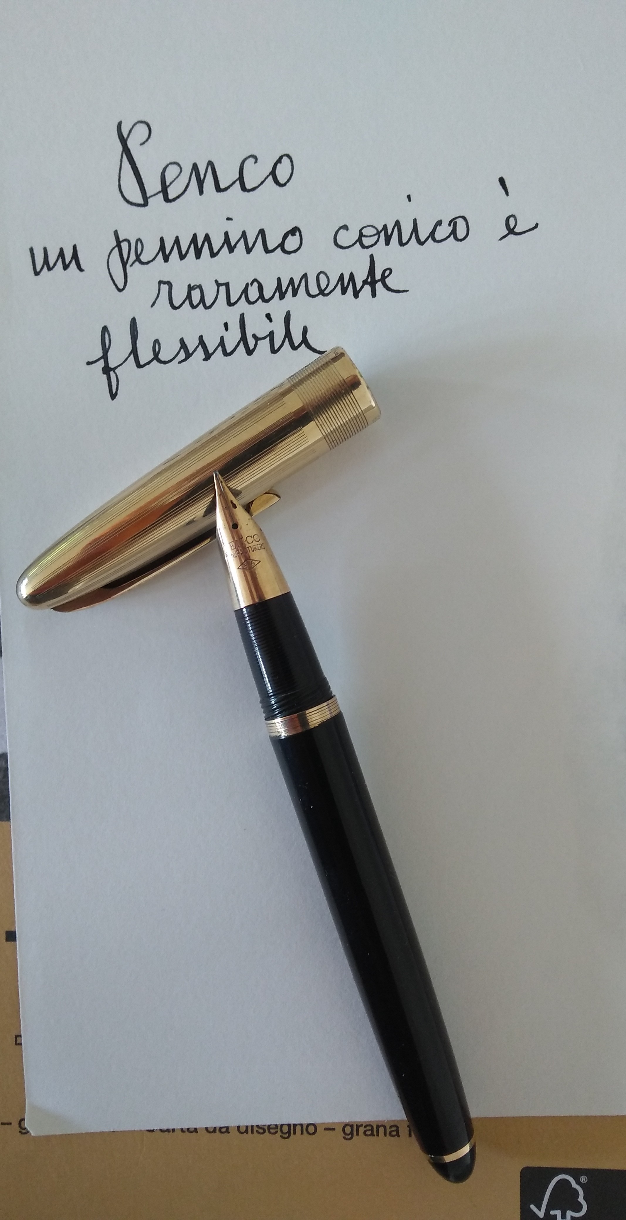 Siccome se n'era parlato, ho recuperato la penco 53 che mio cognato mi ha regalato a Natale e l'ho finalmente caricata. Ha un bellissimo pennino conico, con la peculiarità si una certa flessibilità. Non ci si potrebbe scrivere il copperplate, ma è il primo pennino conico che provo che non sia rigidissimo.
