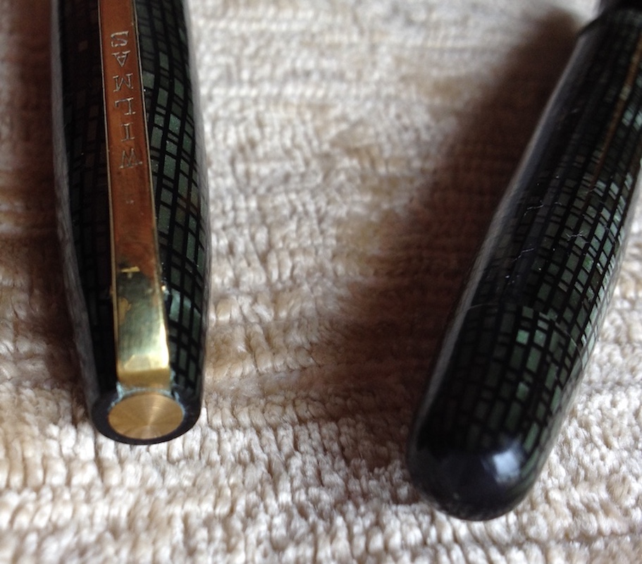 Acquistata nella baia da un noto e simpatico pennaio friulano, questa Wilmas anni '40 ha un'affascinante finitura tipo pelle di lucertola. Lunga 12,7 cm, con fusto del diametro di 12 mm, pesa 16 gr. senza inchiostro. Caricamento a bottone, pennino flessibile Wilmas extra iridium n°8 dorato. Della Wilmas sappiamo ancora poco se non che il fondatore Angelo Rosso, astigiano, depositò il marchio nel 1946.