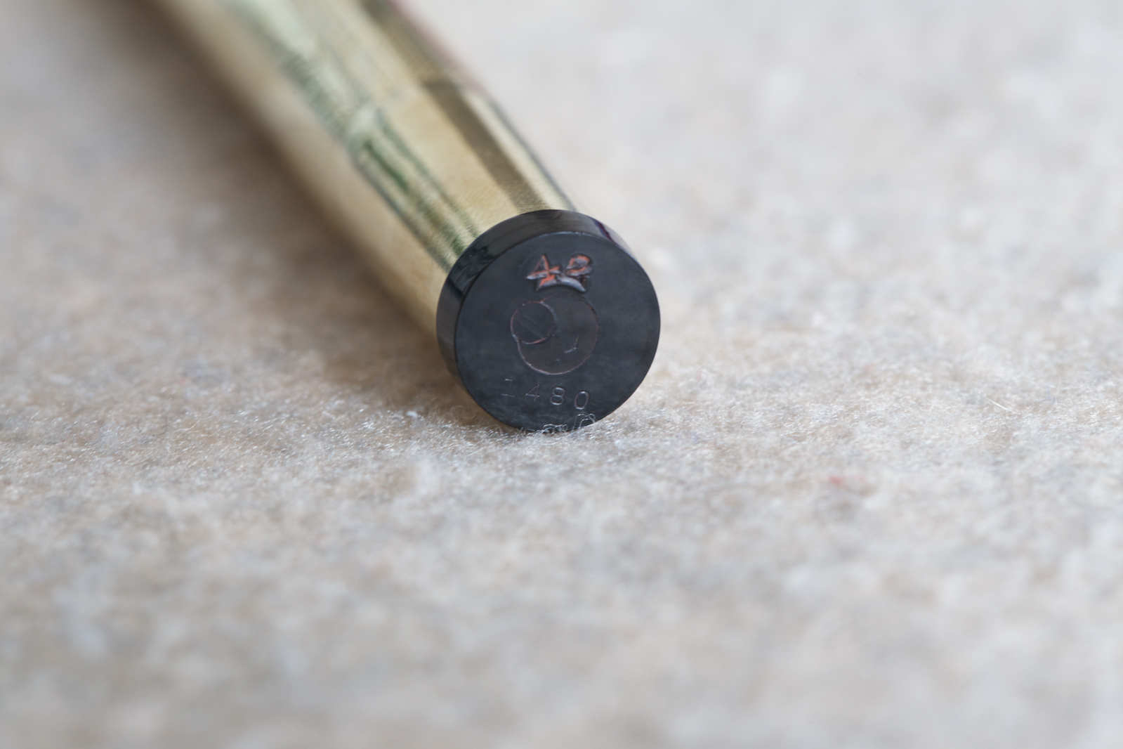 La penna stilografica è punzonata C. WG. , punzone che identifica Carlo Weingrill della ditta orafa Weingrill tuttora esistente ed operante a Milano dal lontano 1879. Sul fondello appare anche un numero che penso sia un numero che identifica le penne prodotte dal laboratorio orafo.