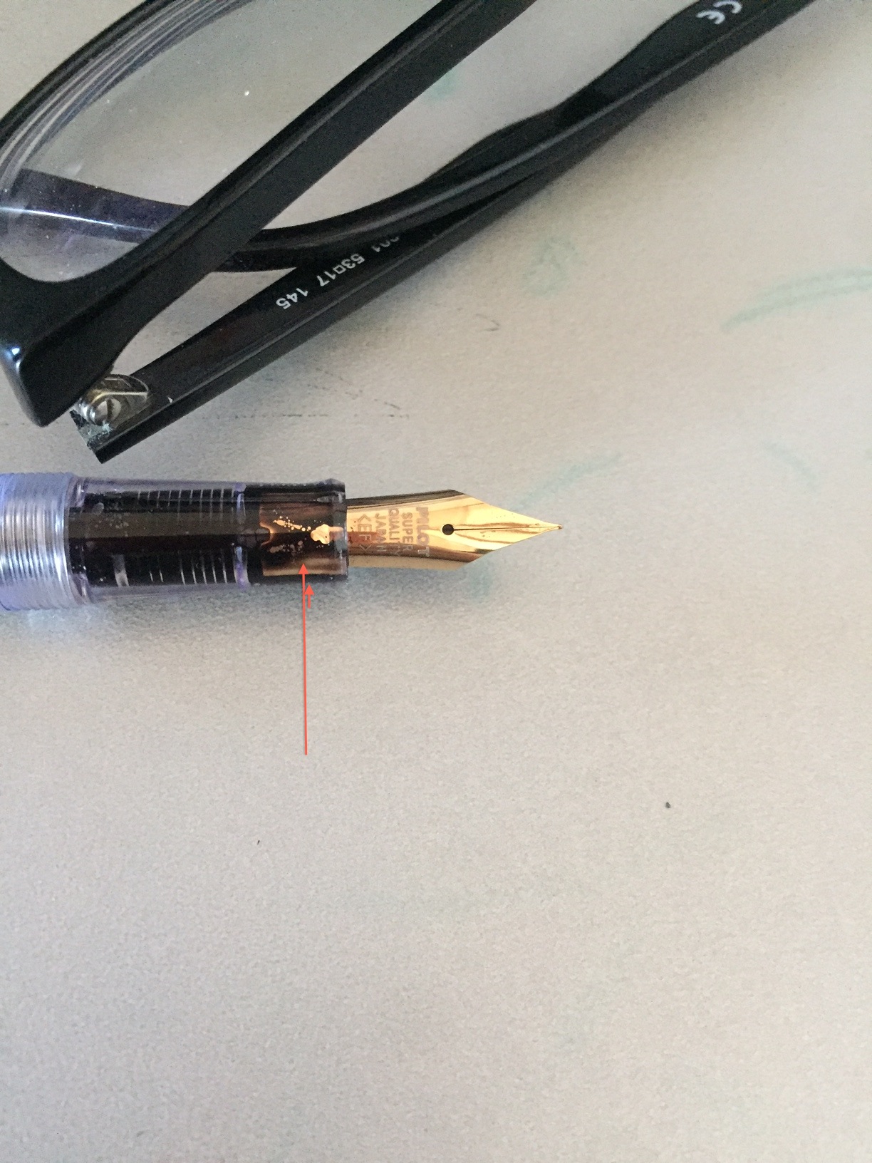 vi posto una foto della mia penna non bene identificata, che dopo una ripulitina e un refill mi ha dato questo problema, una gocciolona di inchiostro che fuoriescedalla parte inferiore del pennino.