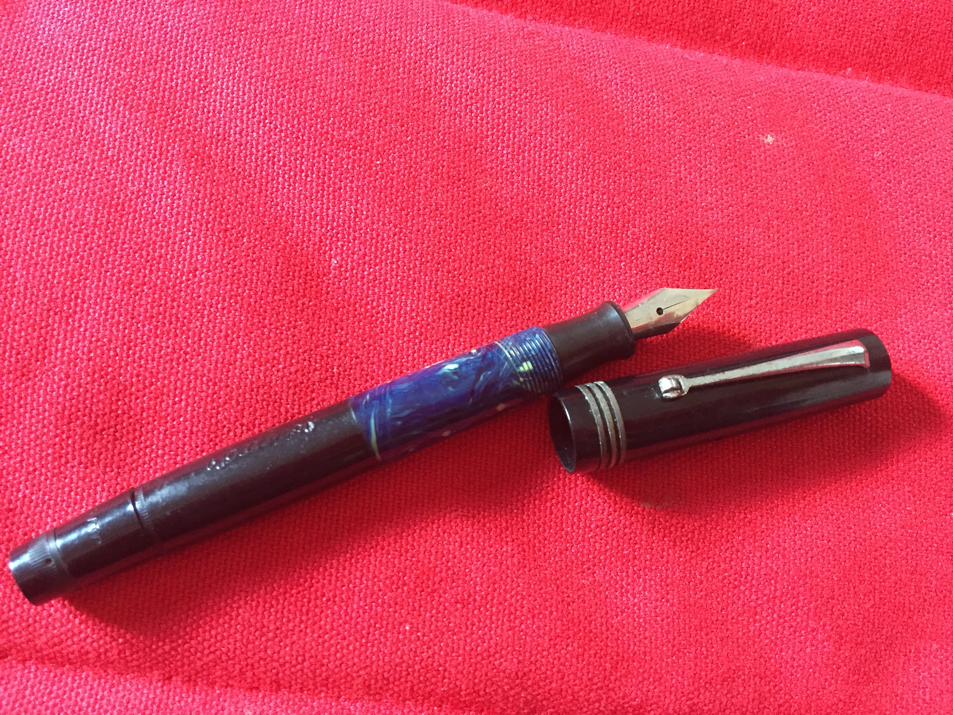 Trattasi di Elmo/Montegrappa anni '40 o '50, è nata così, in quell'epoca probabilmente la celluloide colorata era o molto cara o di difficile reperibilità, quindi si tendeva, parliamo di marche minori, ad utilizzarne solo piccole porzioni per risparmiare,