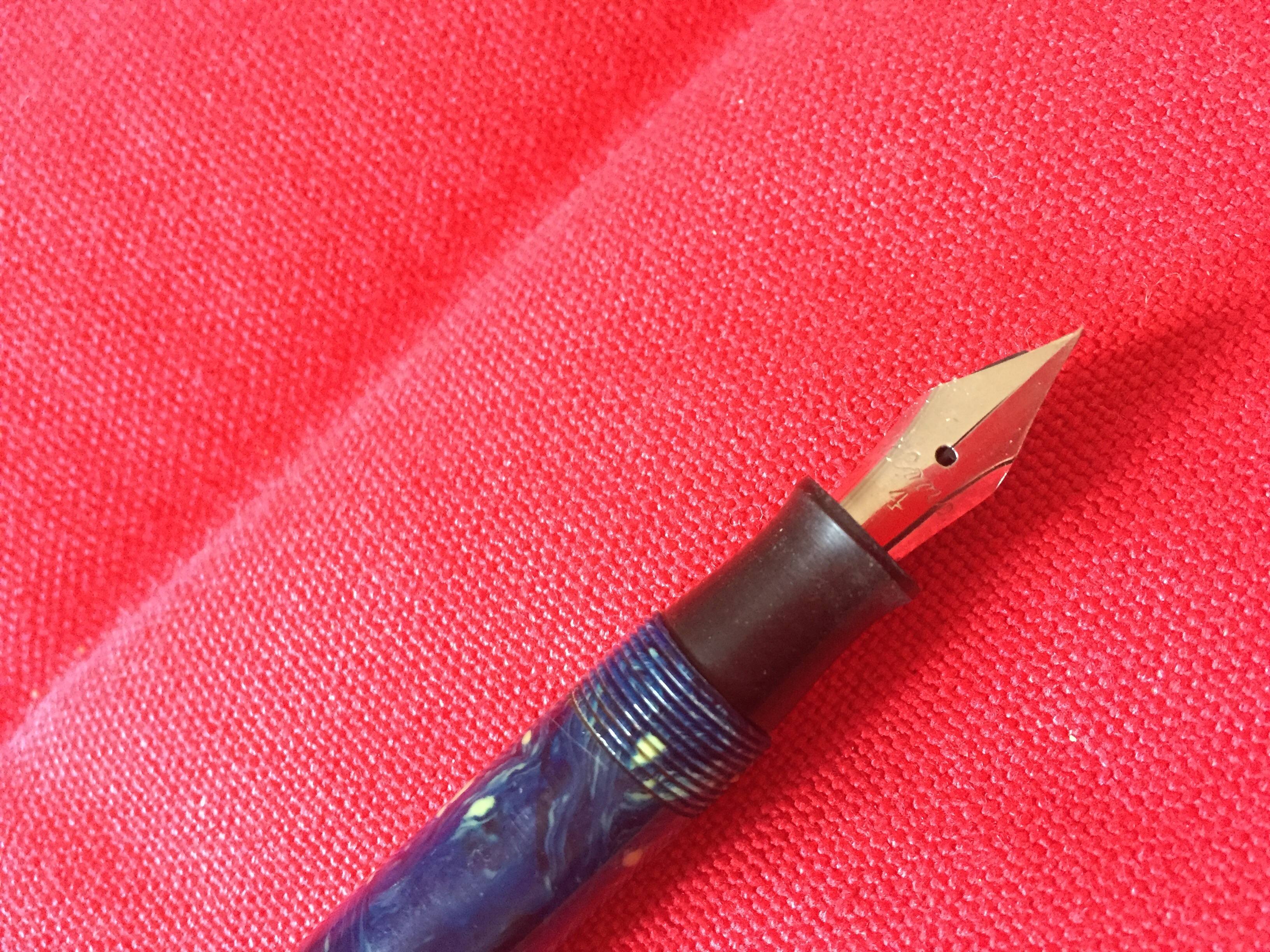 Ciao DrJekill, complimenti per la penna! Avevo visto anche io questa penna sulla baia, e aveva interessato pure me. Mi sembra strano l'accostamento della parte nera per il meccanismo del pistone con una sezione in celluloide (o ebanite colorata). Questo tipo di penna (con caricamento a stantuffo) solitamente al posto della sezione blu come nella tua, avevano una lunga finestra di ispezione per il livello di inchiostro, perciò quella parte era solitamente trasparente con differenti texture (a spirale, a ragnatela, a spina di pesce...). Io possiedo cinque Zemax in celluloide nera e trasparente a stantuffo con una struttura molto simile alla tua, tre delle quali hanno gravi problemi di cristallizzazione della parte trasparente. Perciò quello che penso a proposito della tua penna è che la celluloide trasparente si sia cristallizzata e sia stata sostituita con una sezione di una penna a pulsante di fondo, adattata e incollata per riavere una penna integra. Queste sono solo supposizioni, rimane comunque una stupenda penna di marca (Elmo era la vecchia Montegrappa) di parecchi anni fa. Ti auguro vivamente di poterla ripristinare al meglio! Ancora complimenti e buona giornata!