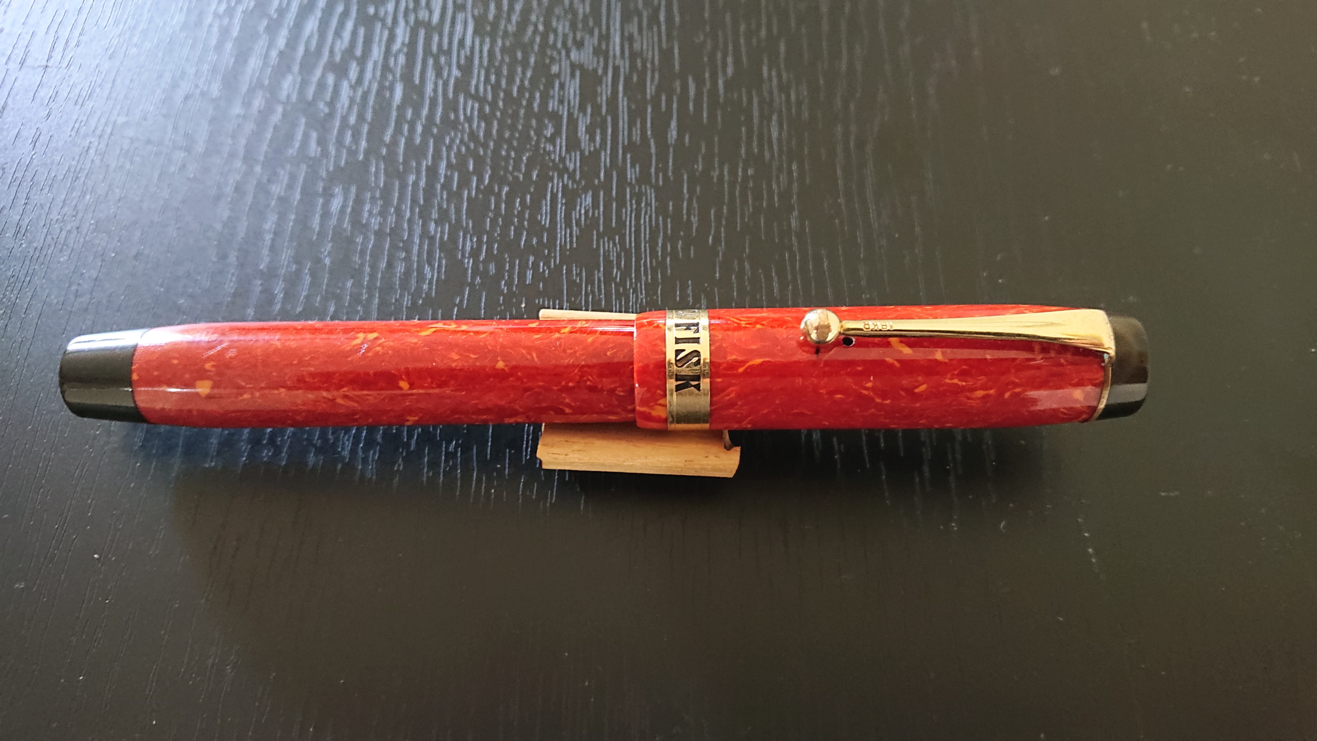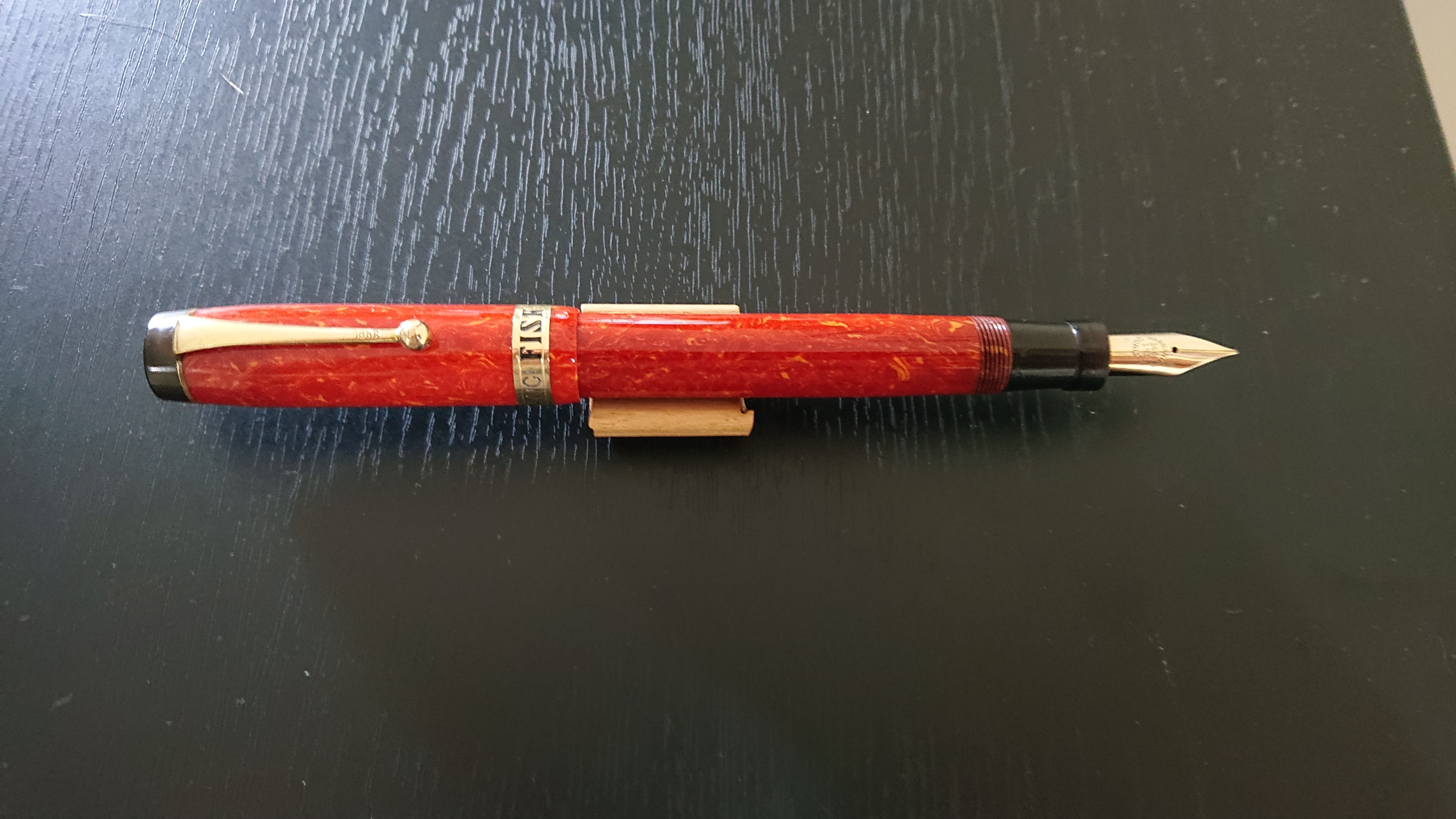 Colore rosso corallo, pennino Warranted 1st quality. Pubblicità "Pneumatici FISK" sull'anello del cappuccio.