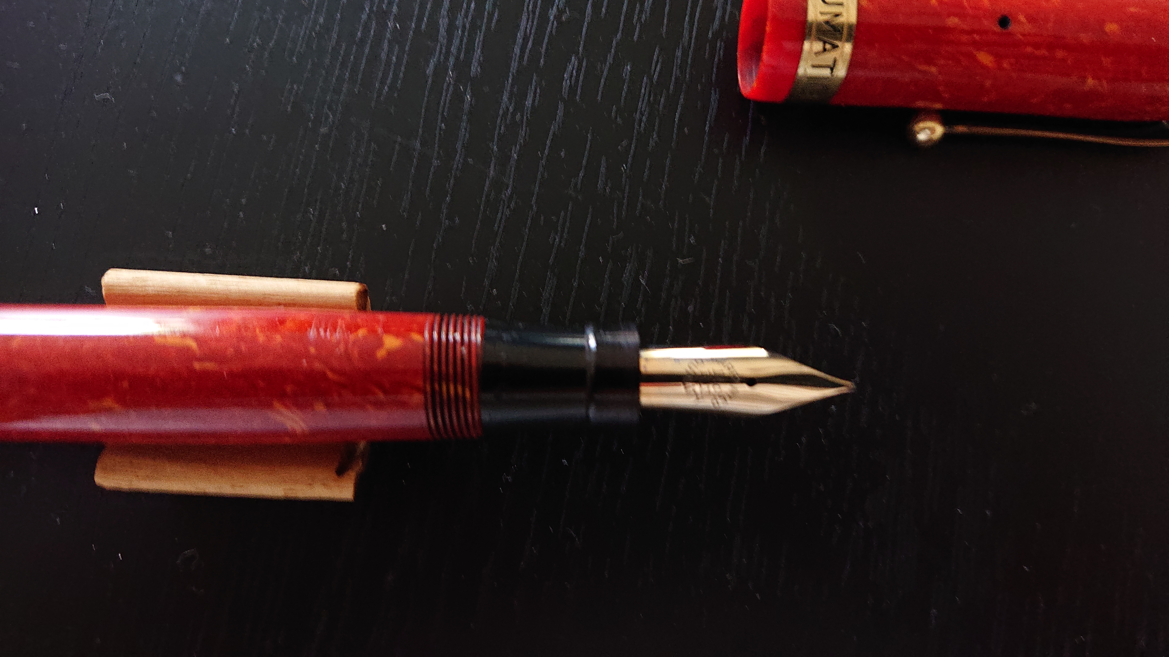 Puoi mettere una foto nitida del pennino? Da quel po' che si vede ha una scritta tonda che se ricordo bene si vede spesso sulle penne della Lang, ma si vede male e potrei sbagliare (e la cosa comunque non sarebbe conclusiva).