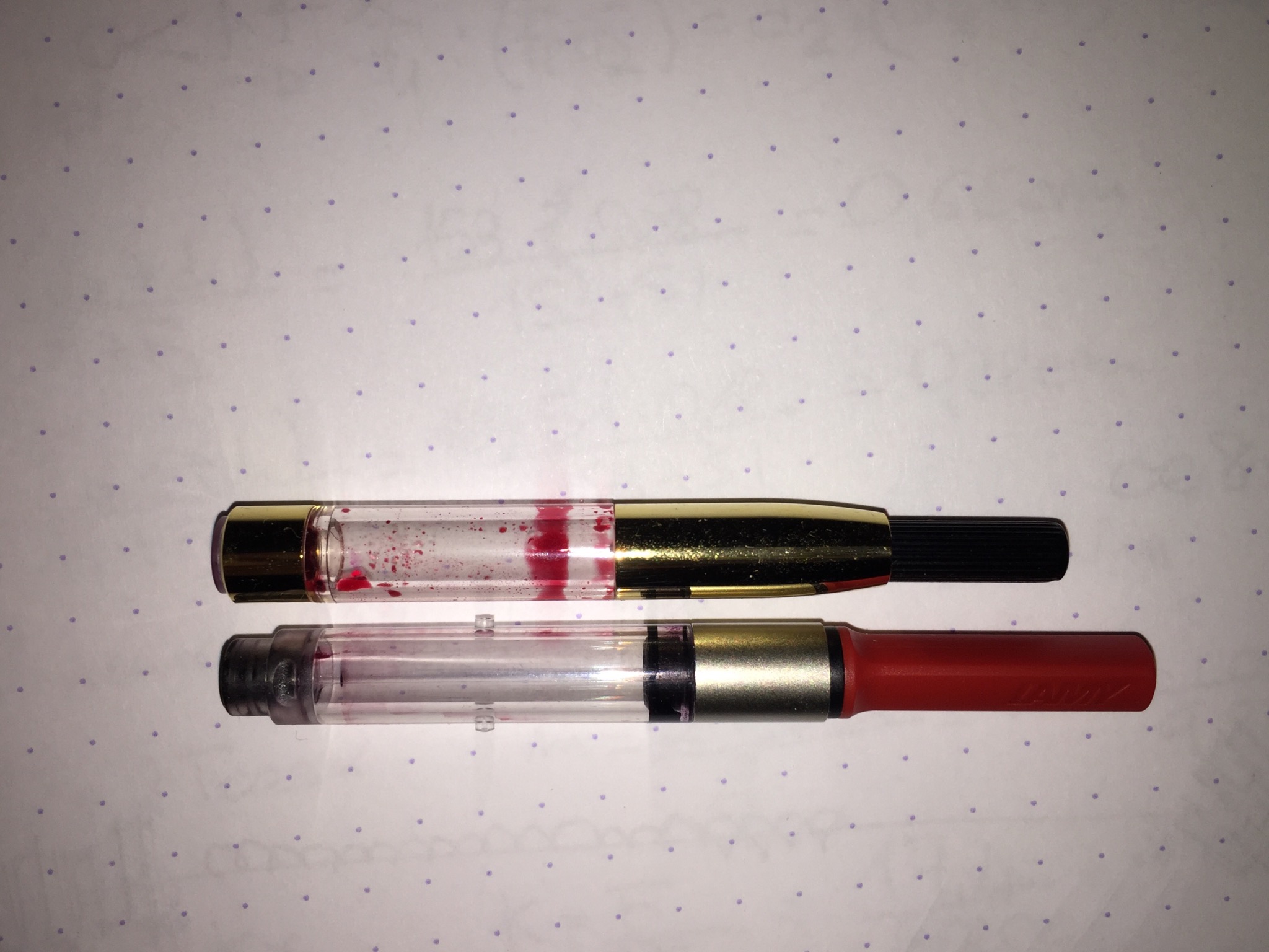 Penso che sia un filo meno capiente del Lamy, ma molto simili. Il pistone del Lamy è visibile, quello del Platinum è nella parte oro: