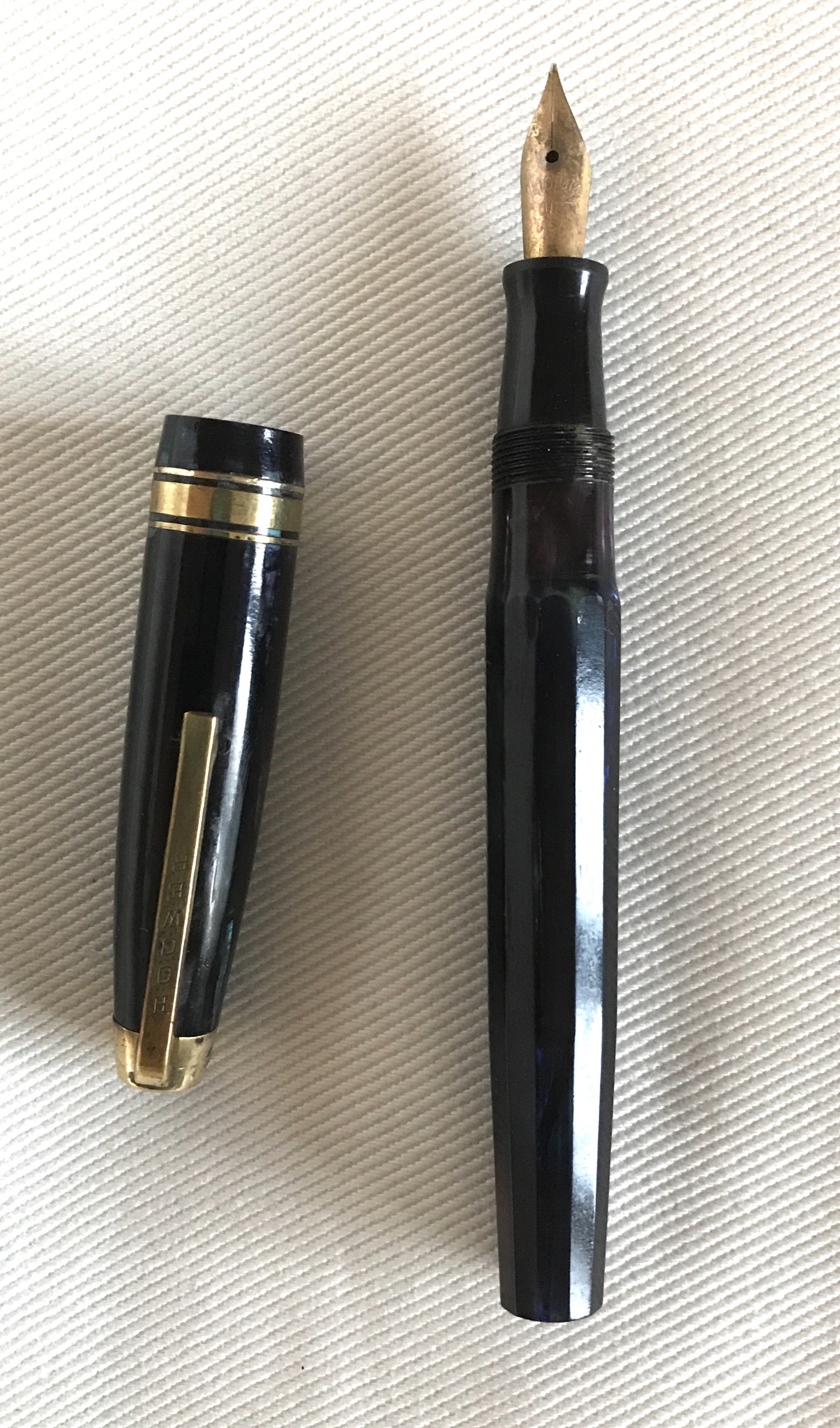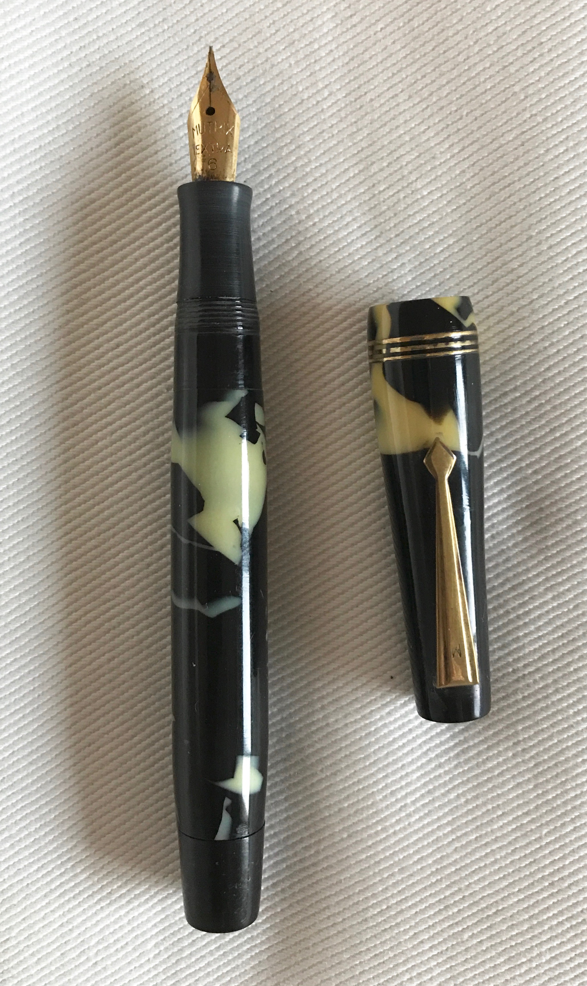 Stavolta chiedo se qualcuno può identificare questa penna, caricamento a pulsante, solo "M" inciso sul fusto e sul fermaglio, sul pennino è inciso "Mutrix extra 6". Italiana 1935-40???
