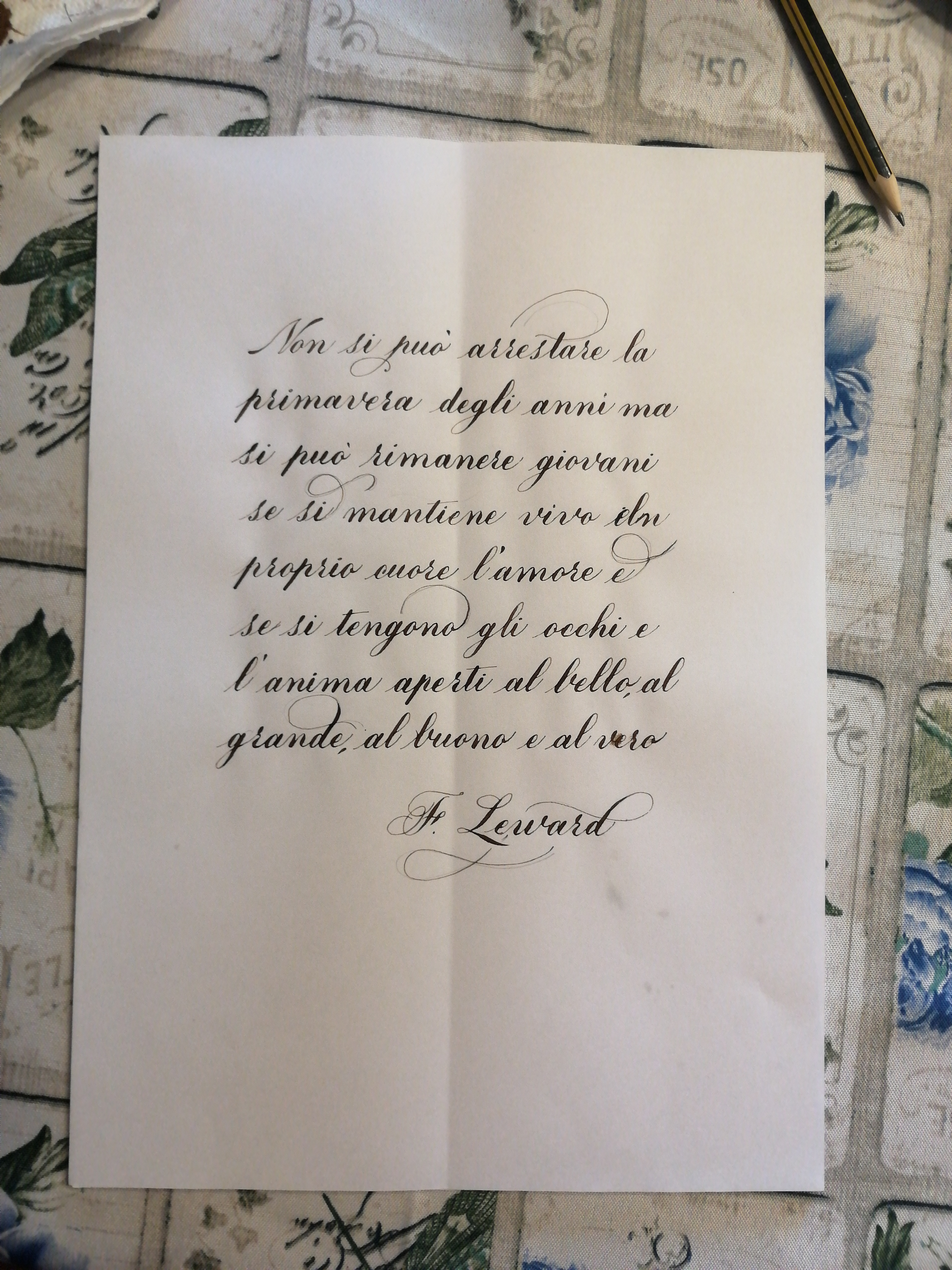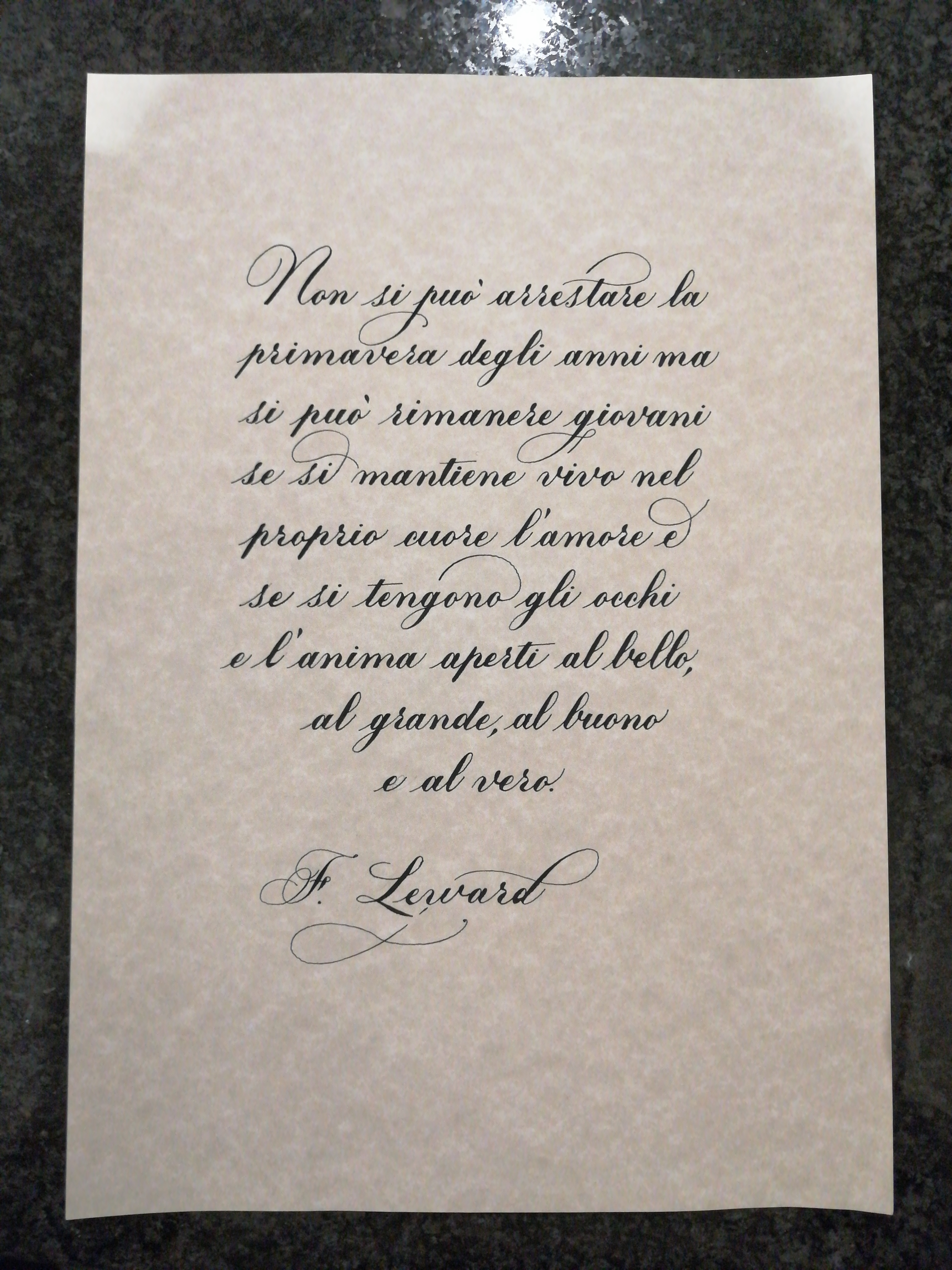 - distribuire il testo delle ultime due righe in diverso modo: dopo "bello," andare a capo, scrivendo nella riga "al grande, al buono" e ancora a capo scrive "e al vero."; le ultime due righe che vanno così restringendosi, puoi tenerle centrate e centrare, eventualmente, anche il nome dell'autore. La riga aggiunta non credo provochi la necessità di modifica dei margini sup. e inf. perché, di fatto, la quantità di parte scritta non varia e di conseguenza l' "aria" intorno, anzi potrebbe risultare più "leggiadra" (da provare per verifica). L'effetto di queste ultime righe può anche darti una diversa opportunità per inserire eventuali forme, svolazzi, ornamenti.